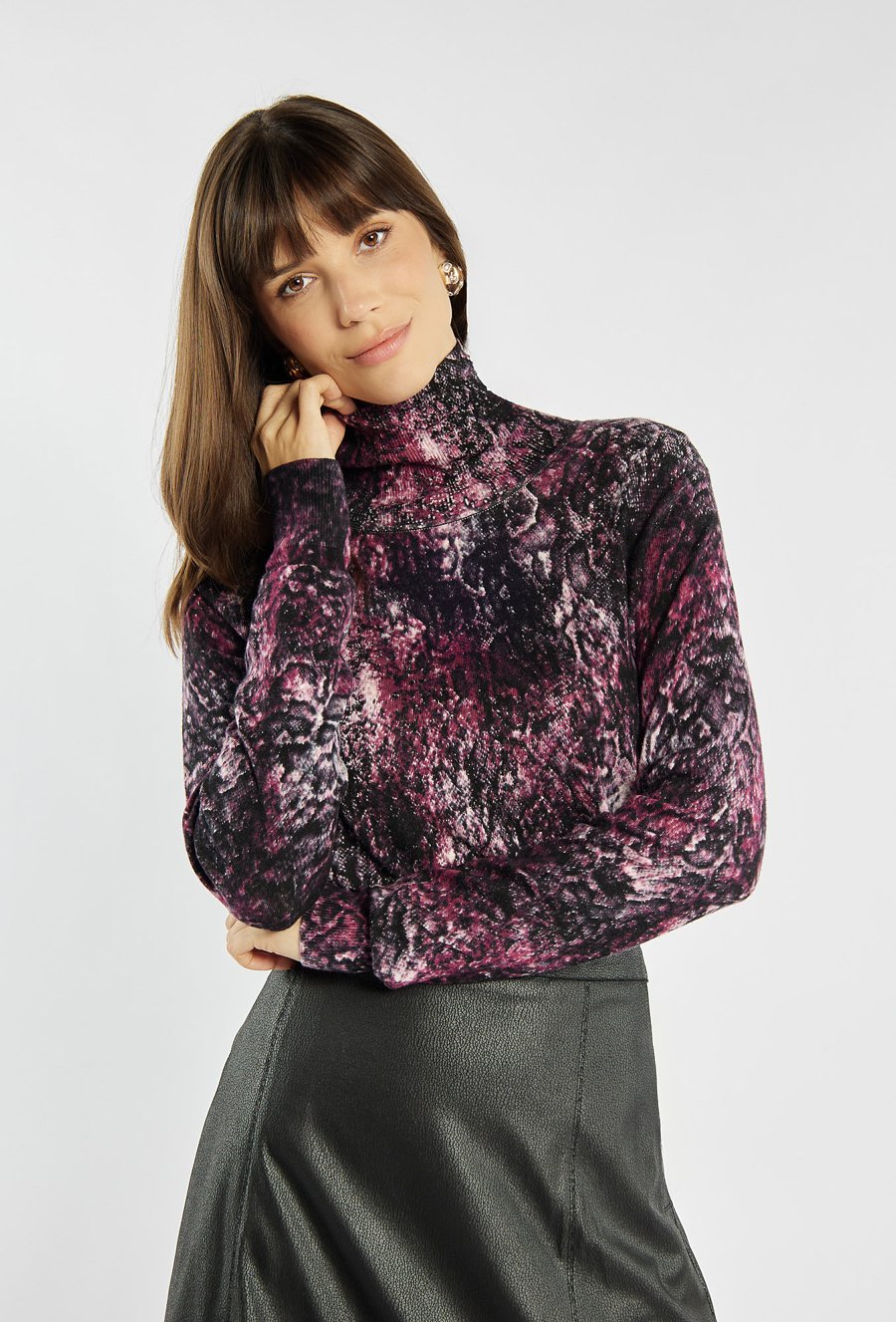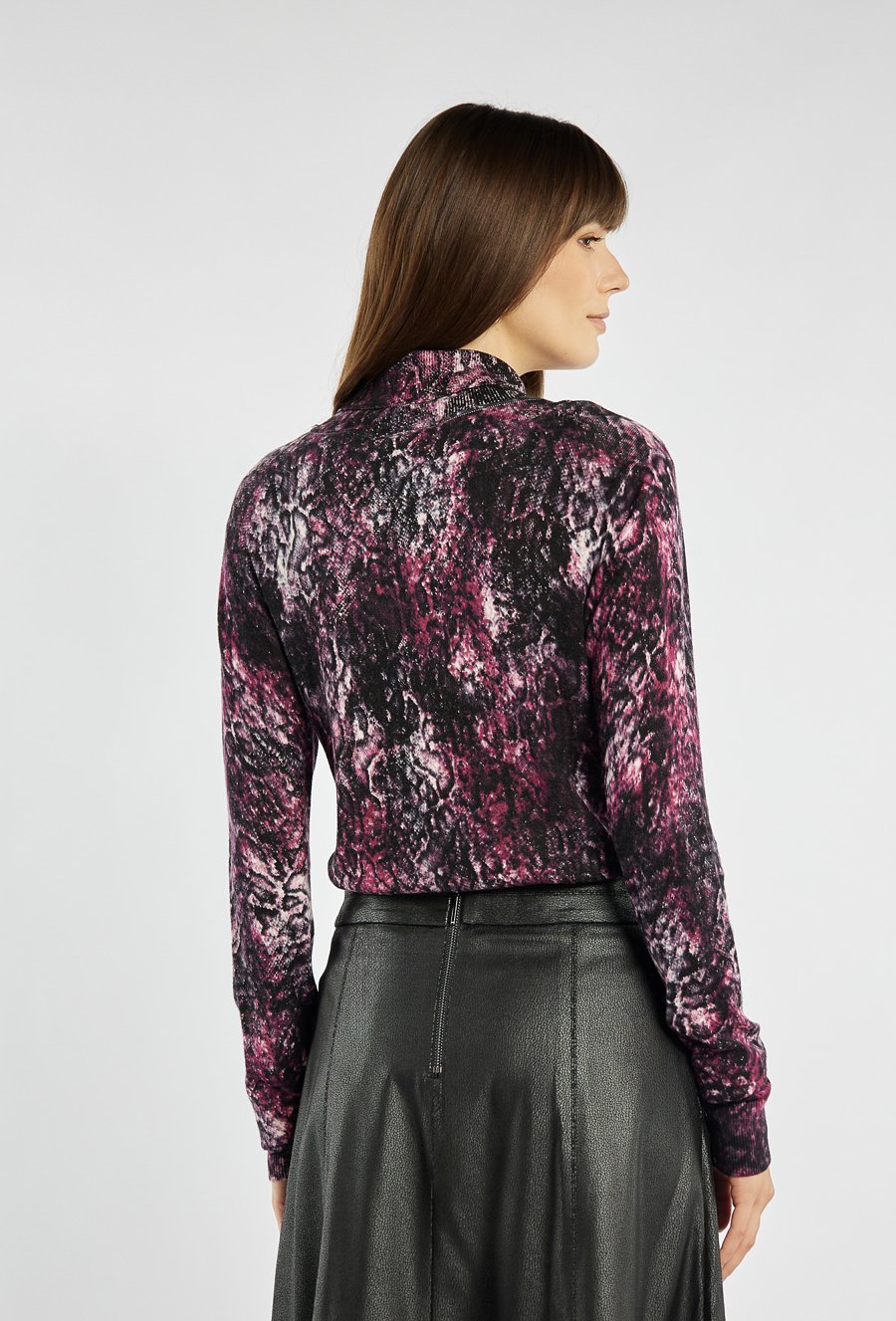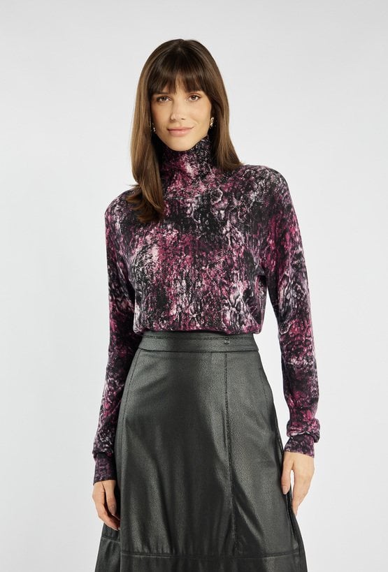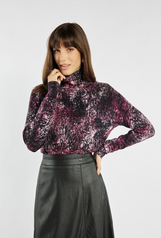 Elegancki sweter damski z geometrycznym wzorem. Model z delikatną stójką i długimi rękawami. Idealny wybór na co dzień i do pracy. Modelka na zdjęciu ma 177 cm wzrostu i prezentuje rozmiar S