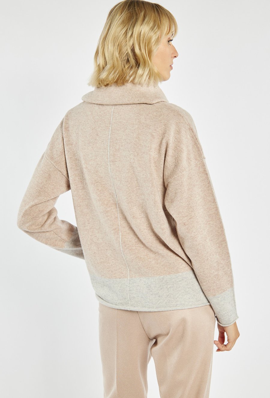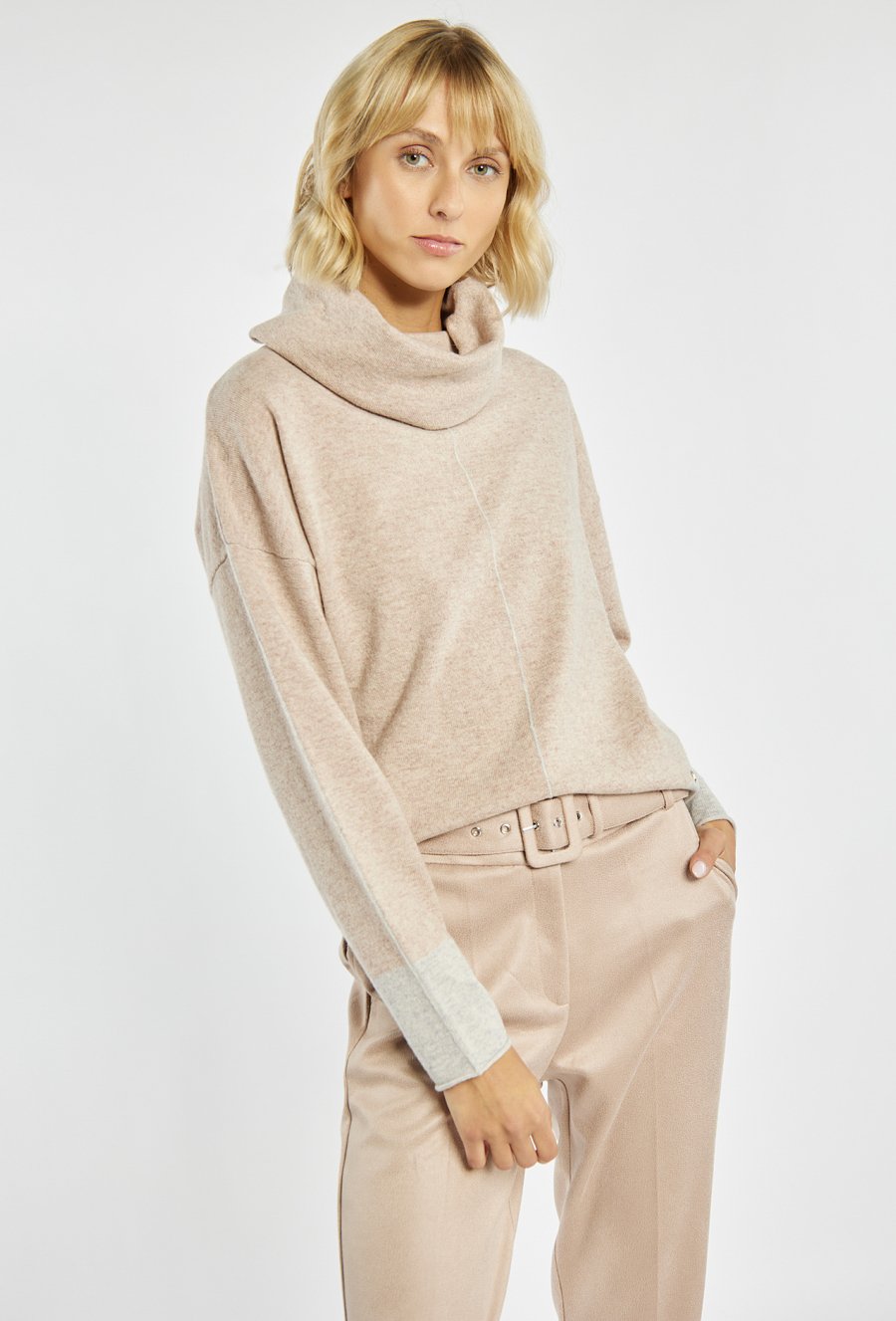 Sweter damski z wełną, o nowoczesnym kroju z szerokim, miękkim golfem. Sweter wyróżnia się wyjątkową miękkością i elegancją, idealny na chłodniejsze dni jesieni i zimy. Modelka na zdjęciu ma 177 cm wzrostu i prezentuje rozmiar S.