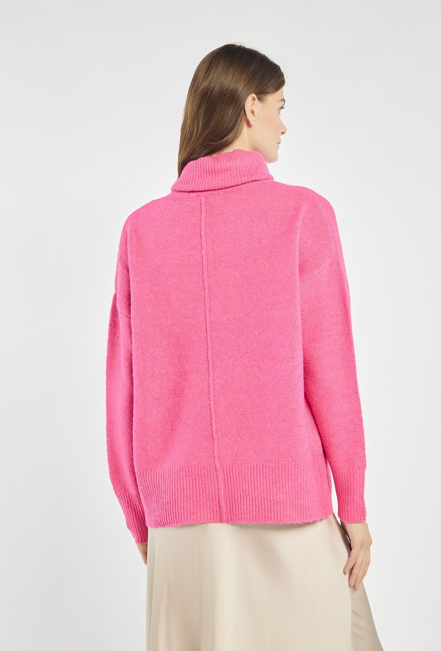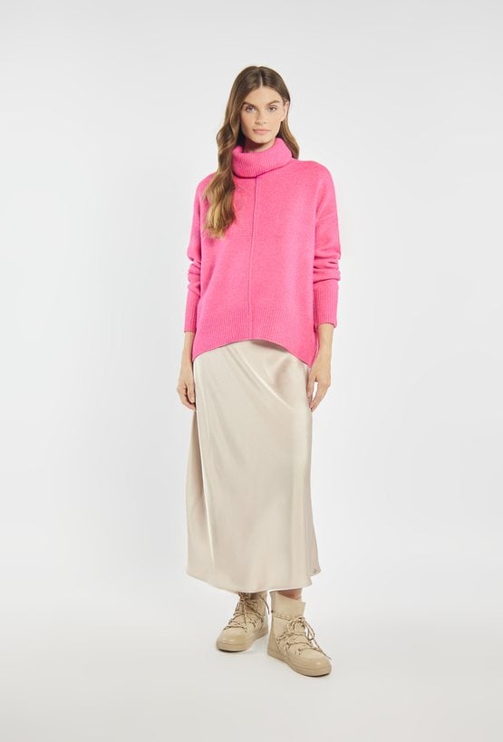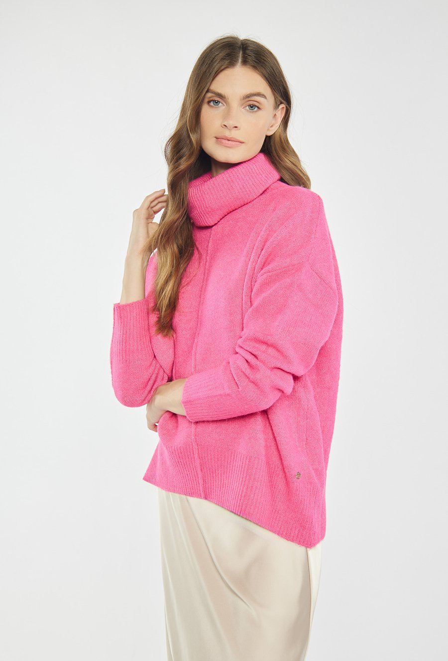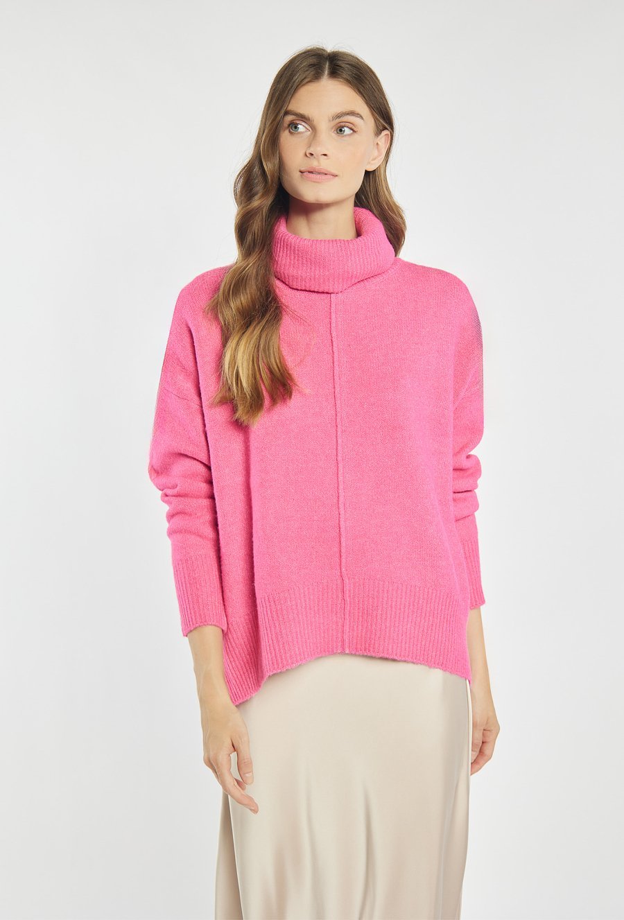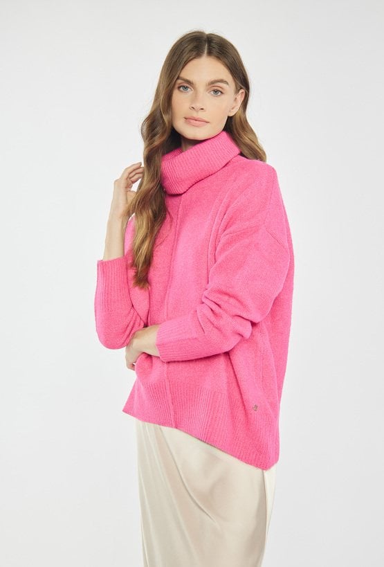 Sweter damski z miękkiej dzianiny. Sweter z szerokim golfem, który otula szyję i nadaje całości przytulnego charakteru. Dół i mankiety zakończone szerokim ściągaczem. Model ten doskonale łączy wygodę z klasycznym stylem. Modelka na zdjęciu ma 177 cm wzrostu i prezentuje rozmiar S.