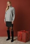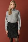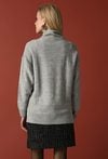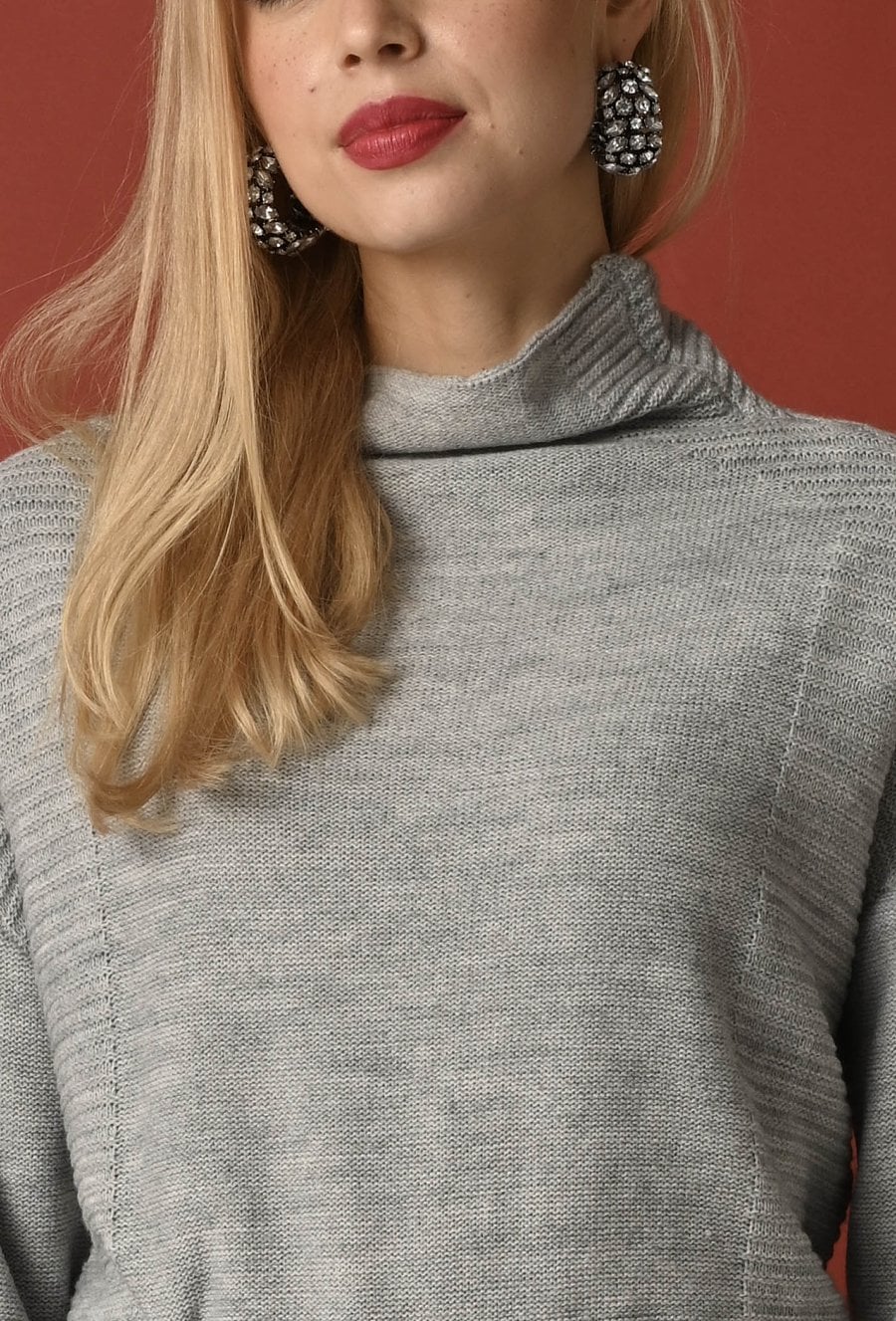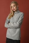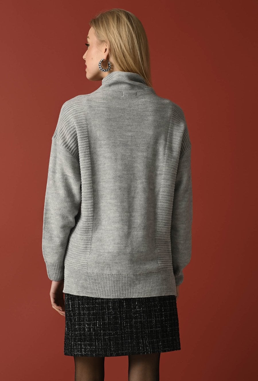 Stylowy sweter z miękkiej dzianiny z domieszką wełny. Lekko oversize'owy fason zapewnia wygodę i swobodę ruchów. Efektowne dzianie po bokach dodaje charakteru, a wysoki golf pięknie układa się wokół szyi, nadając całości szykownego wyglądu. Idealny na chłodne dni – do jeansów, spódnicy czy eleganckich spodni. Modelka na zdjęciu ma 177 cm wzrostu i prezentuje rozmiar 36.