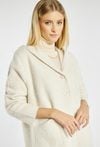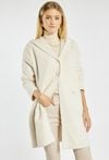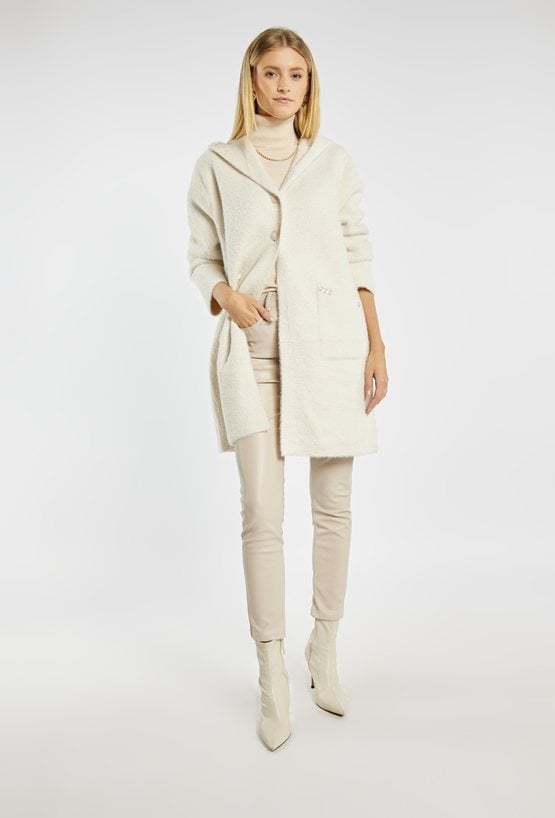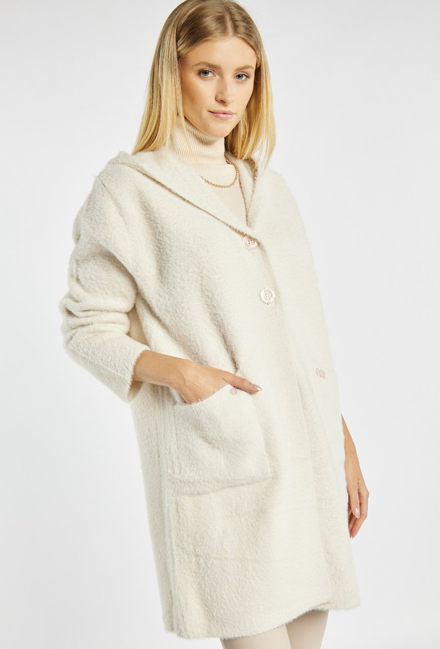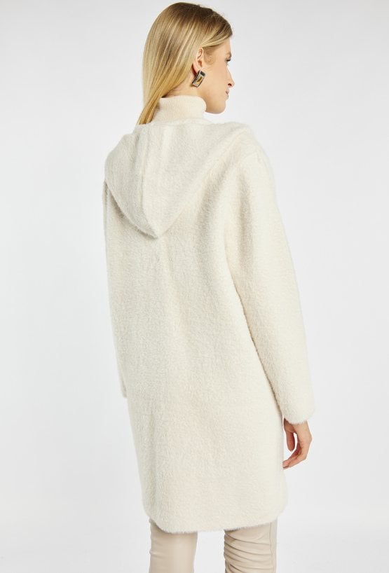 Długi kardigan z kapturem. Luźny krój zapewnia swobodę ruchów i komfort noszenia, a praktyczne kieszenie dodają funkcjonalności. Idealny jako ciepła warstwa na chłodniejsze dni. Modelka na zdjęciu ma 177 cm wzrostu i prezentuje rozmiar S/M.