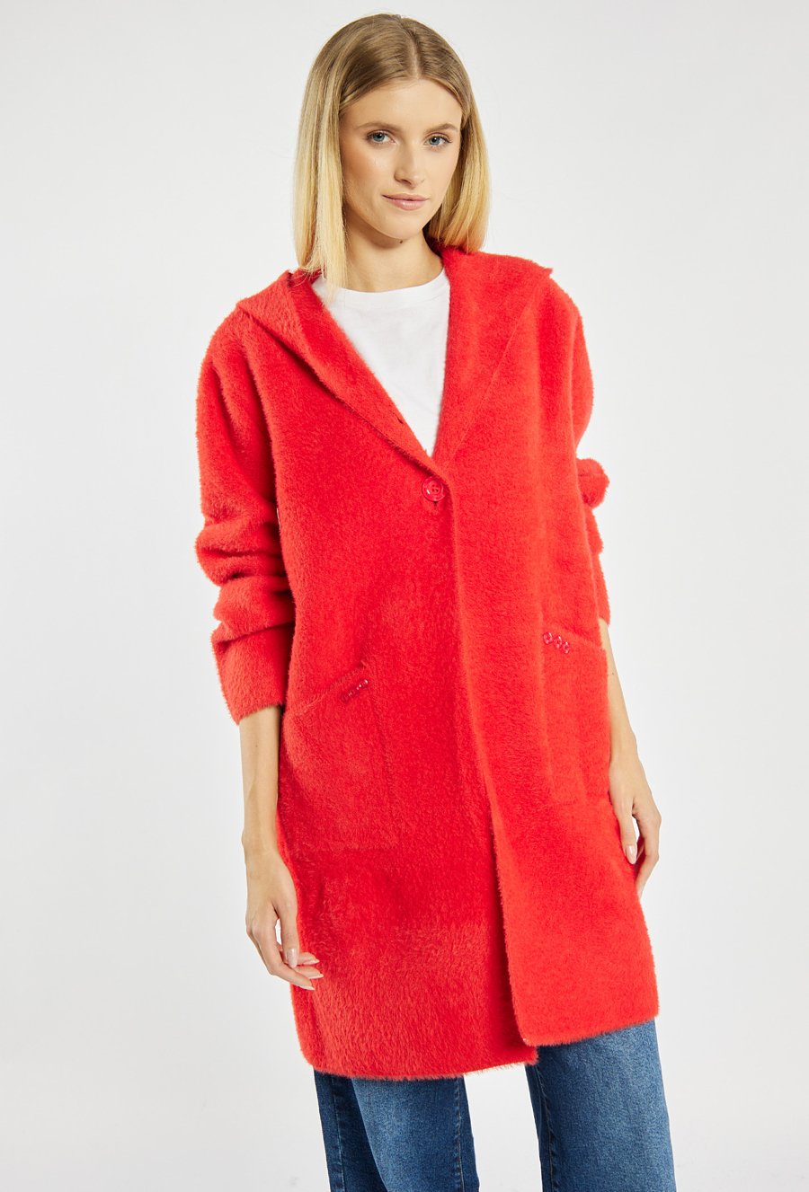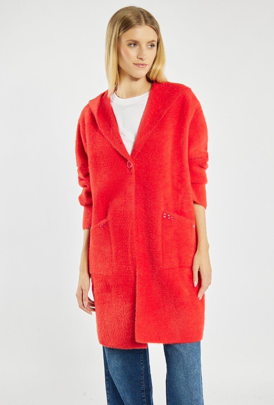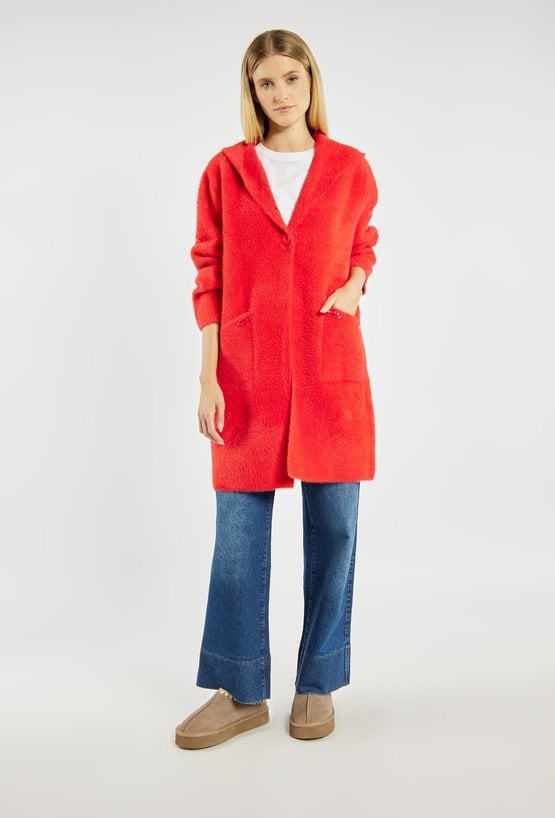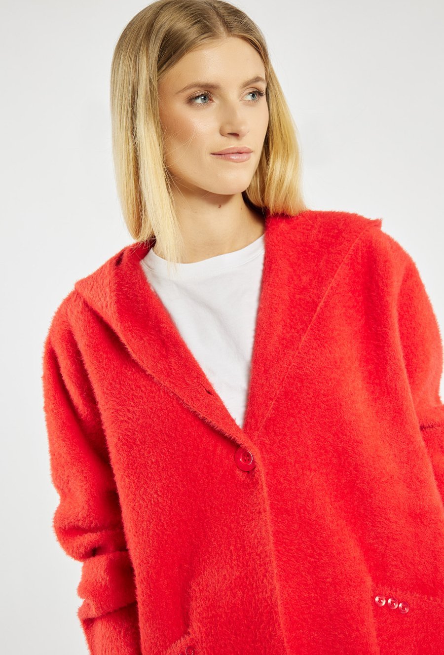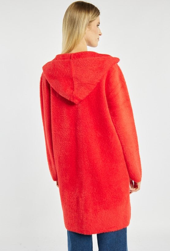 Długi kardigan z kapturem. Luźny krój zapewnia swobodę ruchów i komfort noszenia, a praktyczne kieszenie dodają funkcjonalności. Idealny jako ciepła warstwa na chłodniejsze dni. Modelka na zdjęciu ma 177 cm wzrostu i prezentuje rozmiar S/M.