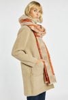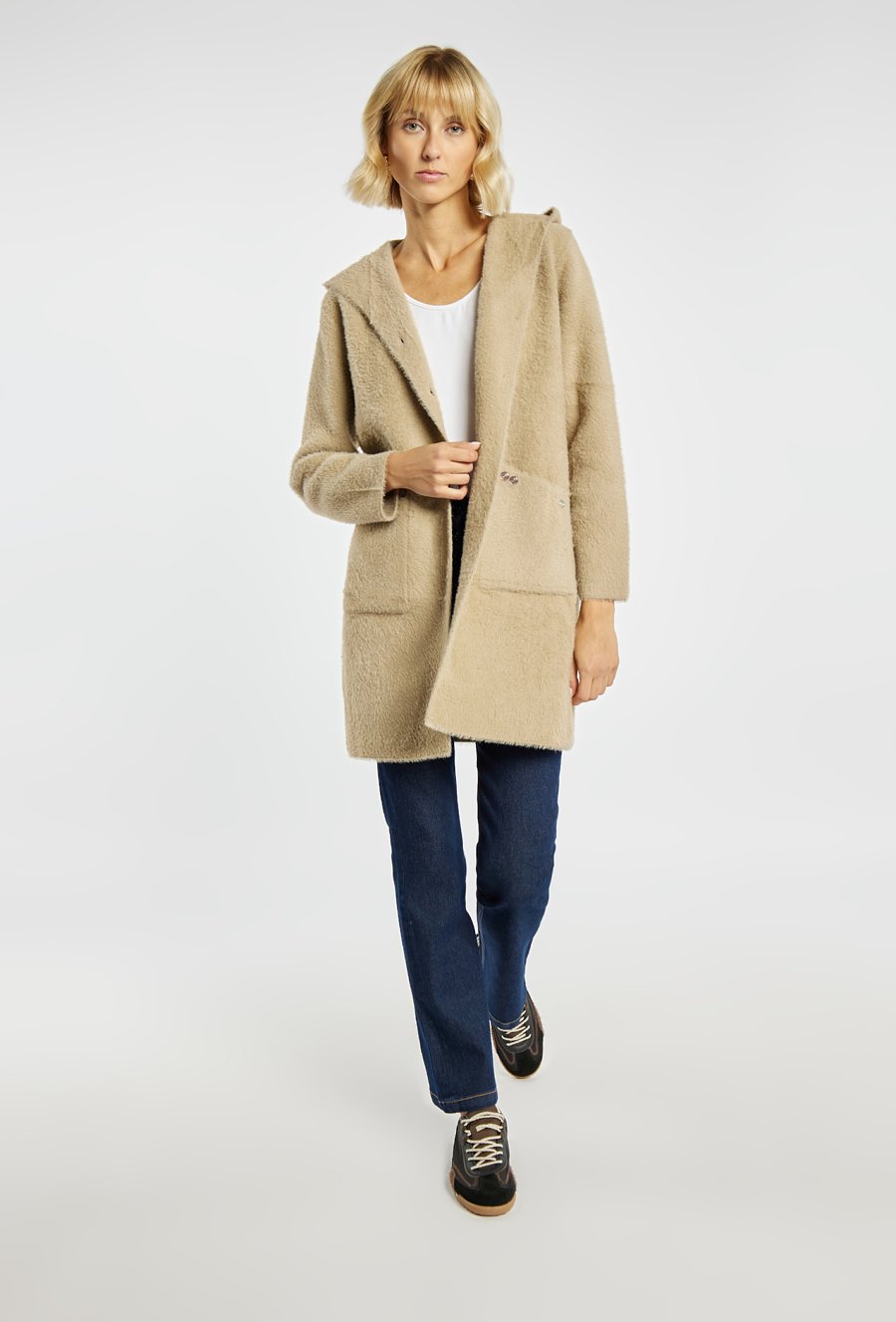 Długi kardigan z kapturem. Luźny krój zapewnia swobodę ruchów i komfort noszenia, a praktyczne kieszenie dodają funkcjonalności. Idealny jako ciepła warstwa na chłodniejsze dni. Modelka na zdjęciu ma 177 cm wzrostu i prezentuje rozmiar S/M.
