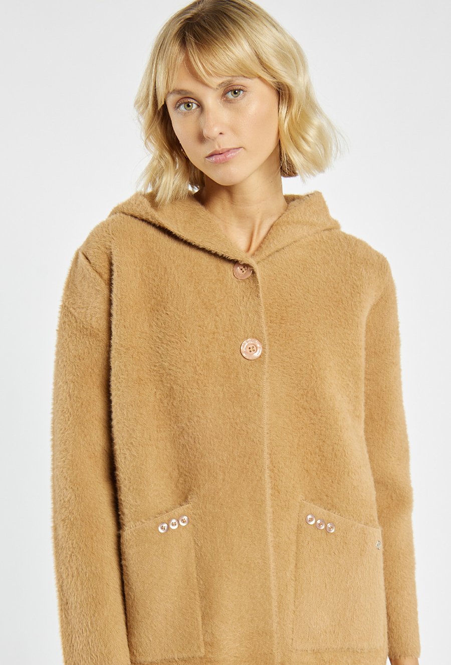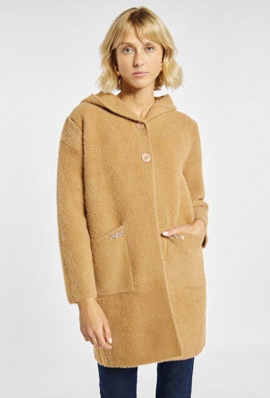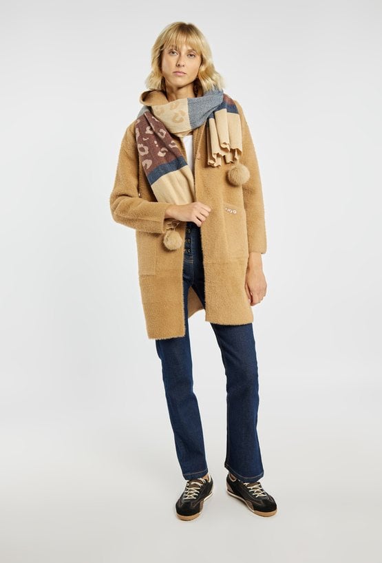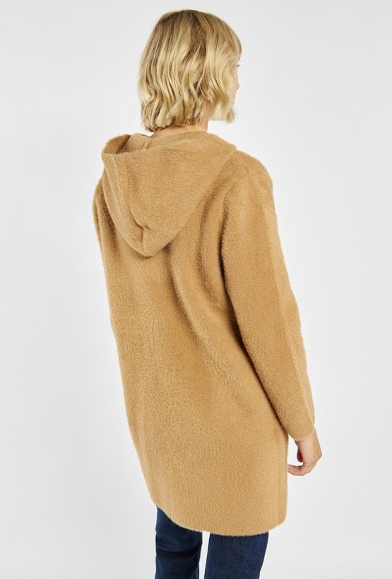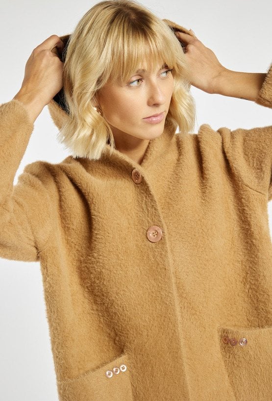 Długi kardigan z kapturem. Luźny krój zapewnia swobodę ruchów i komfort noszenia, a praktyczne kieszenie dodają funkcjonalności. Idealny jako ciepła warstwa na chłodniejsze dni. Modelka na zdjęciu ma 177 cm wzrostu i prezentuje rozmiar S/M.