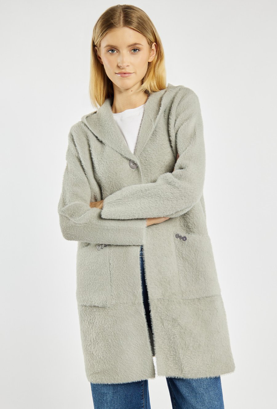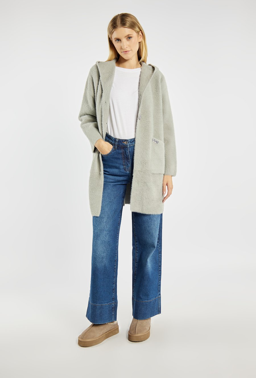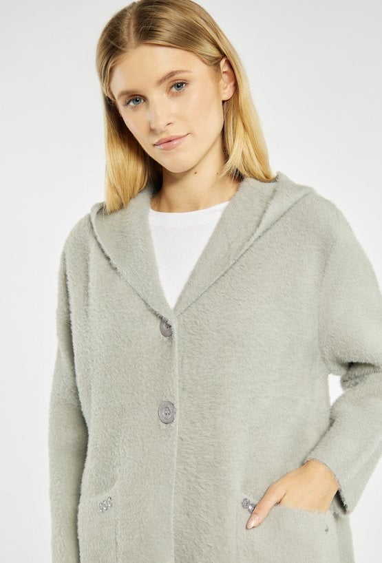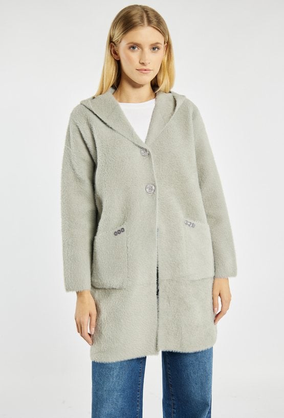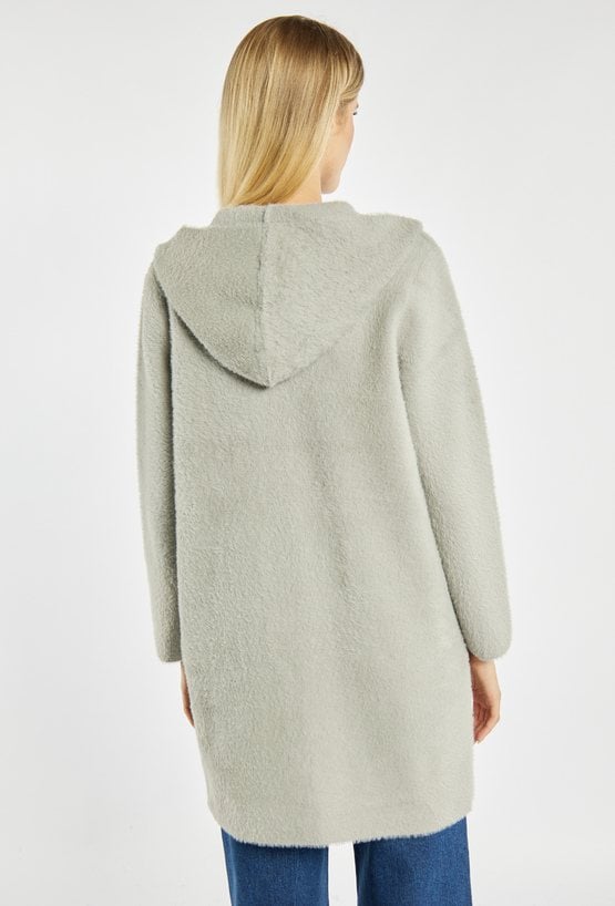 Długi kardigan z kapturem. Luźny krój zapewnia swobodę ruchów i komfort noszenia, a praktyczne kieszenie dodają funkcjonalności. Idealny jako ciepła warstwa na chłodniejsze dni. Modelka na zdjęciu ma 177 cm wzrostu i prezentuje rozmiar S/M.