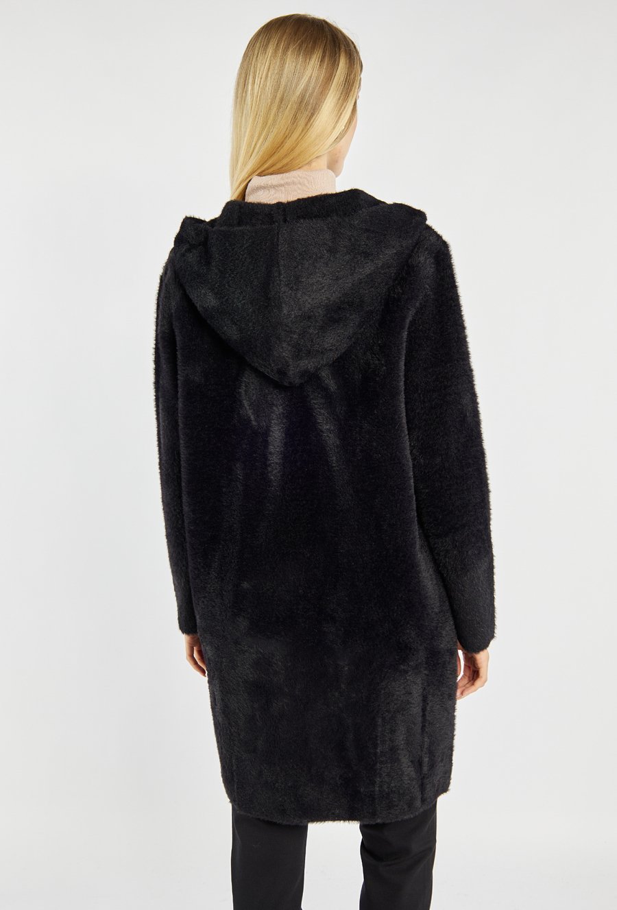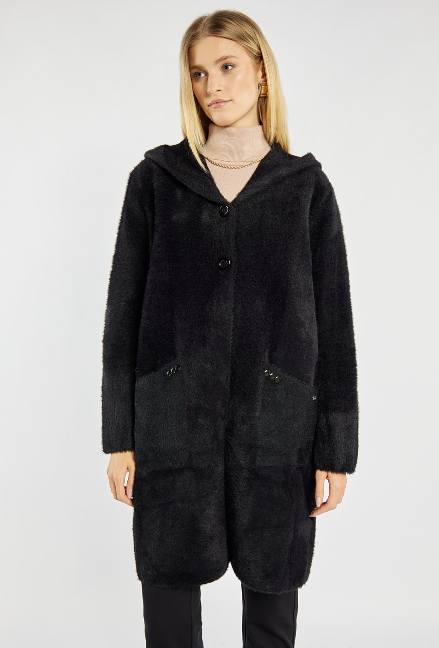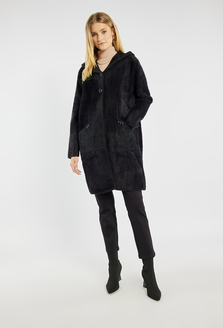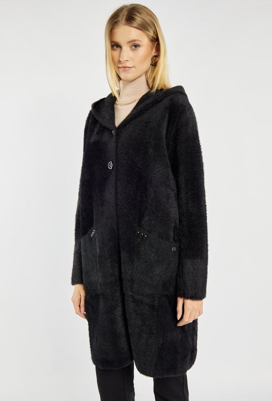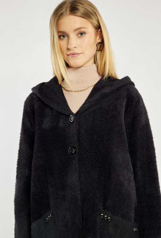 Długi kardigan z kapturem. Luźny krój zapewnia swobodę ruchów i komfort noszenia, a praktyczne kieszenie dodają funkcjonalności. Idealny jako ciepła warstwa na chłodniejsze dni. Modelka na zdjęciu ma 177 cm wzrostu i prezentuje rozmiar S/M.