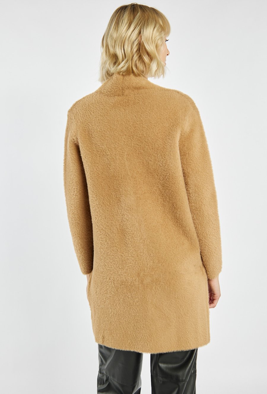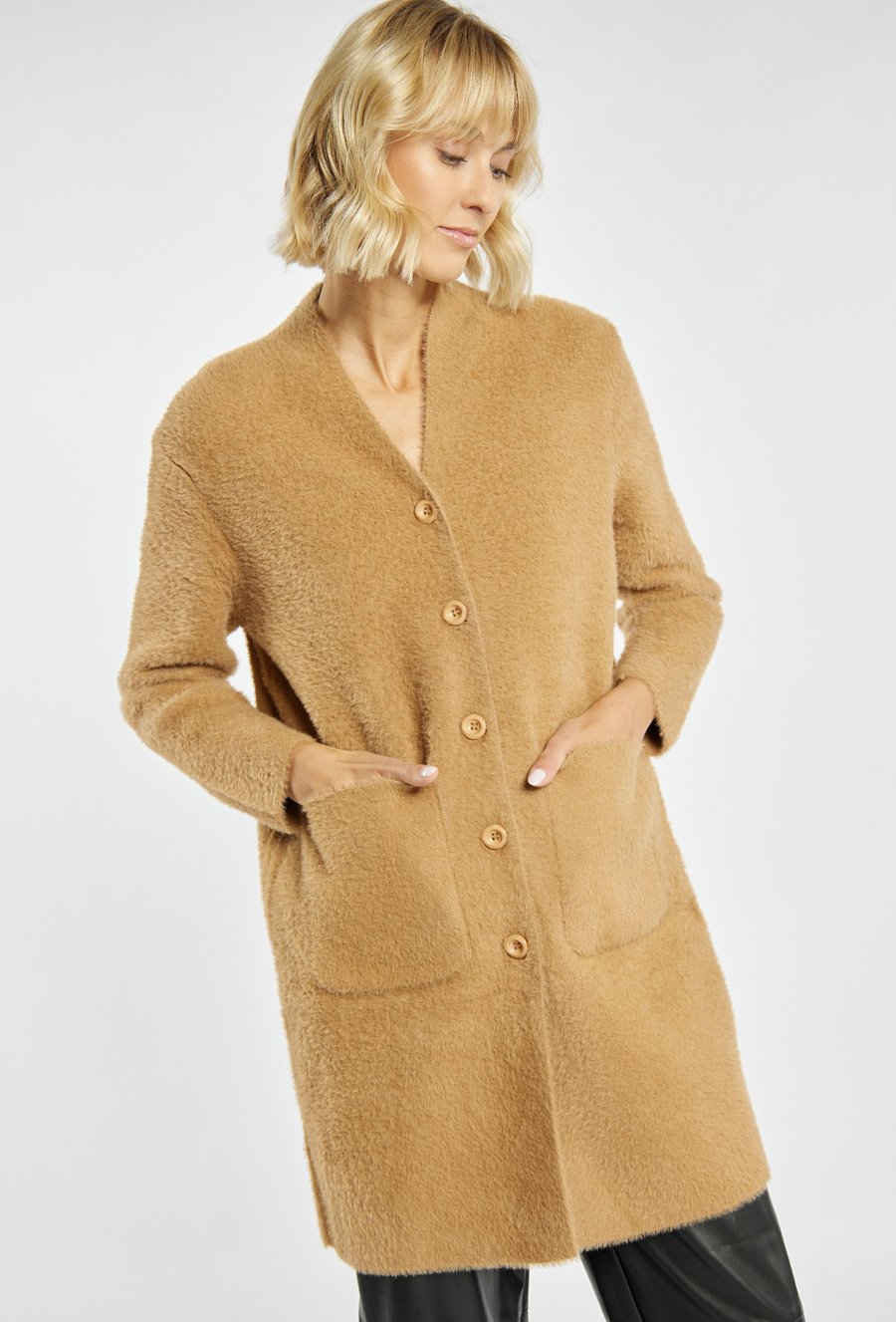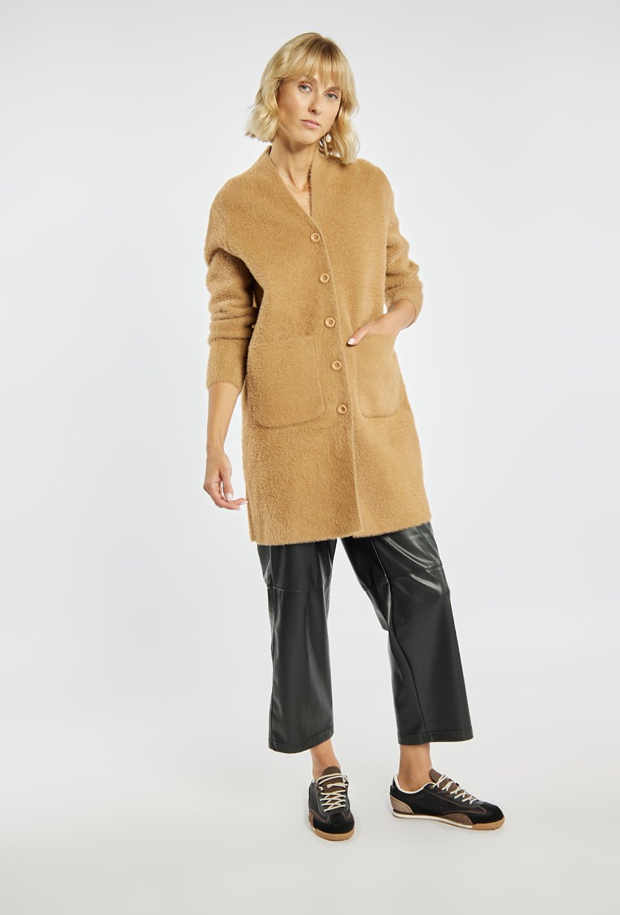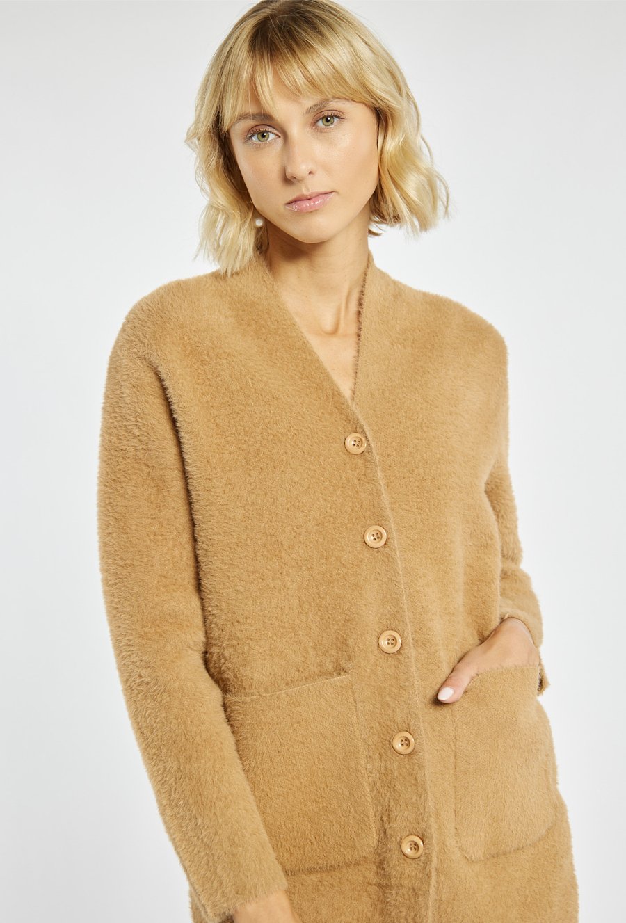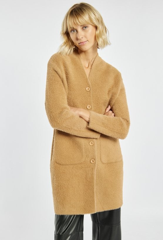 Długi, miękki sweter zapinany na guziki, z wygodnymi kieszeniami z przodu. Klasyczny krój sprawia, że idealnie dopełni zarówno codzienne, jak i bardziej eleganckie stylizacje. Modelka na zdjęciu ma 177 cm wzrostu i prezentuje rozmiar S/M.