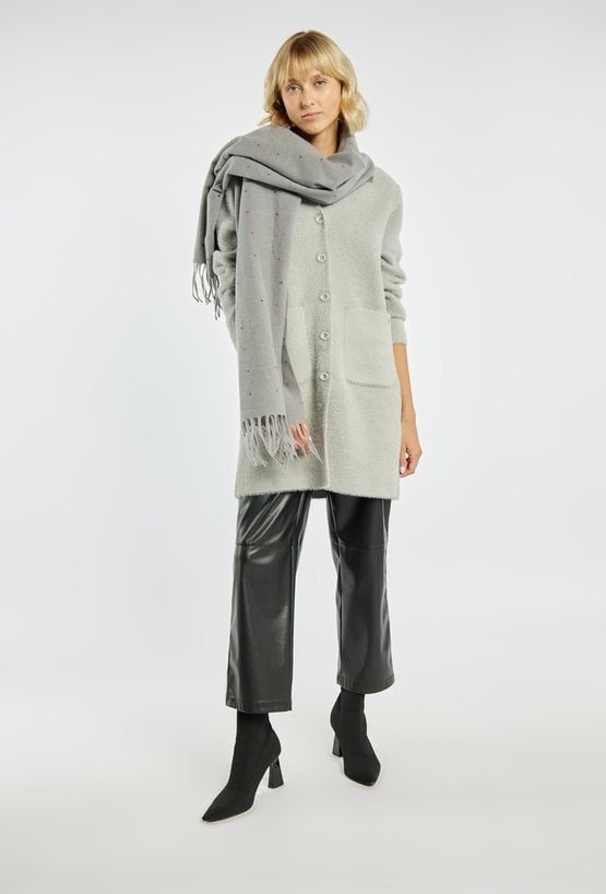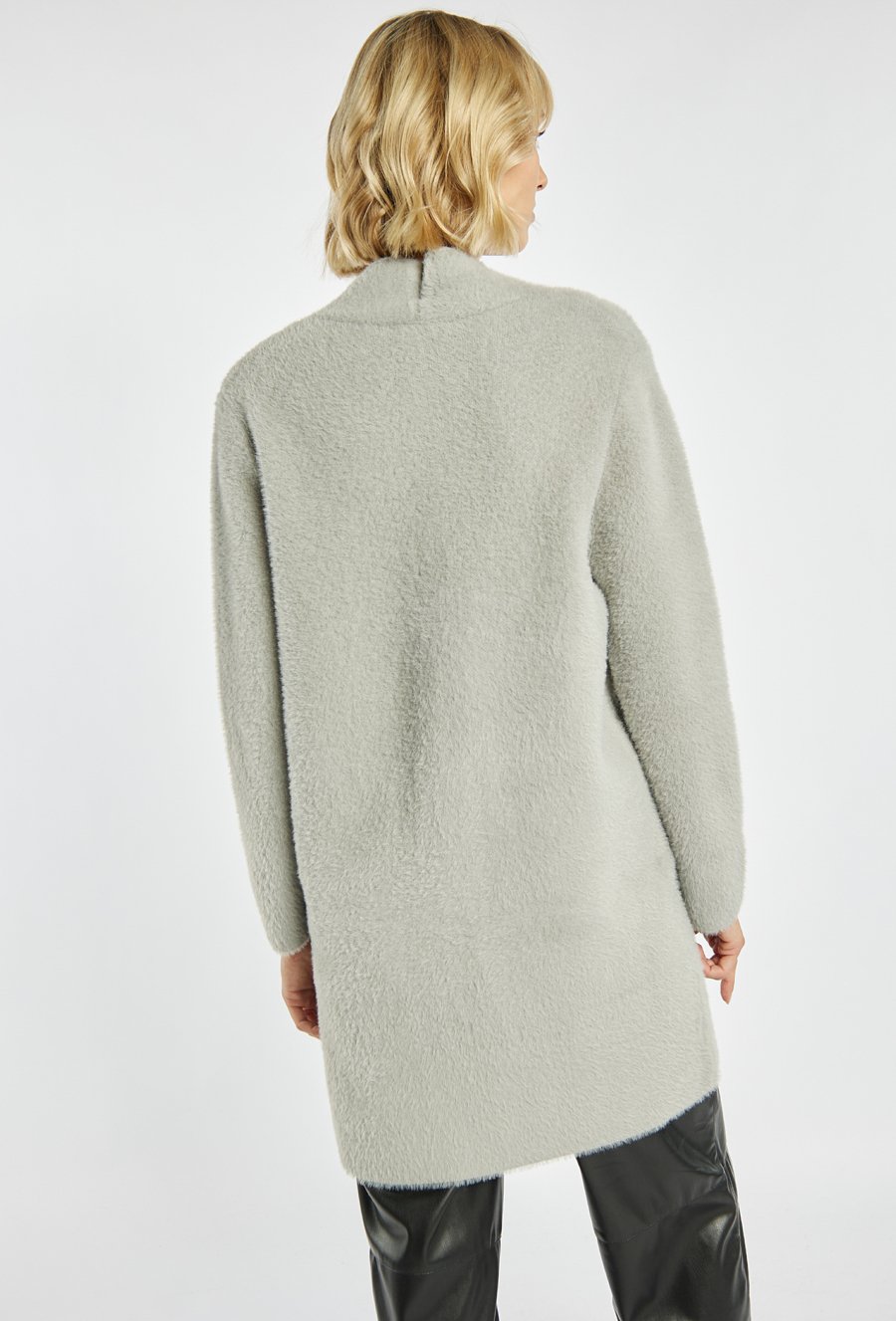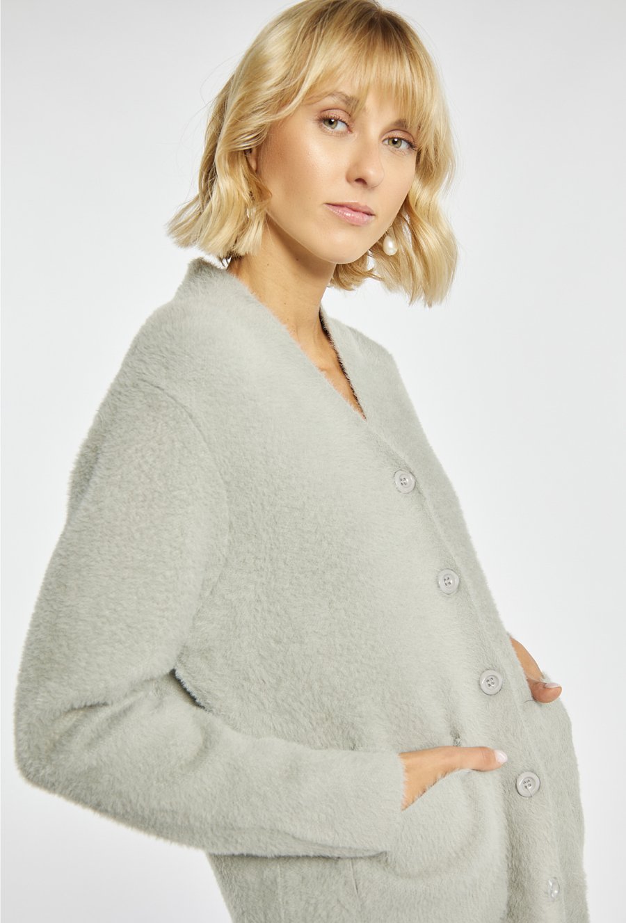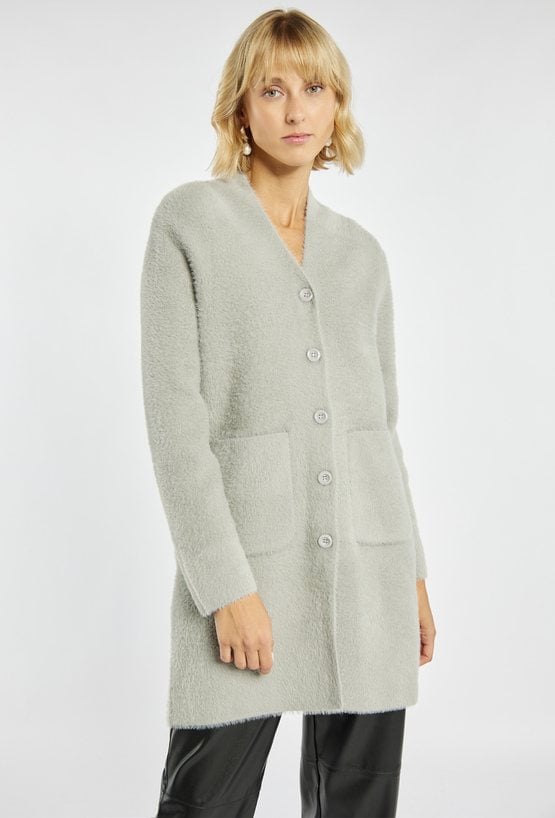 Długi, miękki sweter zapinany na guziki, z wygodnymi kieszeniami z przodu. Klasyczny krój sprawia, że idealnie dopełni zarówno codzienne, jak i bardziej eleganckie stylizacje. Modelka na zdjęciu ma 177 cm wzrostu i prezentuje rozmiar S/M.