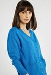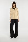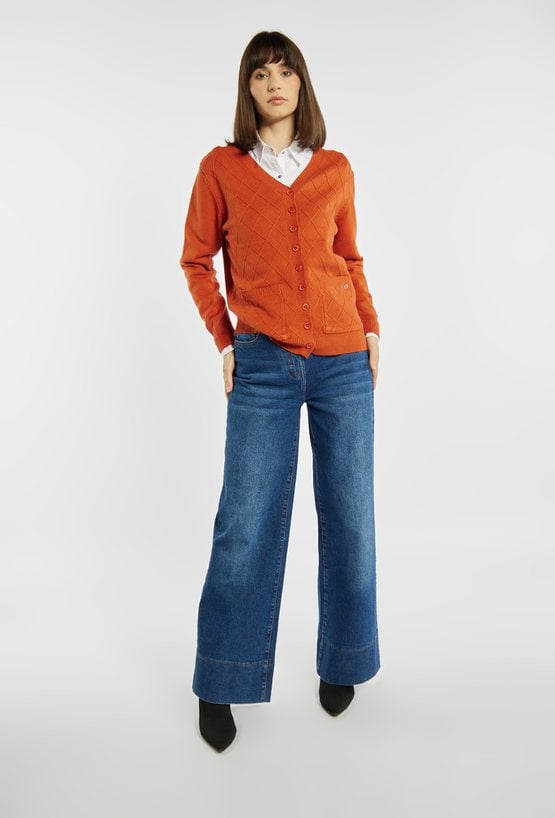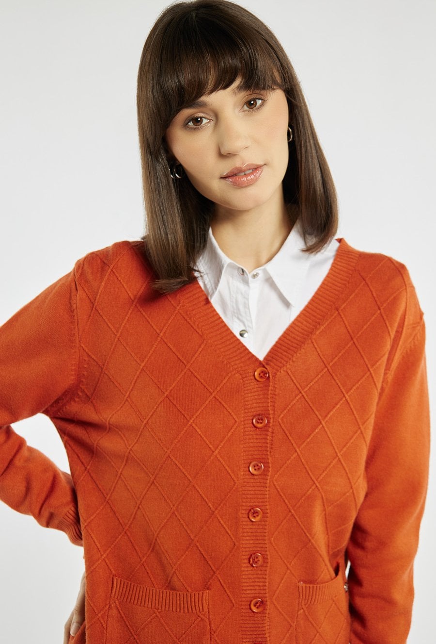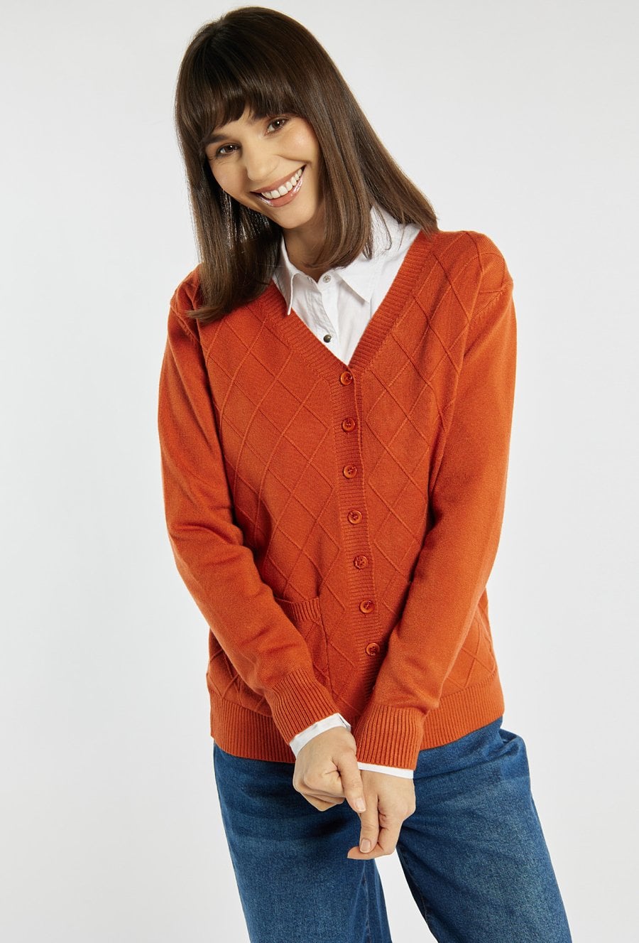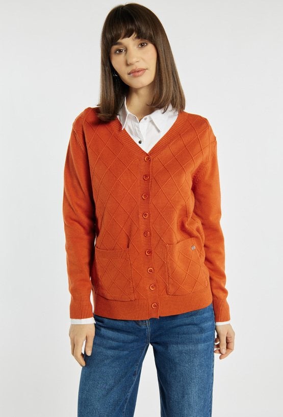 Kardigan damski o klasycznym kroju, wykonany z przyjemnego w dotyku materiału. Kardigan z długimi rękawami, zapięciem na guziki oraz subtelnym, pikowanym wzorem to uniwersalny model na co dzień. Dwie przednie kieszonki dodają mu praktycznego charakteru. Modelka na zdjęciu ma 177 cm wzrostu i prezentuje rozmiar S/M.