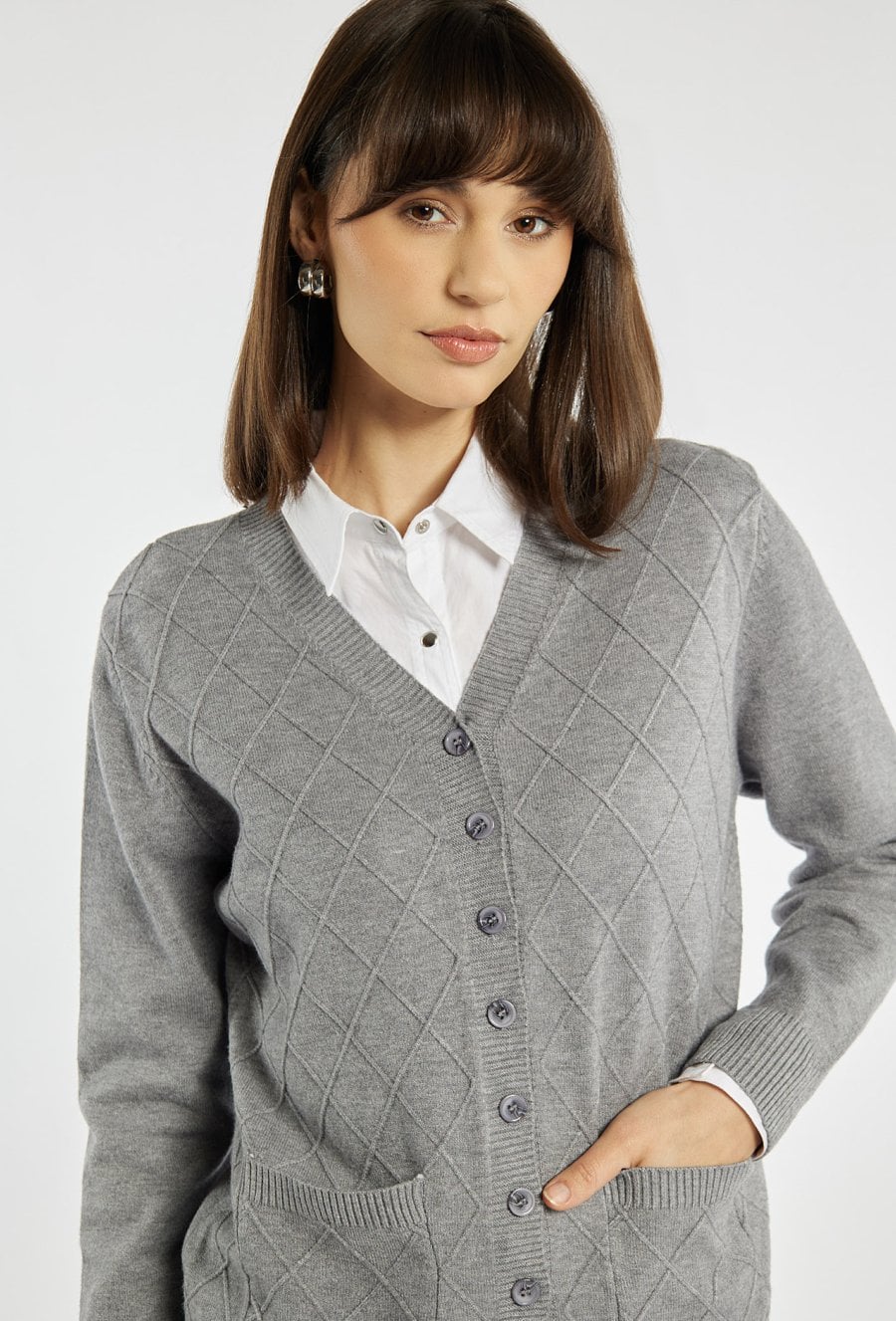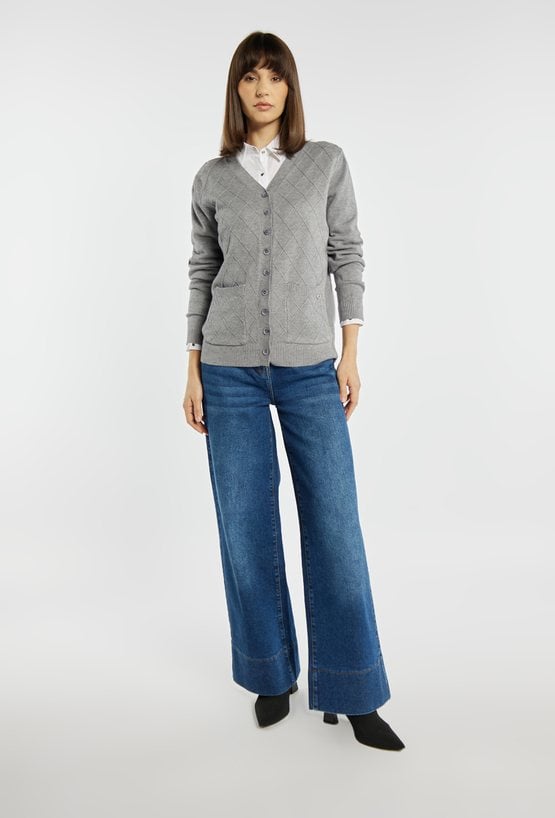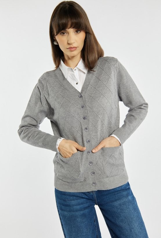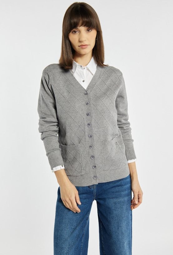Kardigan damski o klasycznym kroju, wykonany z przyjemnego w dotyku materiału. Kardigan z długimi rękawami, zapięciem na guziki oraz subtelnym, pikowanym wzorem to uniwersalny model na co dzień. Dwie przednie kieszonki dodają mu praktycznego charakteru. Modelka na zdjęciu ma 177 cm wzrostu i prezentuje rozmiar S/M.