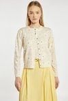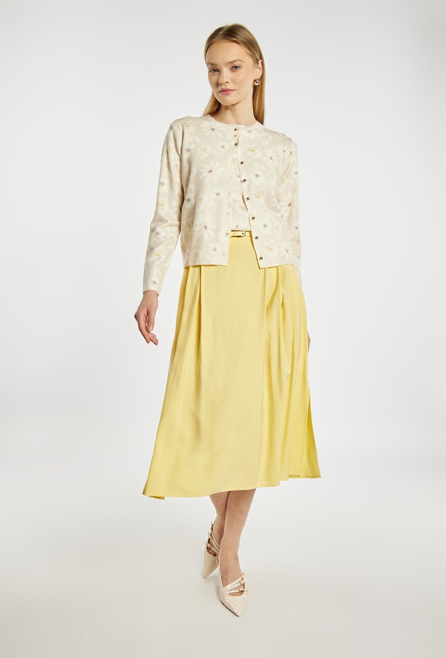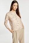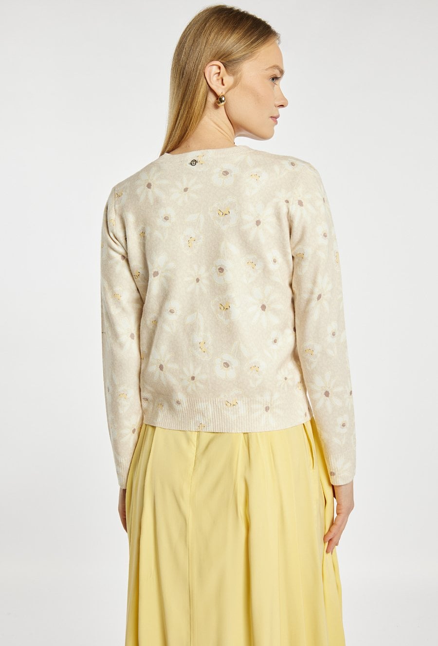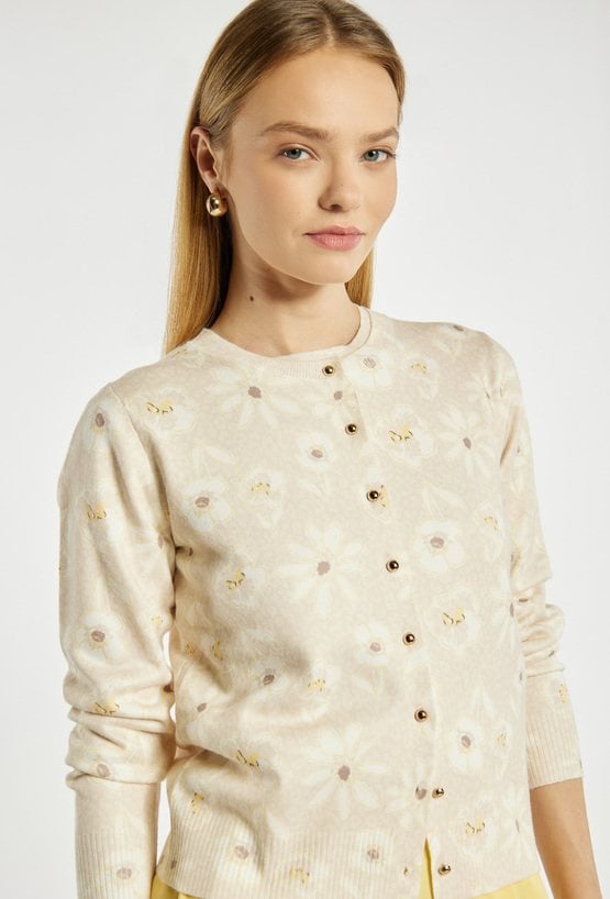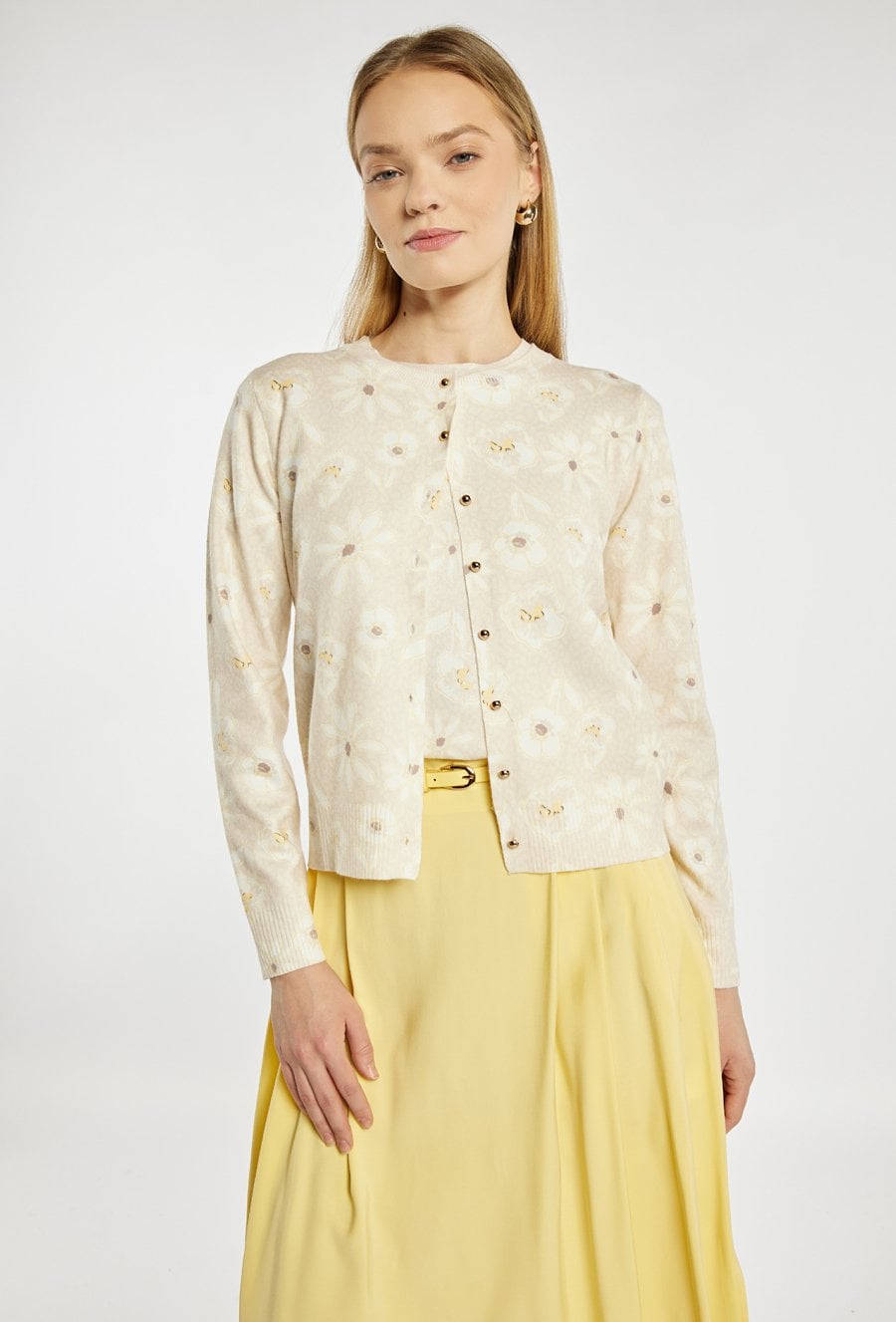 Kardigan damski o klasycznym, eleganckim fasonie. Model zapinany na guziki, z okrągłym dekoltem oraz długimi rękawami zakończonymi ściągaczami. Całość zdobi delikatny, kwiatowy wzór, który nadaje kardiganowi kobiecego i subtelnego charakteru. Idealny do codziennych stylizacji. Modelka na zdjęciu ma 177 cm wzrostu i prezentuje rozmiar S.
