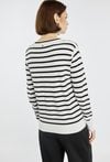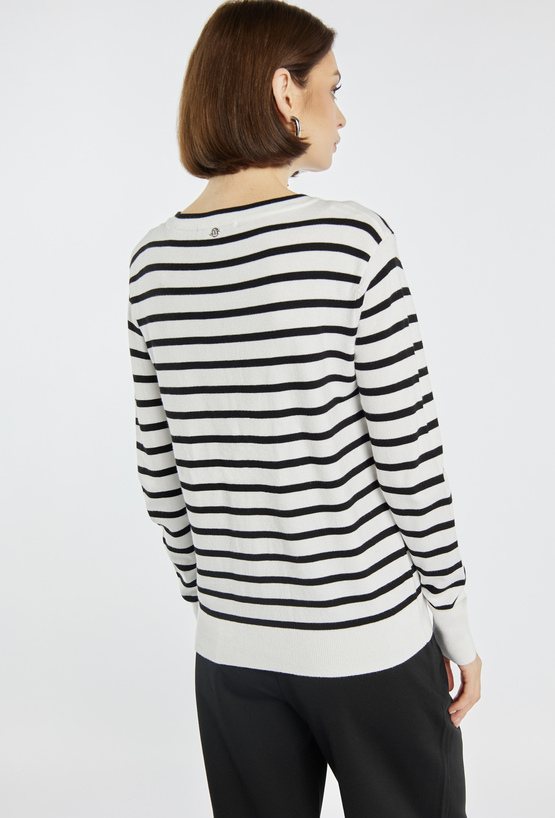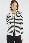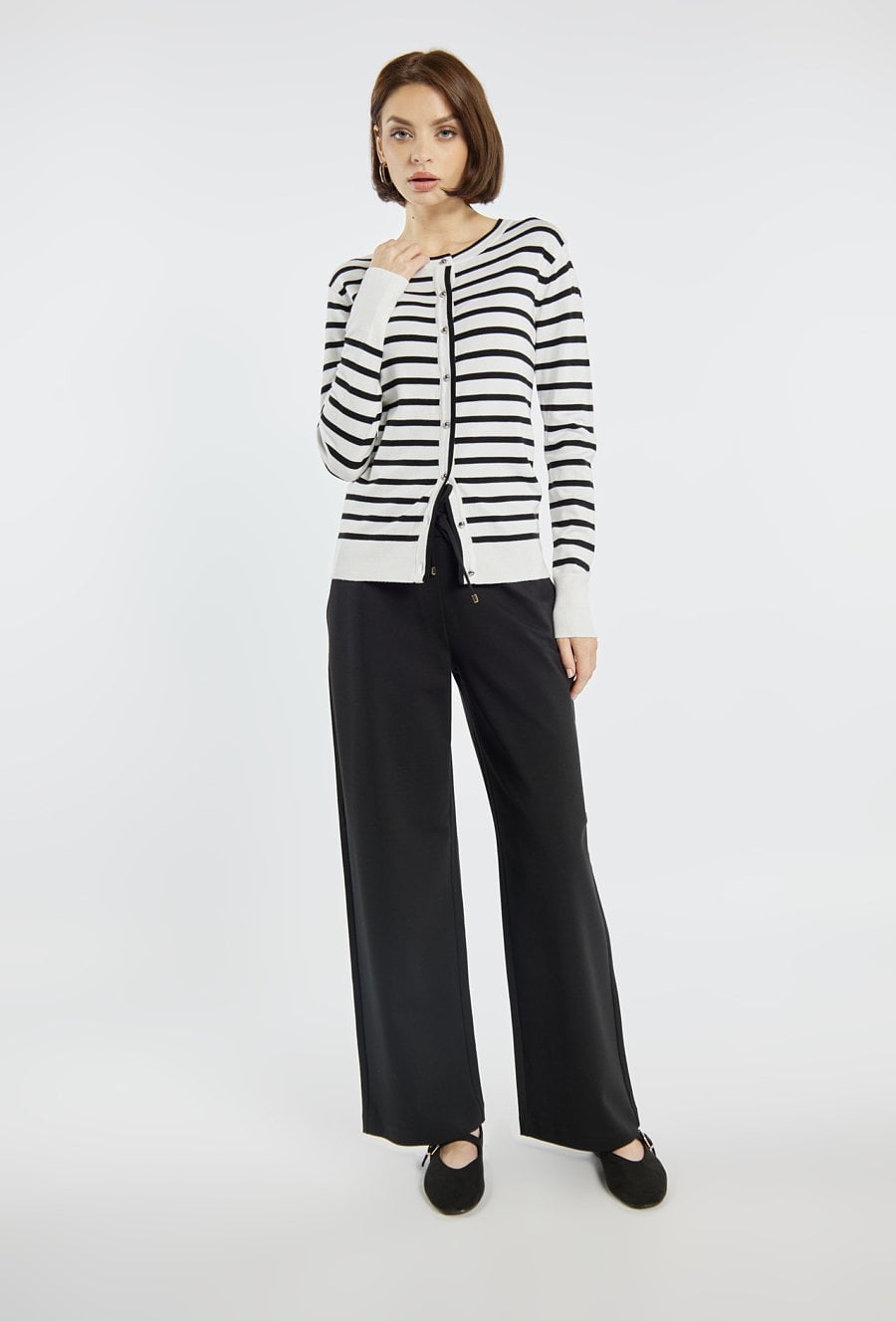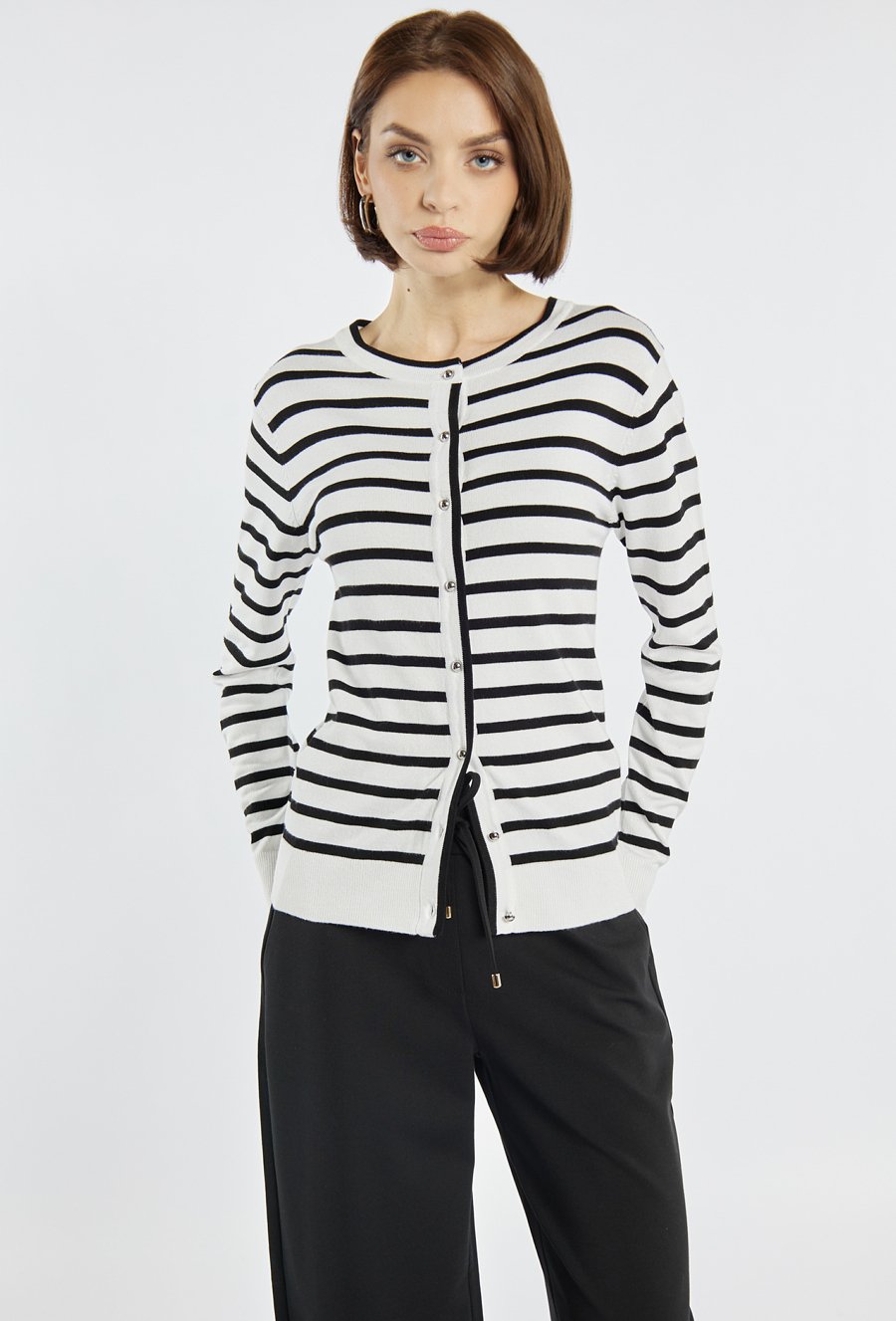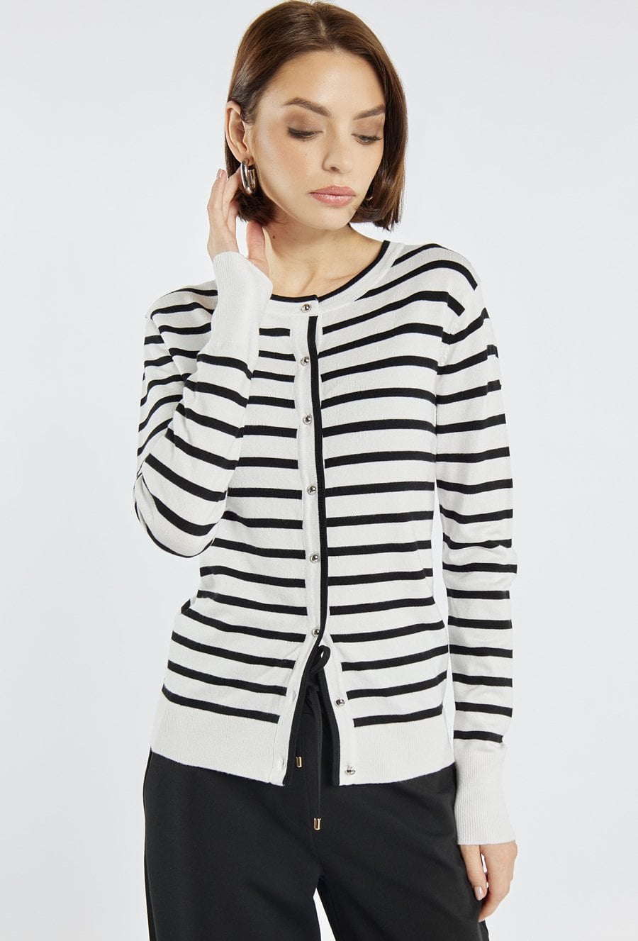 Sweter o klasycznym kroju z długim rękawem zapinany na guziki wyróżnia się ponadczasowym wzorem w paski, który nadaje stylizacji świeżego, casualowego charakteru. Model idealny na co dzień. Modelka na zdjęciu ma 177 cm wzrostu i prezentuje rozmiar S.