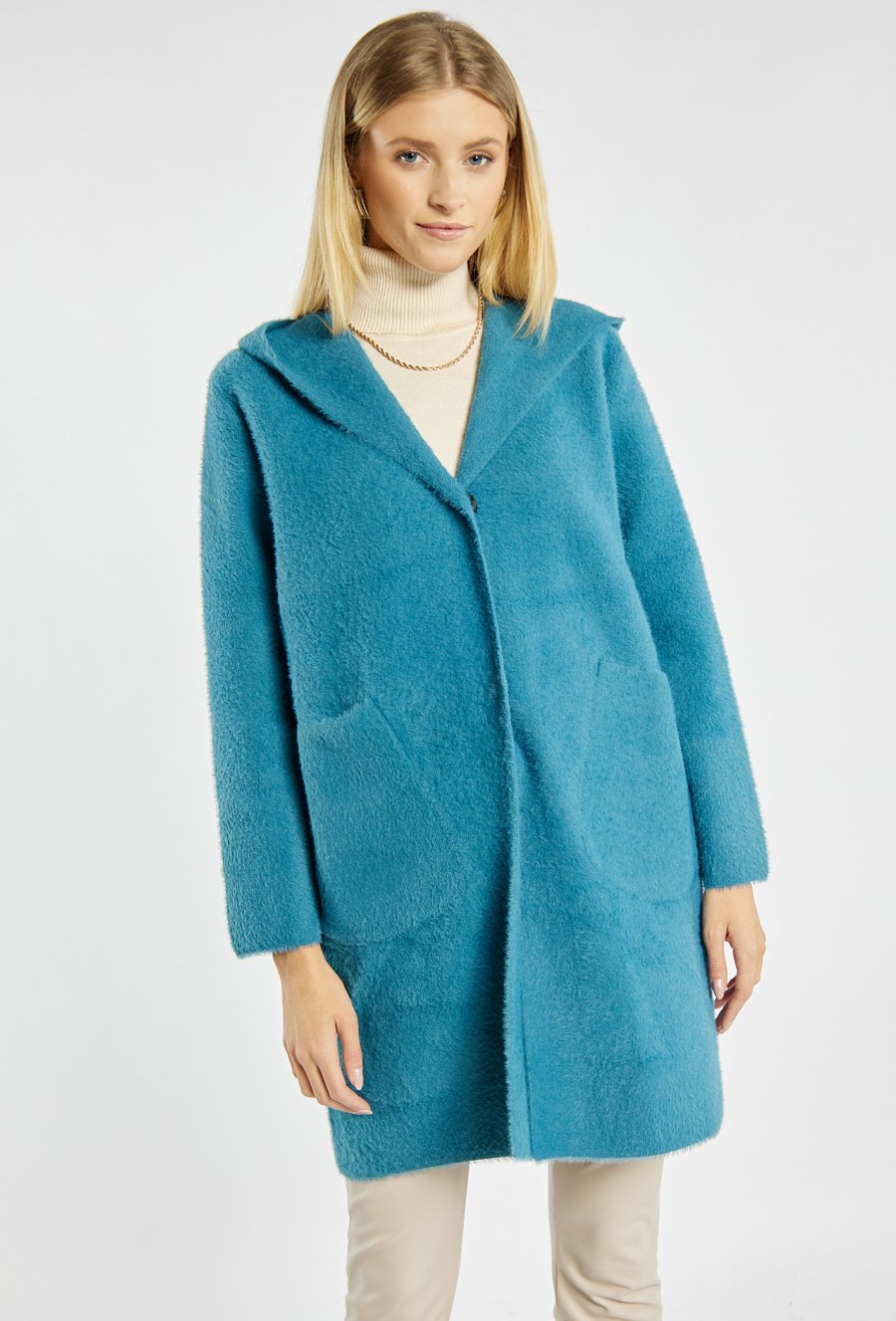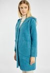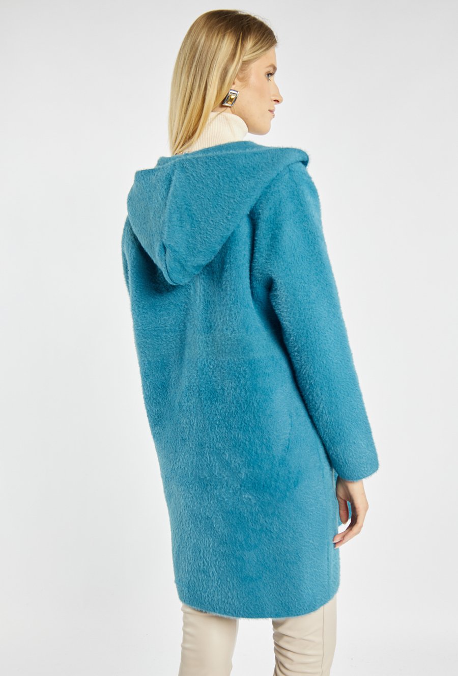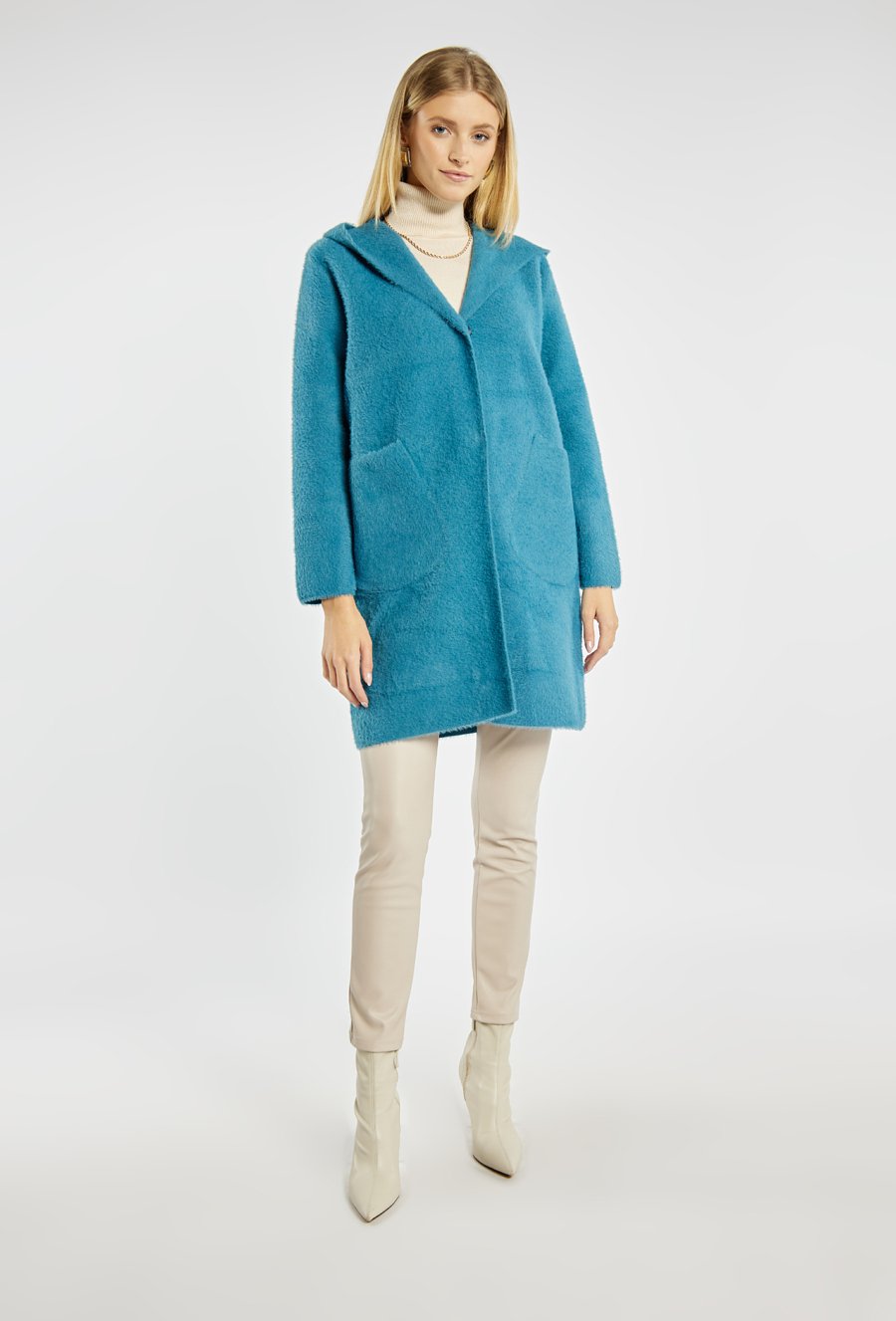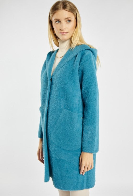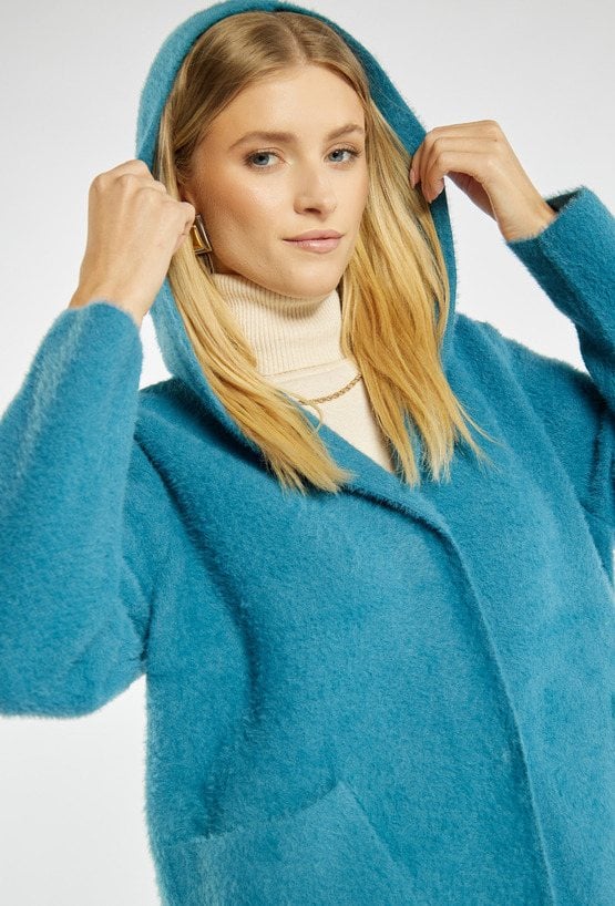 Długi sweter o prostym kroju z praktycznym kapturem i naszywanymi kieszeniami po bokach. Doskonale sprawdzi się jako wygodna alternatywa dla lekkiego płaszcza. Idealny na chłodniejsze dni, dodaje stylizacji przytulnego charakteru. Modelka na zdjęciu ma 177 cm wzrostu i prezentuje rozmiar S/M.