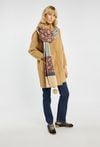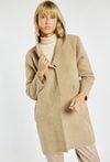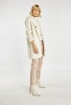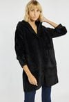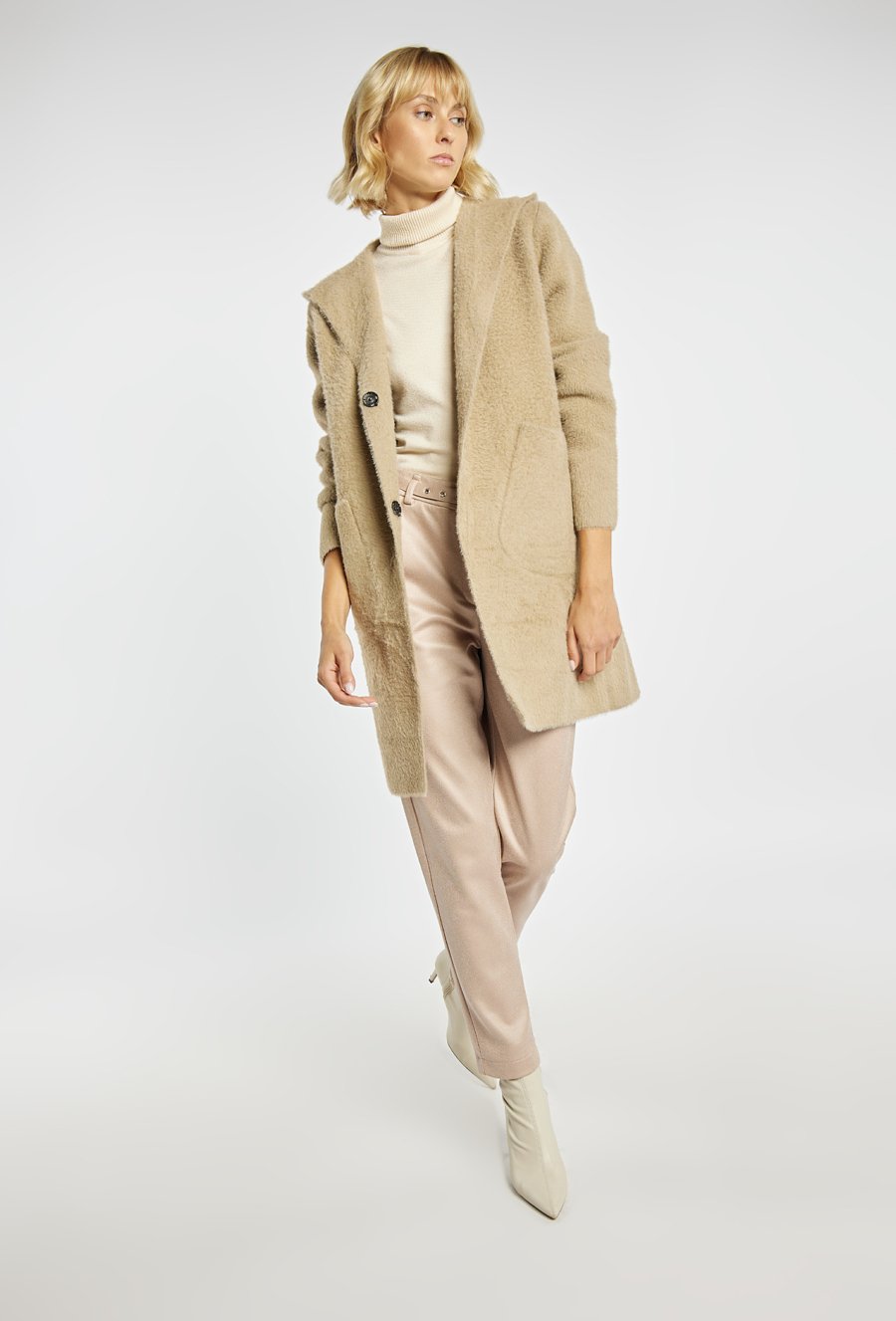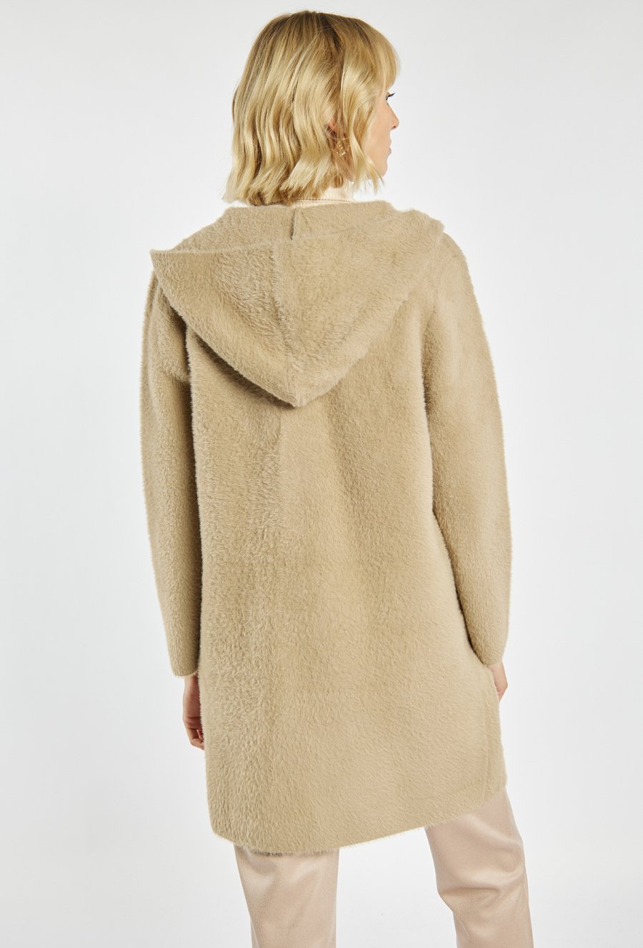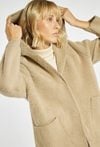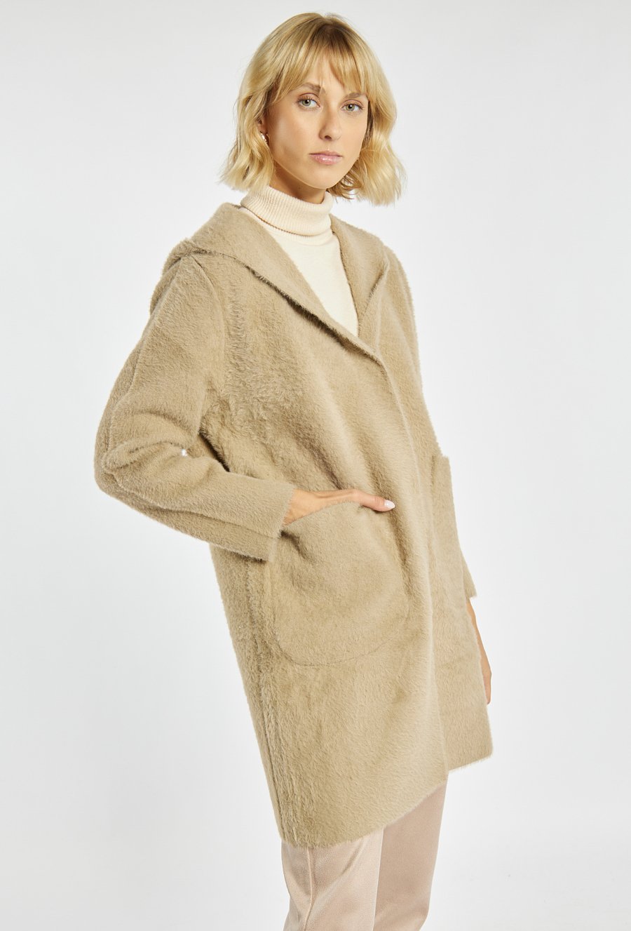 Długi sweter o prostym kroju z praktycznym kapturem i naszywanymi kieszeniami po bokach. Doskonale sprawdzi się jako wygodna alternatywa dla lekkiego płaszcza. Idealny na chłodniejsze dni, dodaje stylizacji przytulnego charakteru. Modelka na zdjęciu ma 177 cm wzrostu i prezentuje rozmiar S/M.