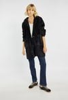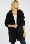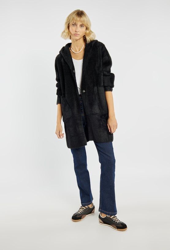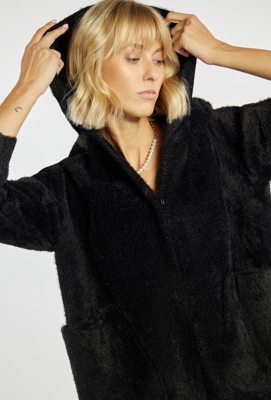 Długi sweter o prostym kroju z praktycznym kapturem i naszywanymi kieszeniami po bokach. Doskonale sprawdzi się jako wygodna alternatywa dla lekkiego płaszcza. Idealny na chłodniejsze dni, dodaje stylizacji przytulnego charakteru. Modelka na zdjęciu ma 177 cm wzrostu i prezentuje rozmiar S/M.