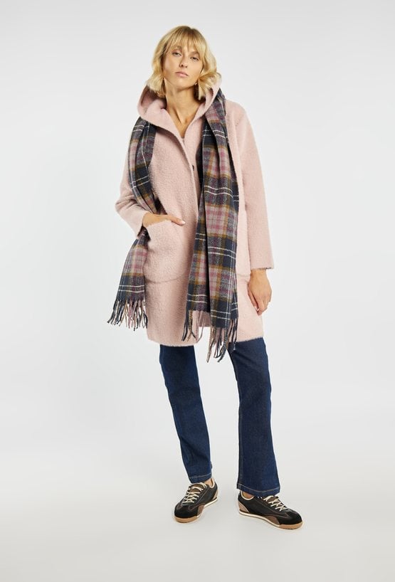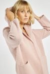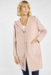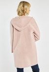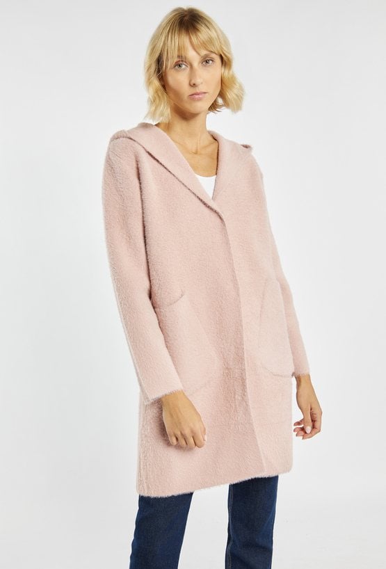 Długi sweter o prostym kroju z praktycznym kapturem i naszywanymi kieszeniami po bokach. Doskonale sprawdzi się jako wygodna alternatywa dla lekkiego płaszcza. Idealny na chłodniejsze dni, dodaje stylizacji przytulnego charakteru. Modelka na zdjęciu ma 177 cm wzrostu i prezentuje rozmiar S/M.
