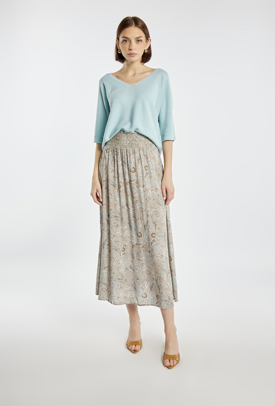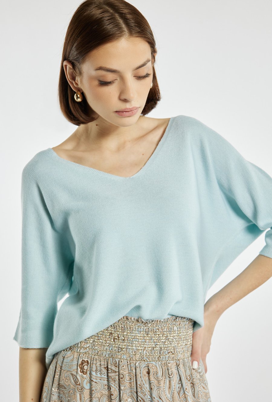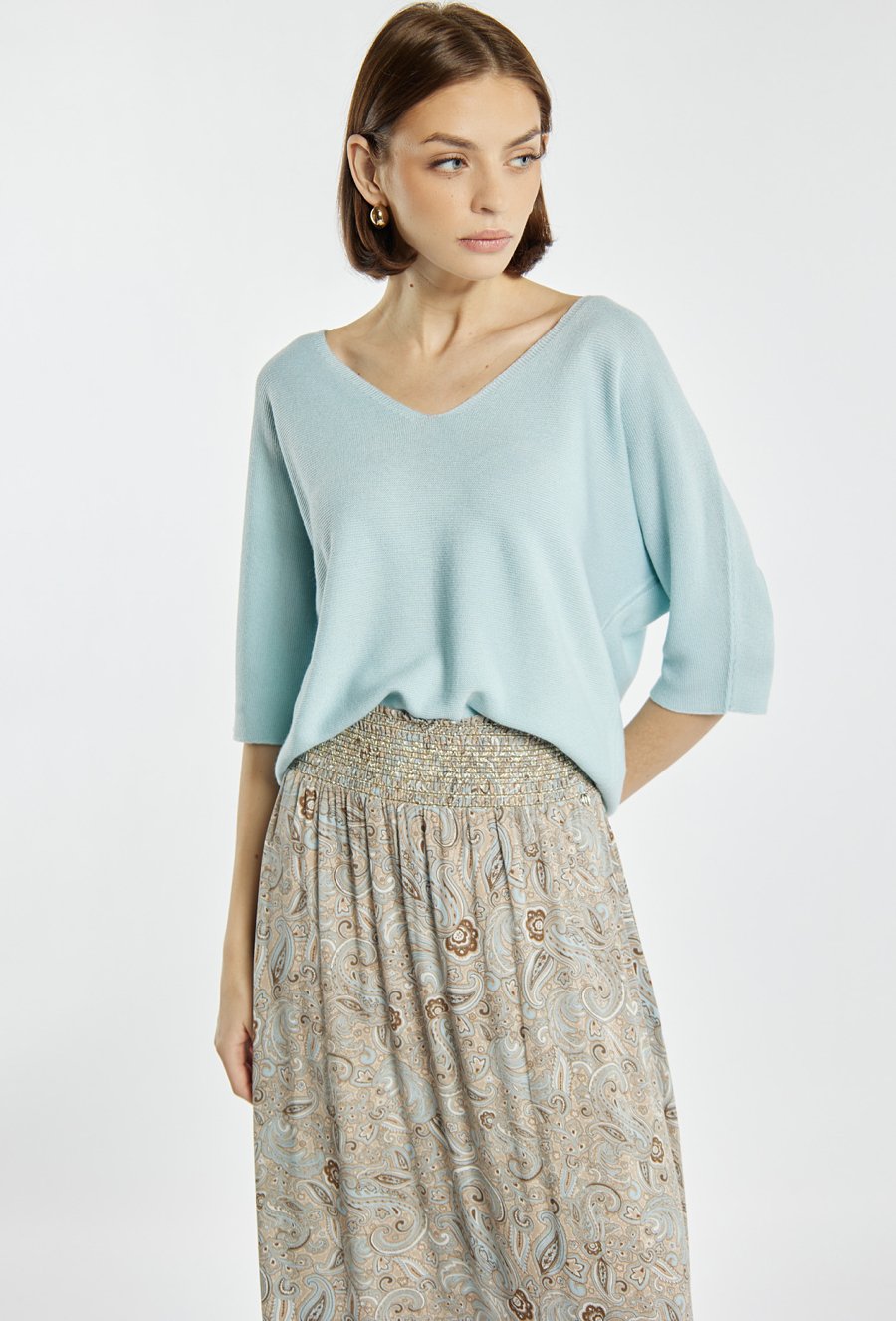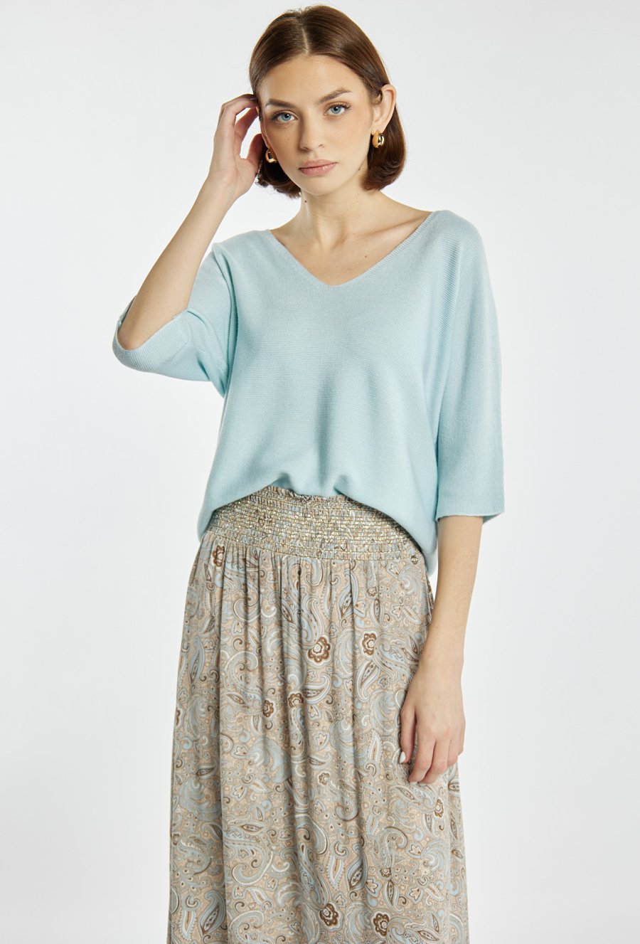 Sweter damski o swobodnym, komfortowym kroju. Model z dekoltem w kształcie litery V oraz rękawami o długości 3/4, które nadają całości lekkości i casualowego charakteru. Idealny do noszenia na co dzień. Modelka na zdjęciu ma 177 cm wzrostu i prezentuje rozmiar S.