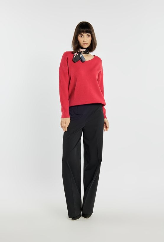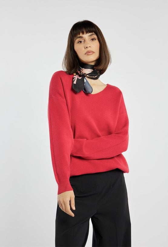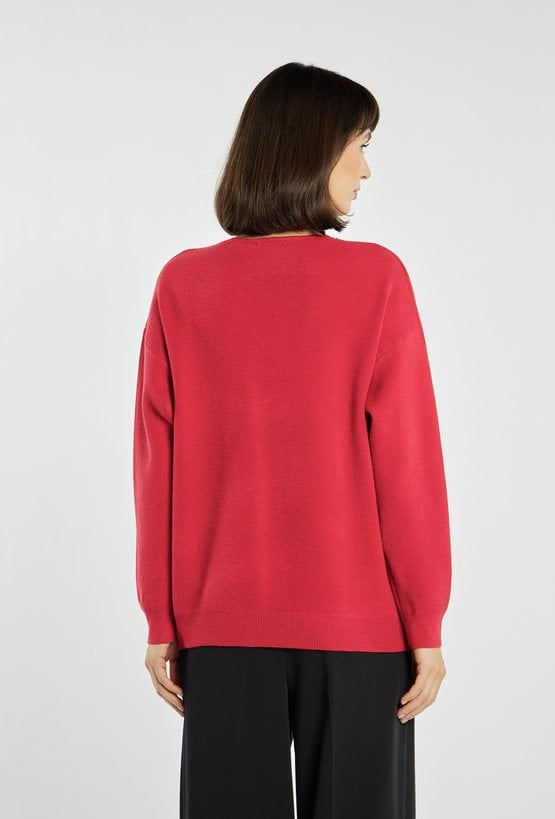 Sweter z dekoltem w serek o prostym, lekko oversize'owym kroju to doskonała baza do wielu stylizacji. Obniżona linia ramion nadaje mu nowoczesny, casualowy charakter, a minimalistyczna forma sprawia, że z łatwością dopasujesz go do spódnic, jeansów czy eleganckich spodni. Idealny wybór na co dzień i do pracy. Modelka na zdjęciu ma 177 cm wzrostu i prezentuje rozmiar S/M.