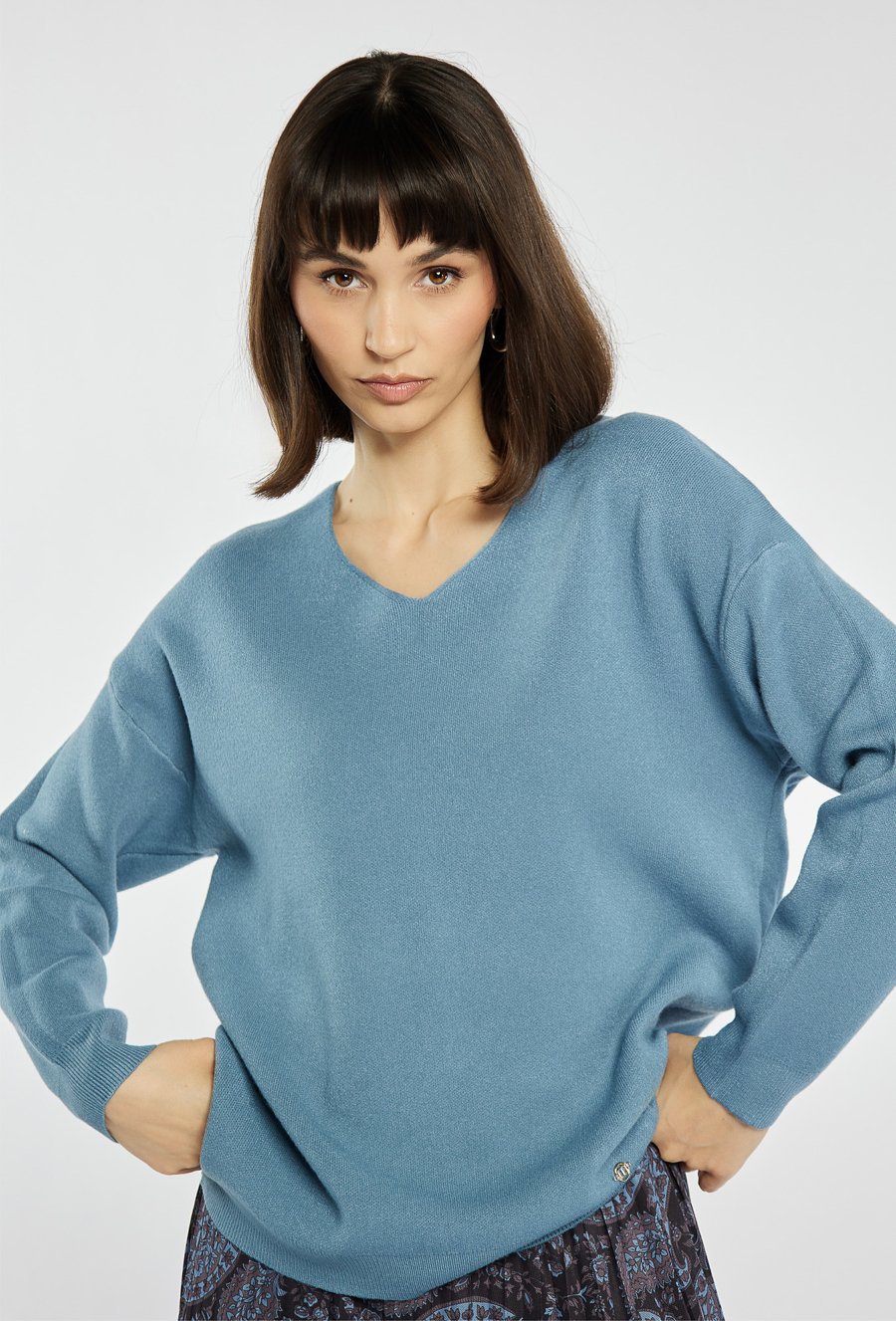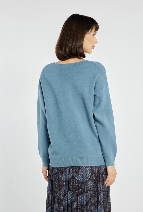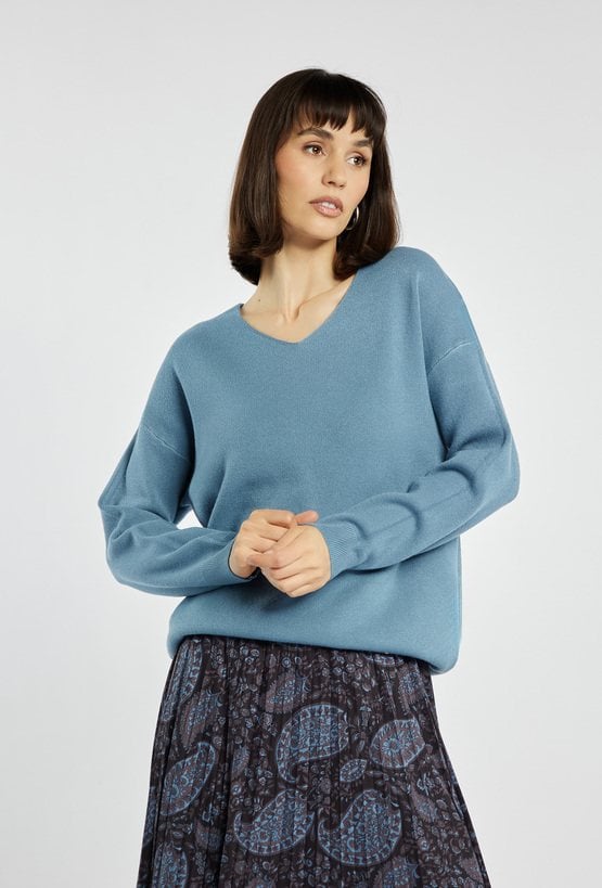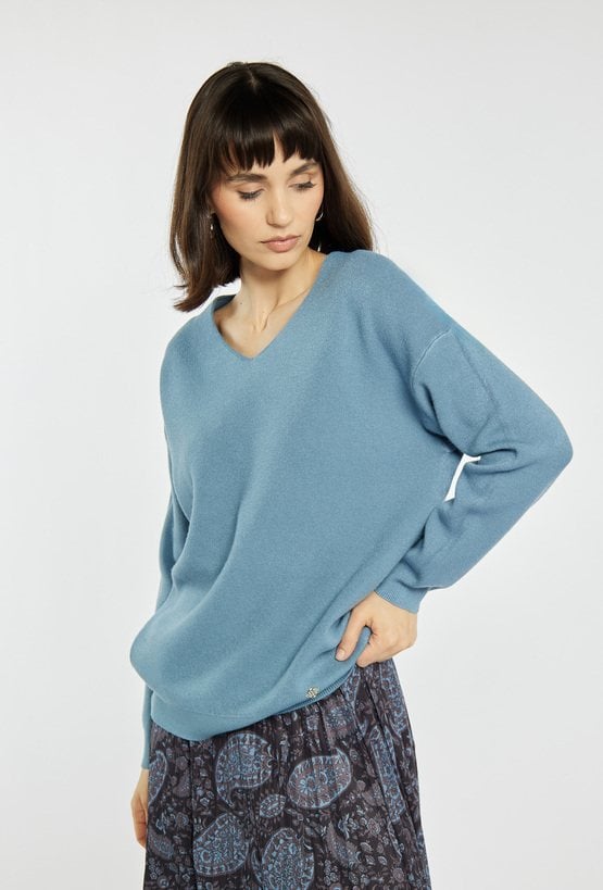 Sweter z dekoltem w serek o prostym, lekko oversize'owym kroju to doskonała baza do wielu stylizacji. Obniżona linia ramion nadaje mu nowoczesny, casualowy charakter, a minimalistyczna forma sprawia, że z łatwością dopasujesz go do spódnic, jeansów czy eleganckich spodni. Idealny wybór na co dzień i do pracy. Modelka na zdjęciu ma 177 cm wzrostu i prezentuje rozmiar S/M.