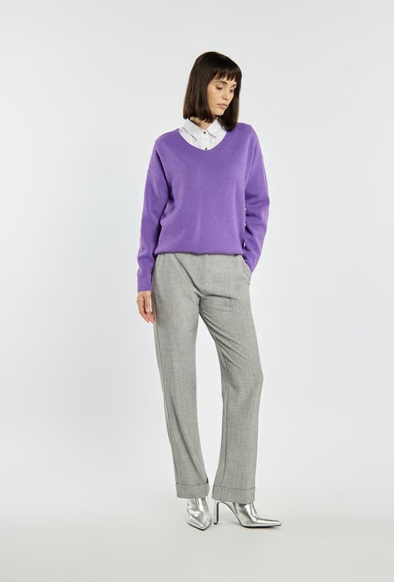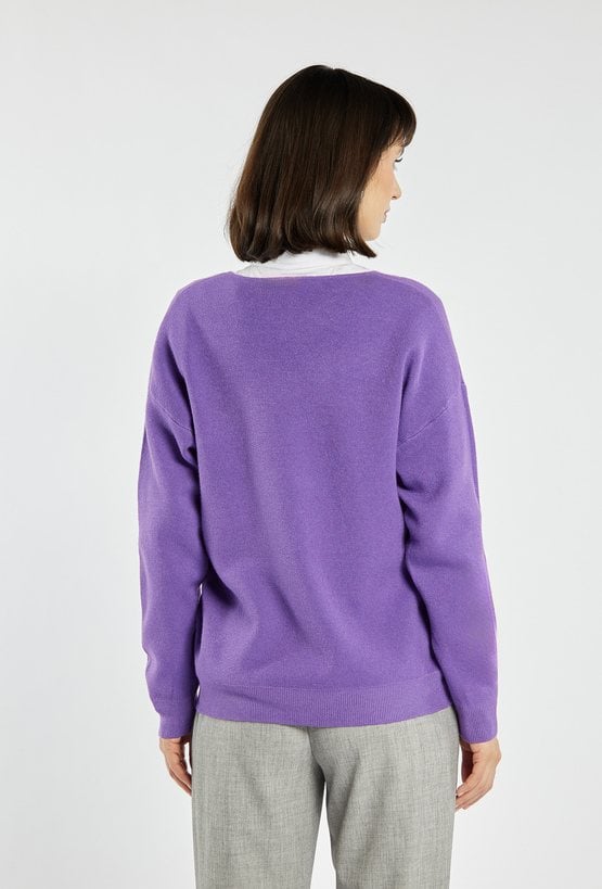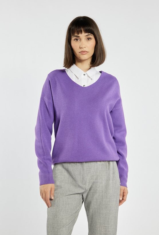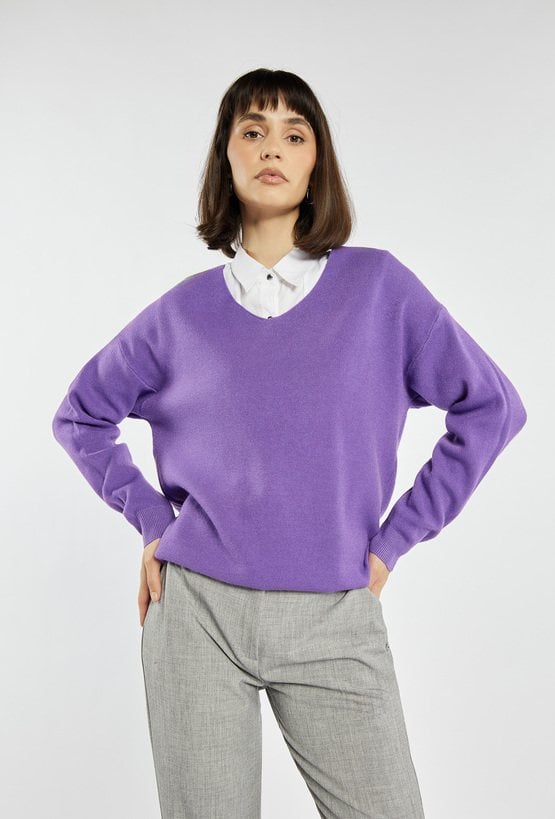 Sweter z dekoltem w serek o prostym, lekko oversize'owym kroju to doskonała baza do wielu stylizacji. Obniżona linia ramion nadaje mu nowoczesny, casualowy charakter, a minimalistyczna forma sprawia, że z łatwością dopasujesz go do spódnic, jeansów czy eleganckich spodni. Idealny wybór na co dzień i do pracy. Modelka na zdjęciu ma 177 cm wzrostu i prezentuje rozmiar S/M.