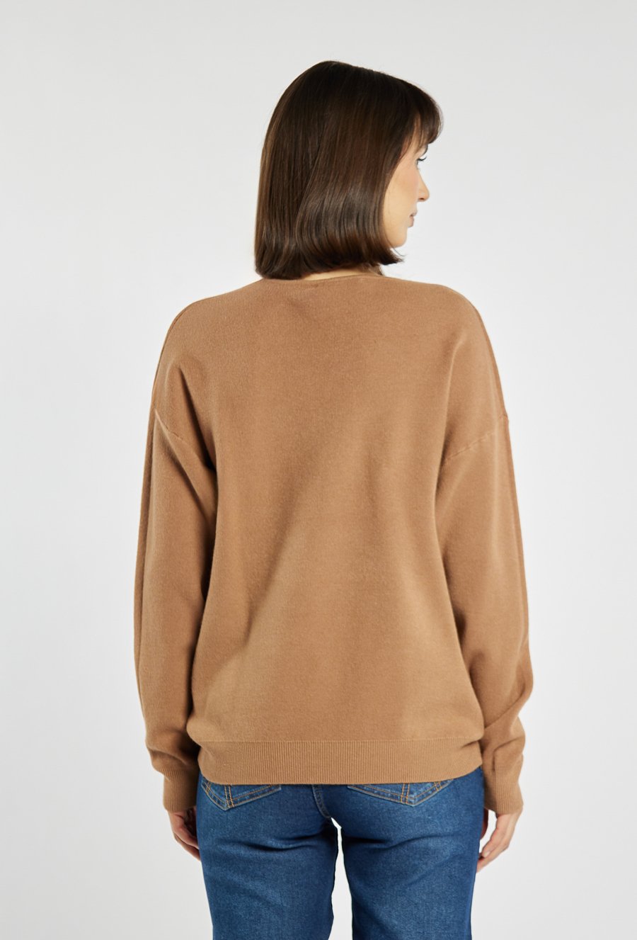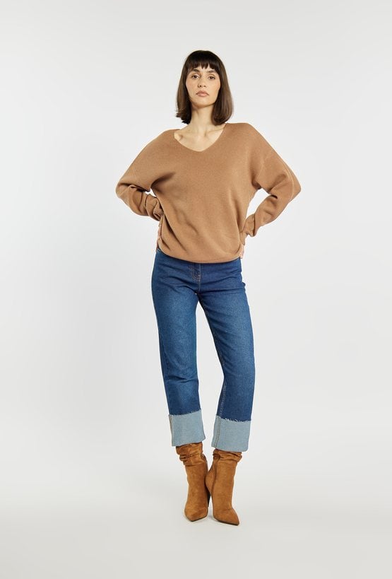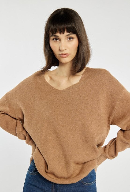 Sweter z dekoltem w serek o prostym, lekko oversize'owym kroju to doskonała baza do wielu stylizacji. Obniżona linia ramion nadaje mu nowoczesny, casualowy charakter, a minimalistyczna forma sprawia, że z łatwością dopasujesz go do spódnic, jeansów czy eleganckich spodni. Idealny wybór na co dzień i do pracy. Modelka na zdjęciu ma 177 cm wzrostu i prezentuje rozmiar S/M.