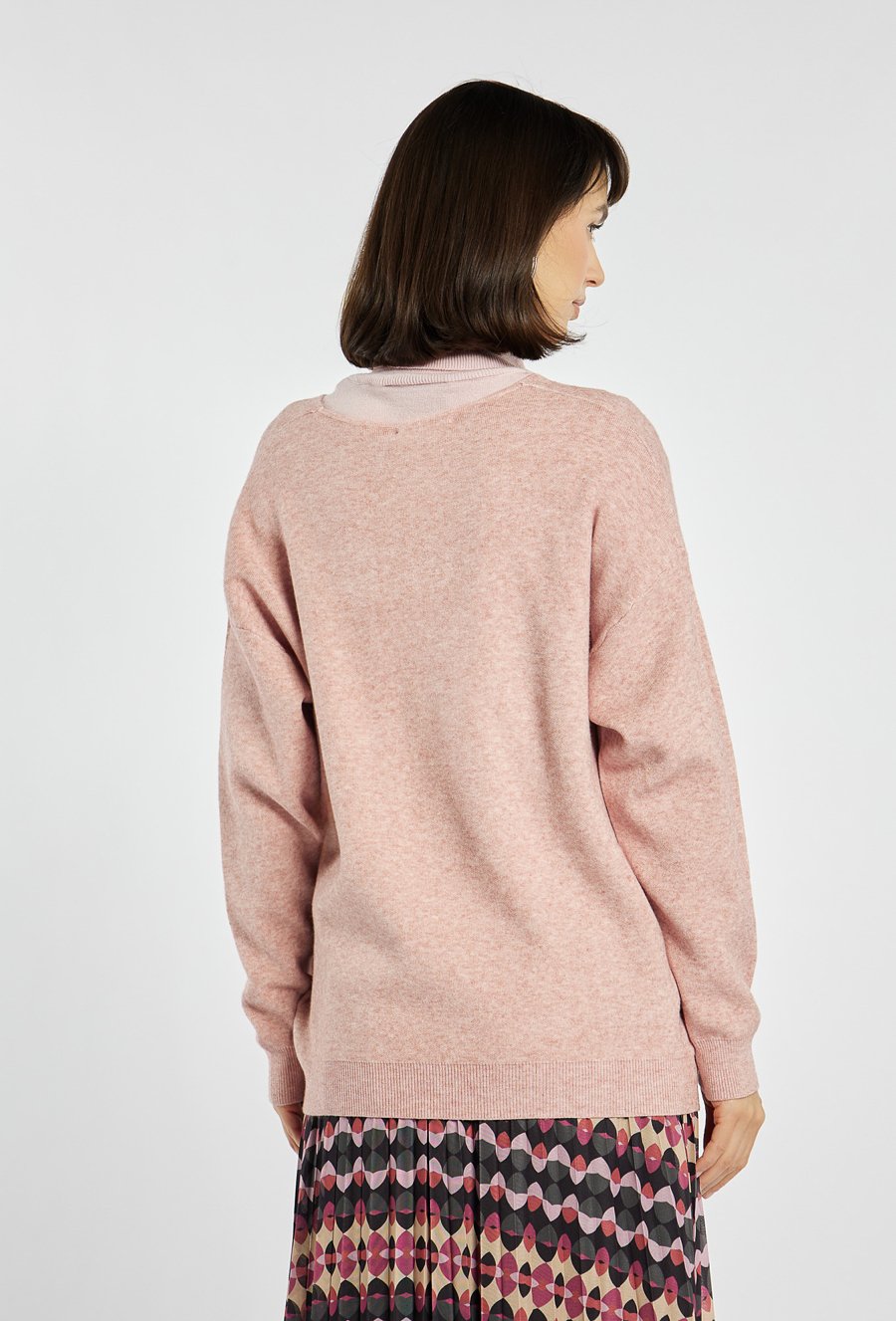 Sweter z dekoltem w serek o prostym, lekko oversize'owym kroju to doskonała baza do wielu stylizacji. Obniżona linia ramion nadaje mu nowoczesny, casualowy charakter, a minimalistyczna forma sprawia, że z łatwością dopasujesz go do spódnic, jeansów czy eleganckich spodni. Idealny wybór na co dzień i do pracy. Modelka na zdjęciu ma 177 cm wzrostu i prezentuje rozmiar S/M.