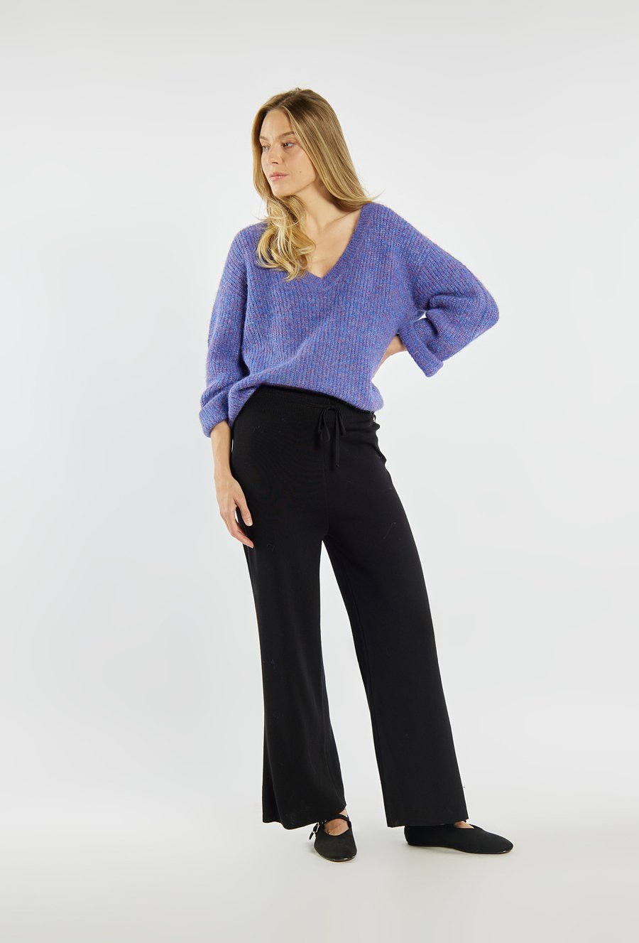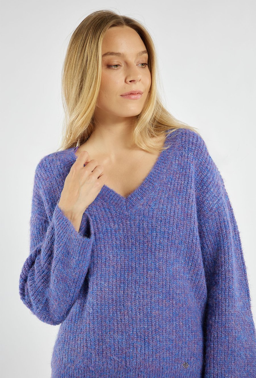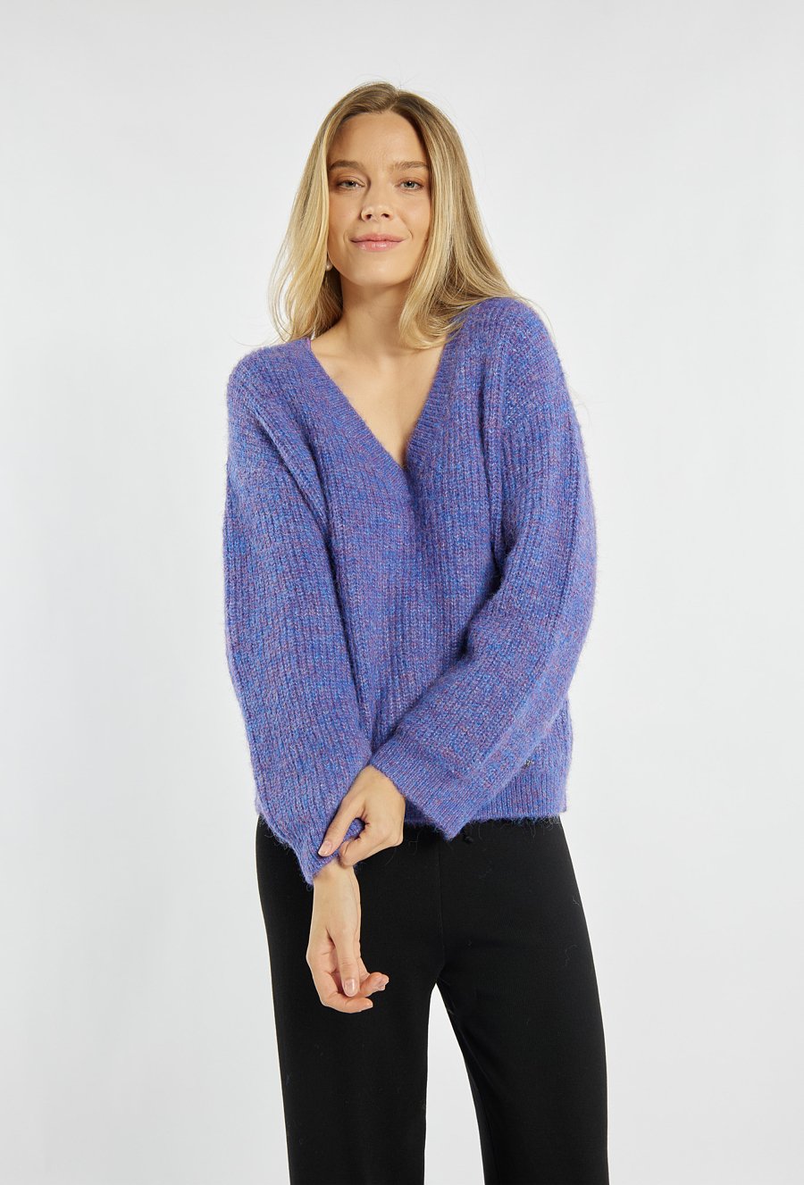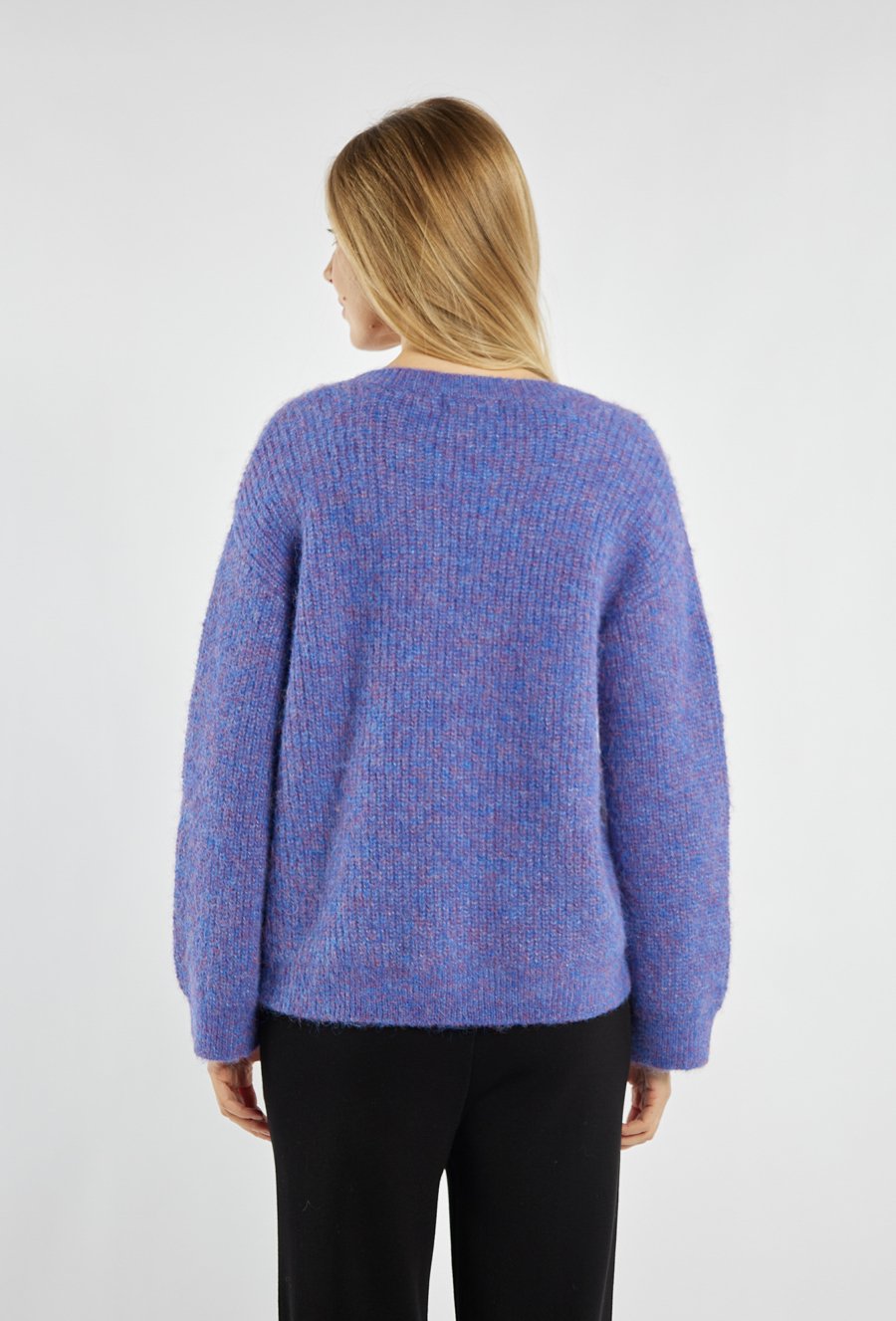 Sweter damski o luźnym fasonie z dekoltem w kształcie litery „V”. Model ten to uniwersalny model, który doskonale sprawdzi się w codziennych stylizacjach – zarówno z eleganckimi spodniami, jak i ulubionymi jeansami. Modelka na zdjęciu ma 177 cm wzrostu i prezentuje rozmiar S.