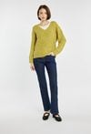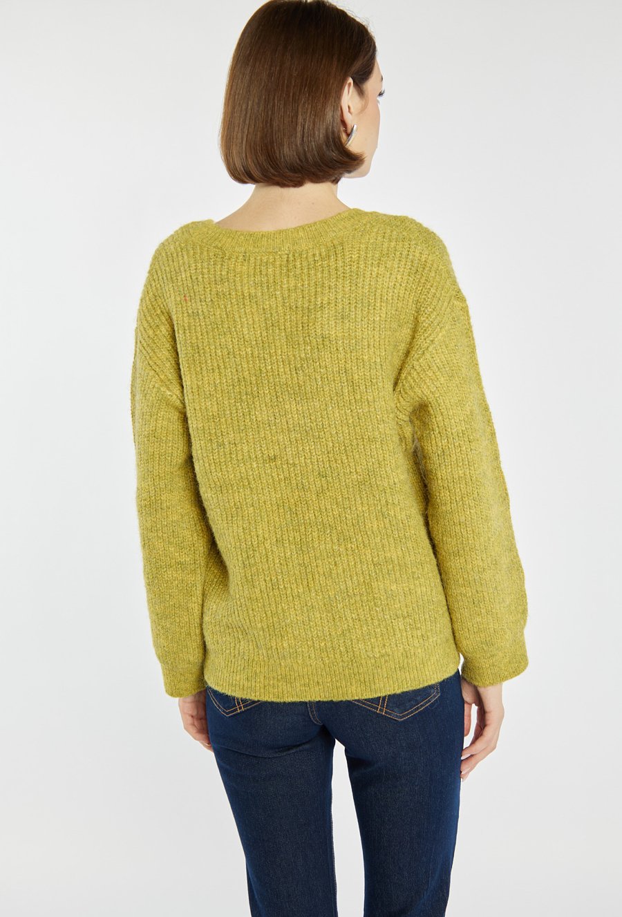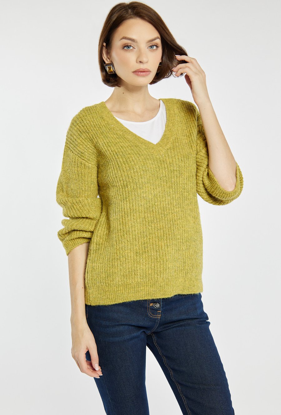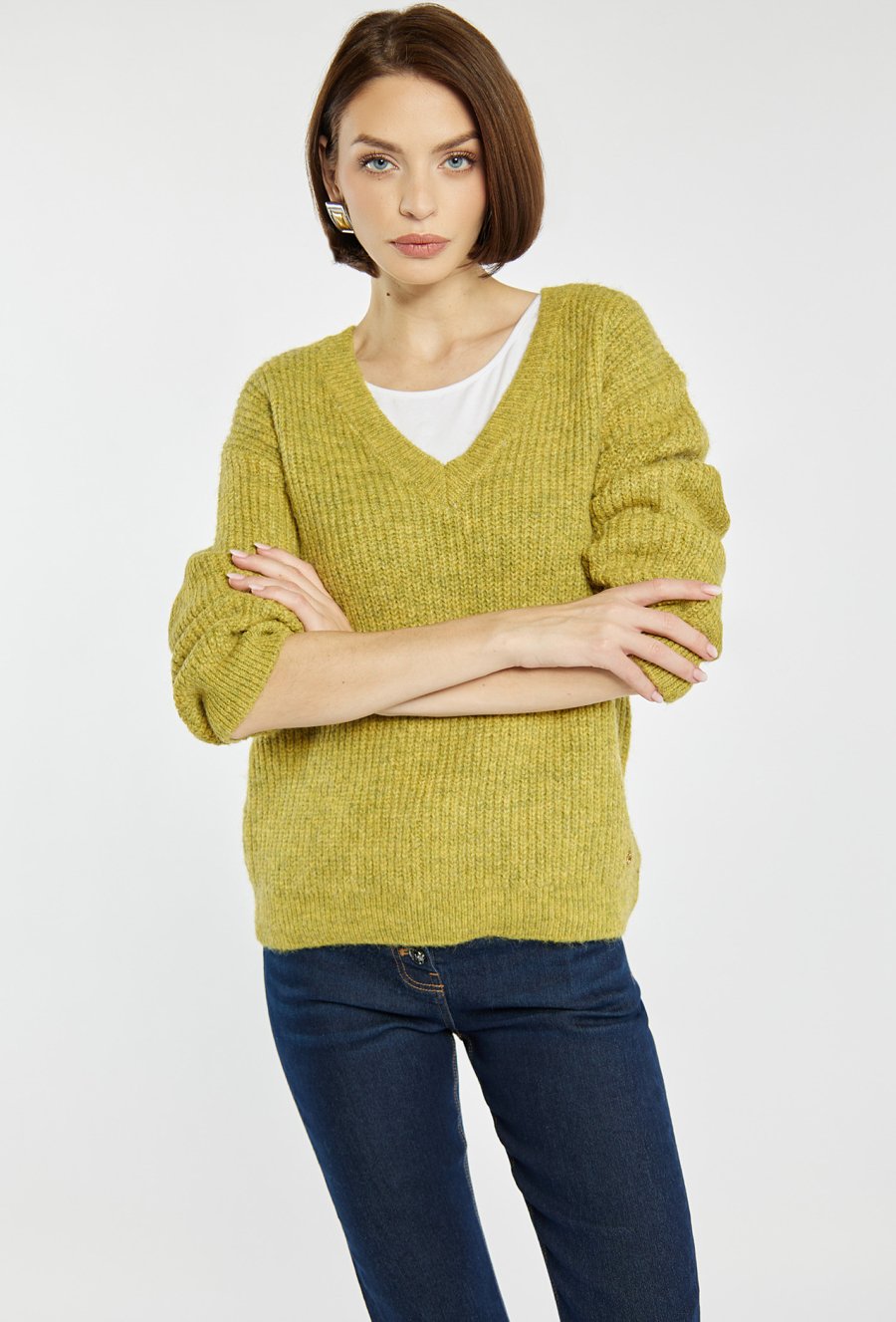 Sweter damski o luźnym fasonie z dekoltem w kształcie litery „V”. Model ten to uniwersalny model, który doskonale sprawdzi się w codziennych stylizacjach – zarówno z eleganckimi spodniami, jak i ulubionymi jeansami. Modelka na zdjęciu ma 177 cm wzrostu i prezentuje rozmiar S.