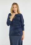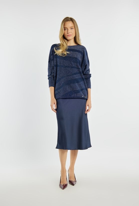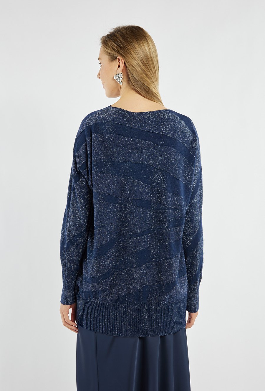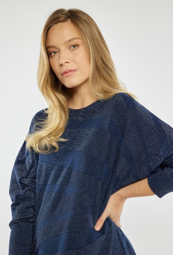 Sweter o luźnym kroju z obniżoną linią ramion. Subtelny, nieregularny wzór nadaje mu nowoczesnego charakteru. Idealny do eleganckich i codziennych stylizacji, zapewnia wygodę i stylowy wygląd. Modelka na zdjęciu ma 177 cm wzrostu i prezentuje rozmiar S/M.