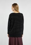 Sweter o luźnym kroju z obniżoną linią ramion. Subtelny, nieregularny wzór nadaje mu nowoczesnego charakteru. Idealny do eleganckich i codziennych stylizacji, zapewnia wygodę i stylowy wygląd. Modelka na zdjęciu ma 177 cm wzrostu i prezentuje rozmiar S/M.