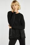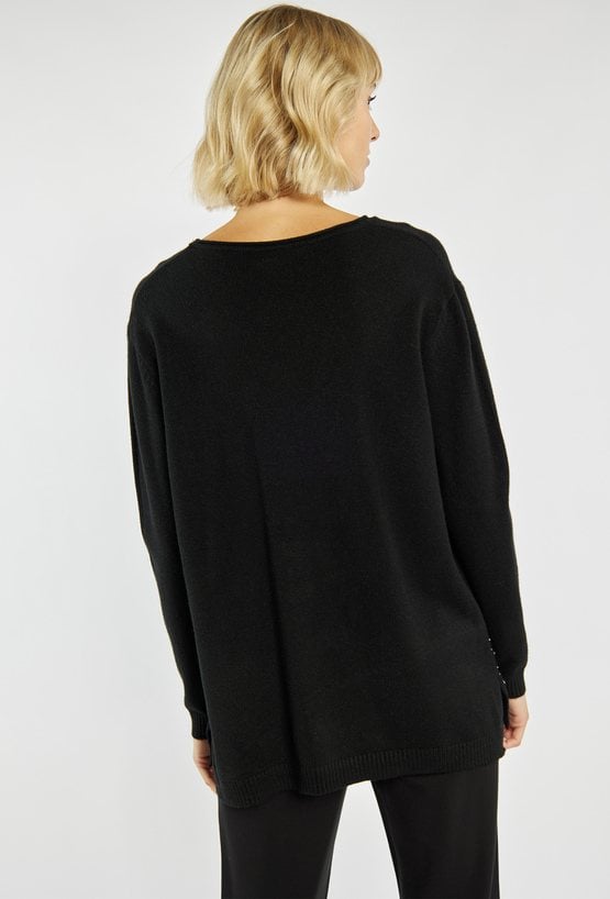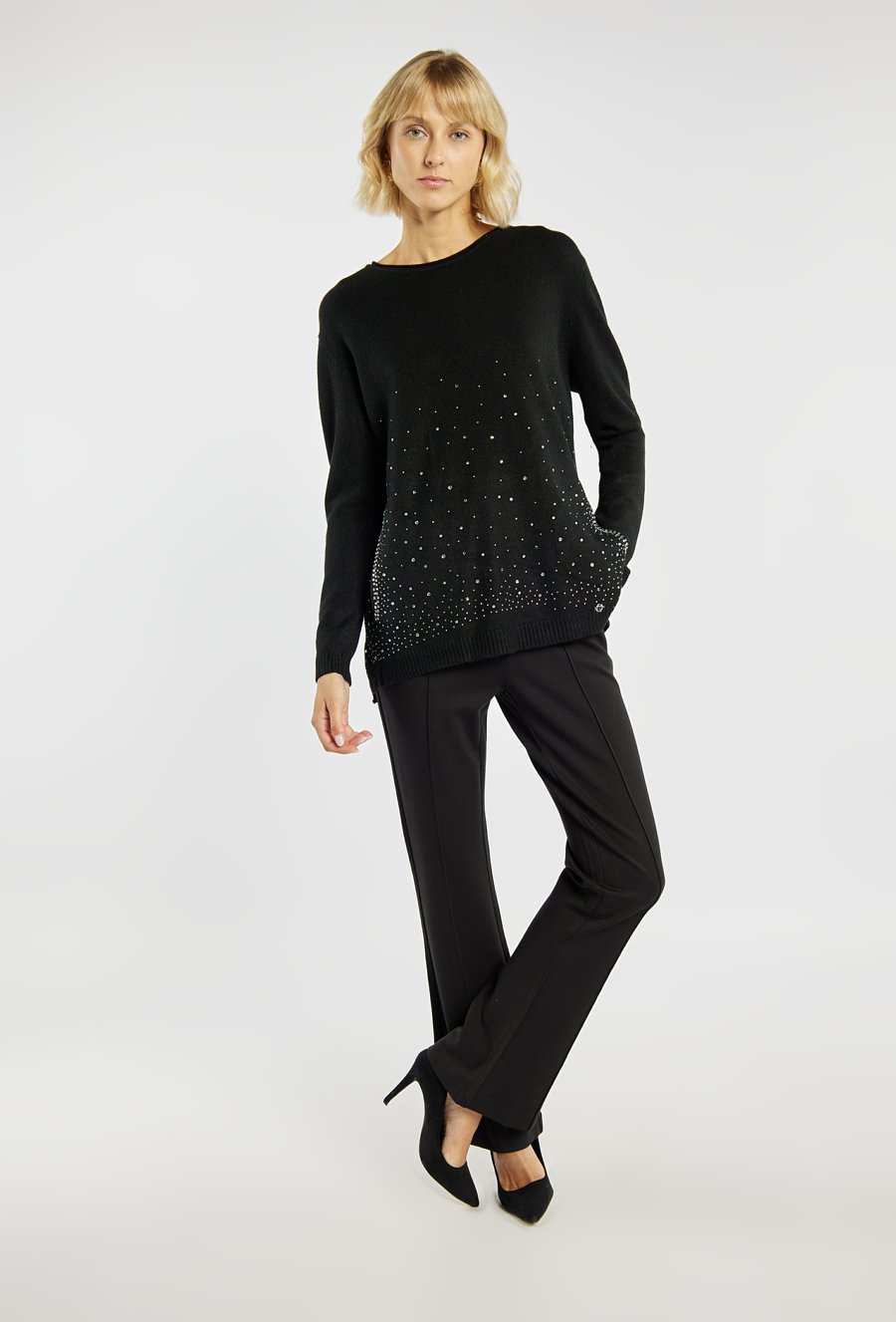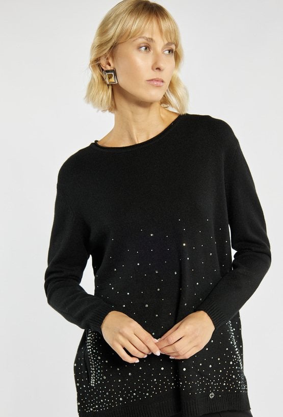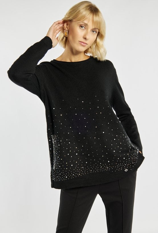 Elegancki sweter o prostym kroju, ozdobiony drobnymi aplikacjami w dolnej części, które nadają mu subtelnego blasku. Sweter z okrągłym dekoltem i długimi rękawami. Idealny wybór na co dzień i na wyjątkowe okazje, również w okresie świątecznym. Modelka na zdjęciu ma 177 cm wzrostu i prezentuje rozmiar S/M