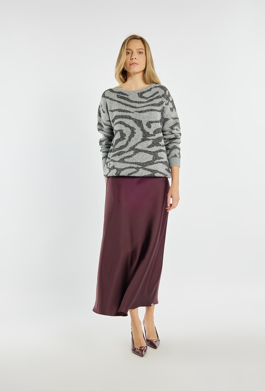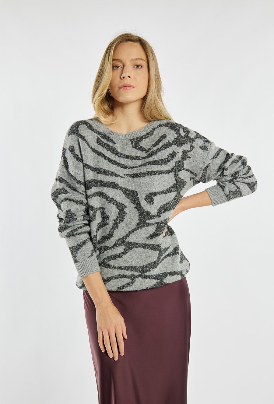 Sweter z połyskującym wzorem o abstrakcyjnym motywie. Subtelny błysk dodaje mu elegancji, a luźniejszy fason zapewnia wygodę i swobodę ruchów. Idealny wybór na co dzień i na specjalne okazje. Modelka na zdjęciu ma 177 cm wzrostu i prezentuje rozmiar S.
