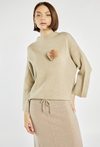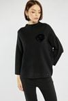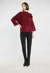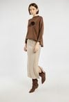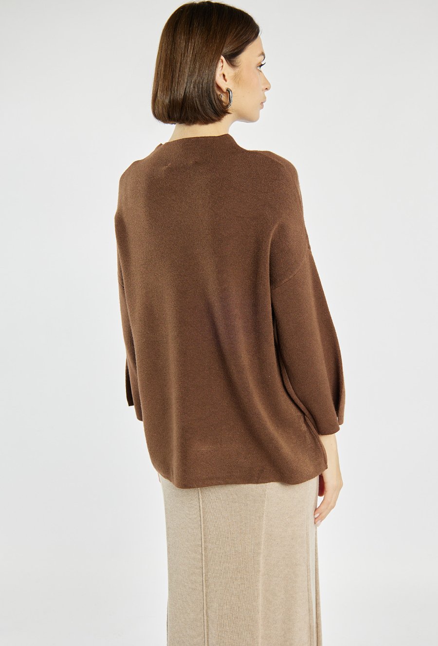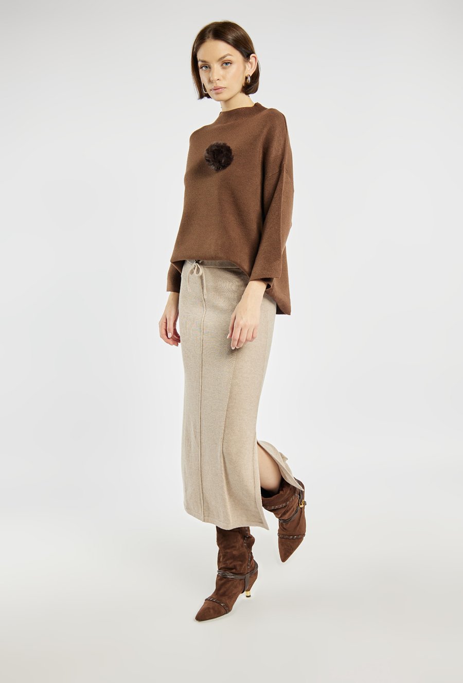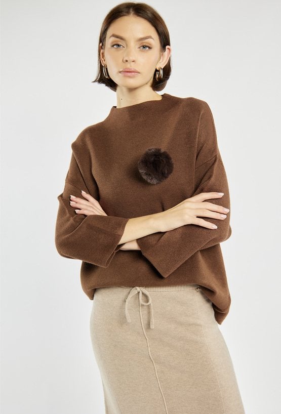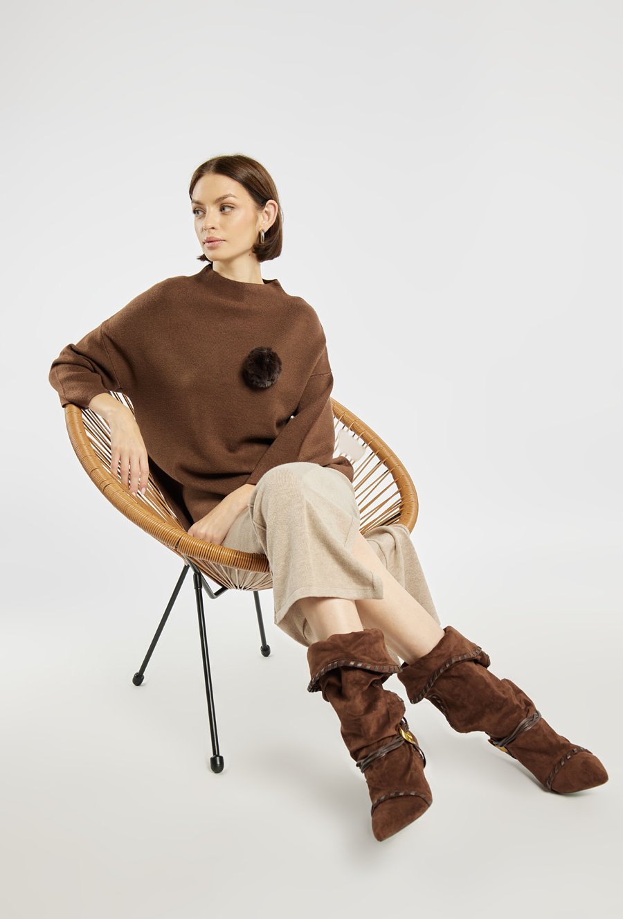 Sweter damski o luźnym kroju z delikatnie obniżoną linią ramion. Sweter ozdobiony efektownym, odpinanym pomponem przypinanym na agrafkę. Świetny wybór na sezon jesienno-zimowy. Modelka na zdjęciu ma 177 cm wzrostu i prezentuje rozmiar S/M.