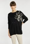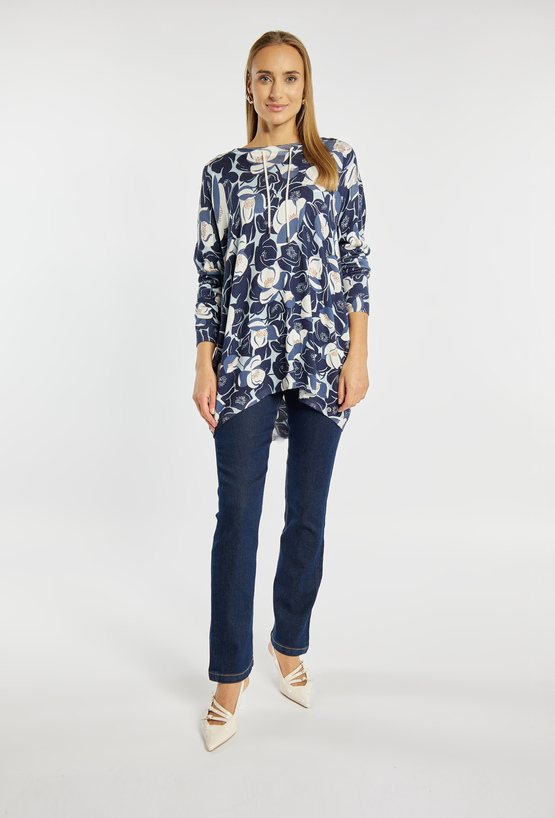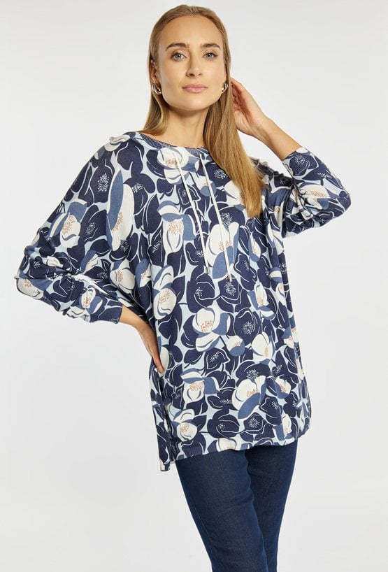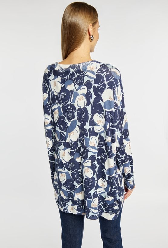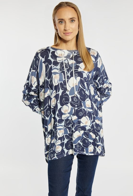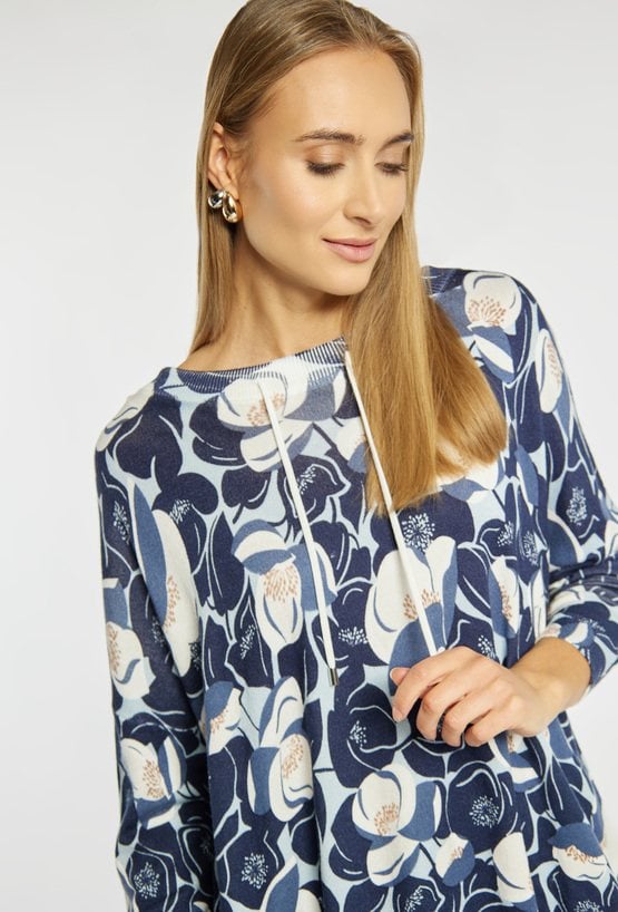 Sweter damski o luźnym, komfortowym kroju z efektownym wzorem. Model uzupełniają troczki przy dekolcie, dodające sportowego akcentu. Idealna do jeansów i prostych spodni. Sweter świetnie nosi się na co dzień. Modelka na zdjęciu ma 177 cm wzrostu i prezentuje rozmiar S.