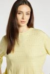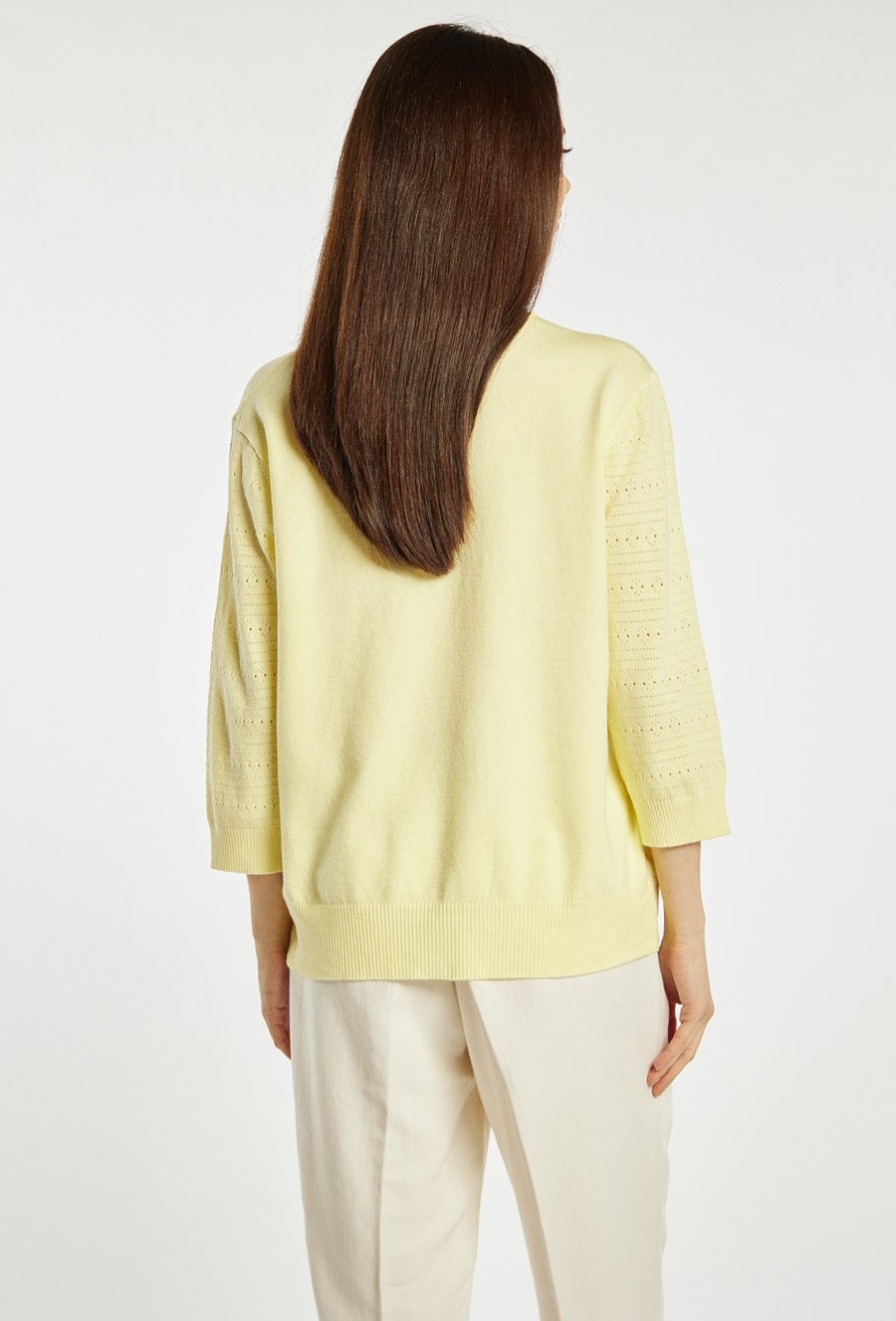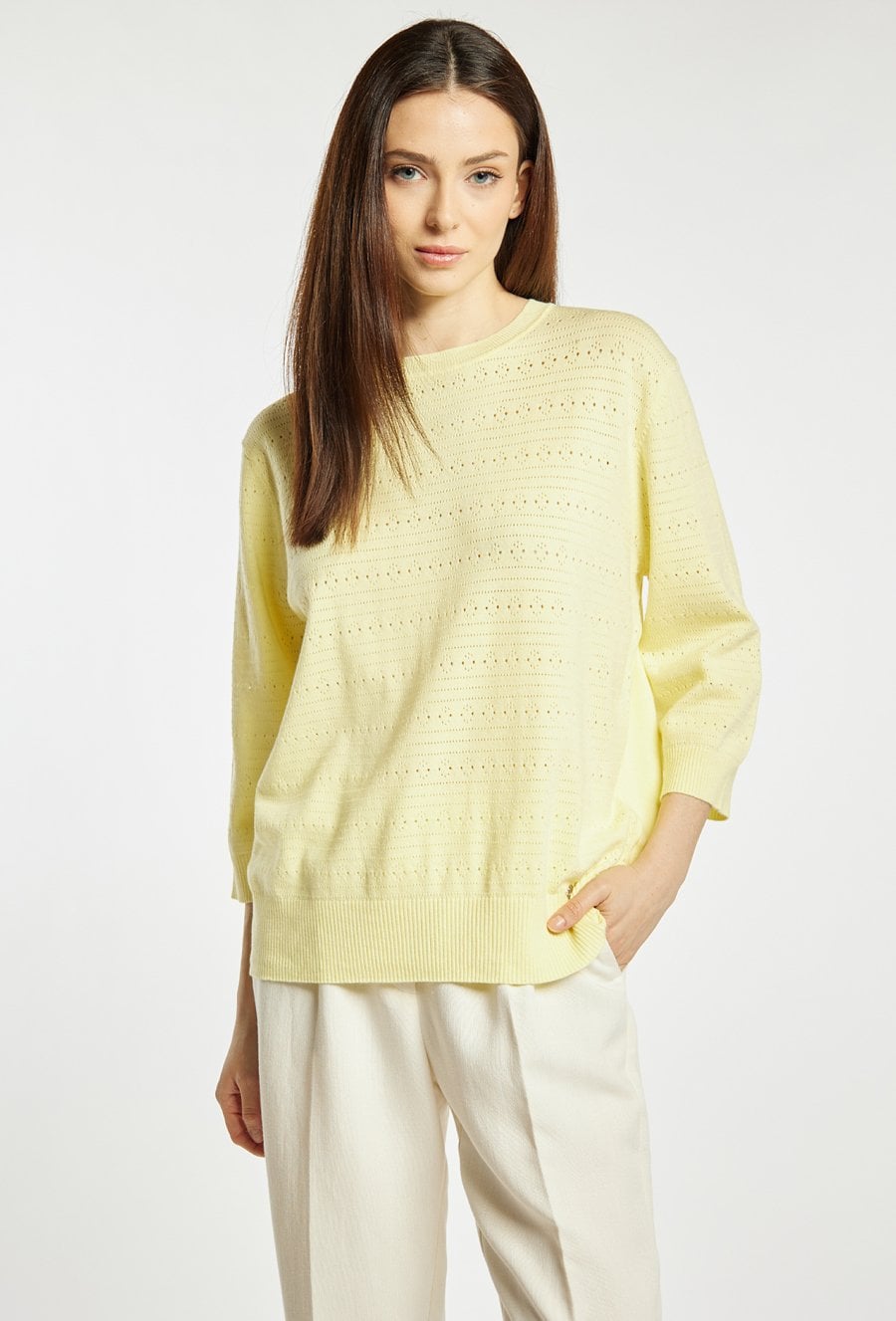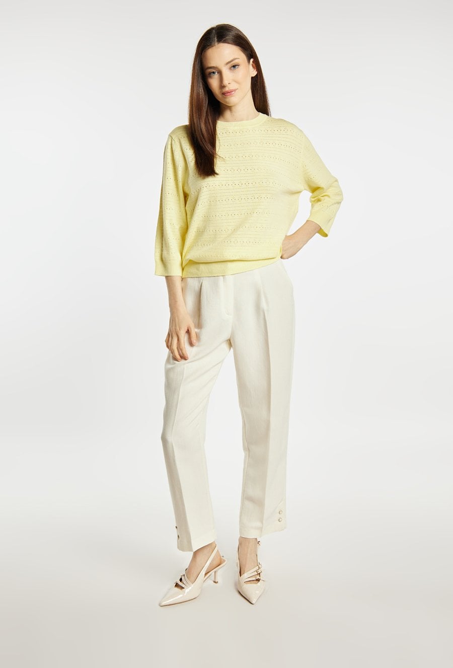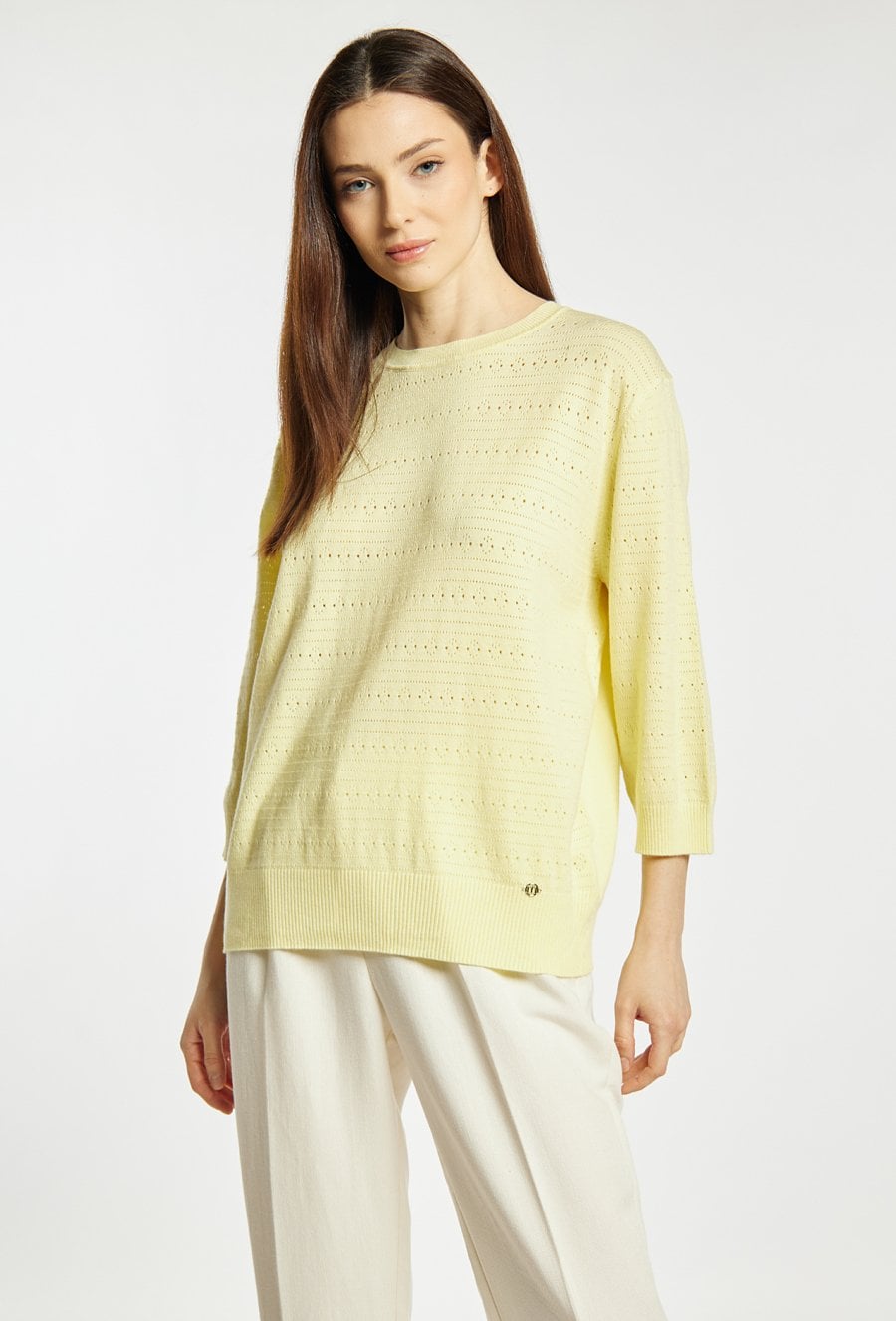 Sweter damski o klasycznym, uniwersalnym kroju. Model z długim rękawem oraz półokrągłym dekoltem. Ażurowy splot w subtelne, poziome wzory nadaje całości lekkości i eleganckiego charakteru. Damski sweter doskonale sprawdzi się w codziennych oraz bardziej stylowych stylizacjach. Modelka na zdjęciu ma 177 cm wzrostu i prezentuje rozmiar S/M.