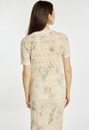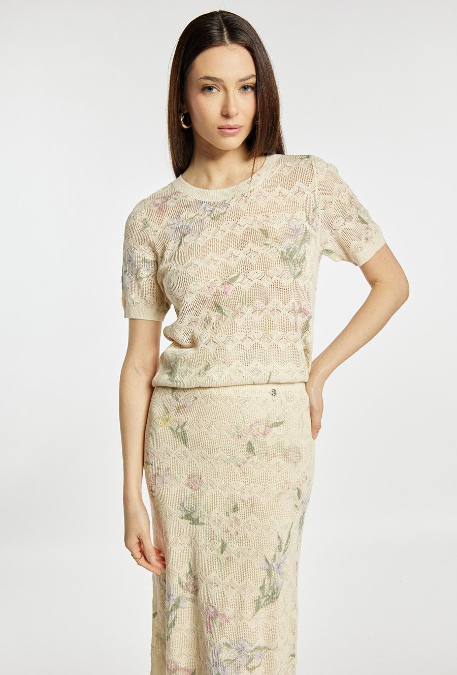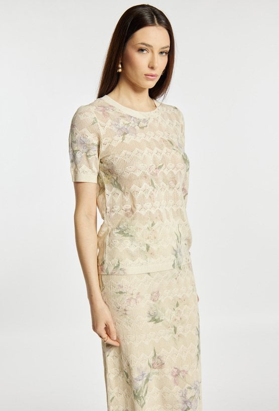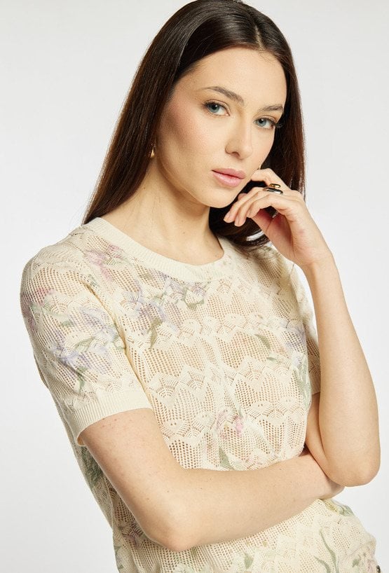 Sweter damski o prostym, klasycznym kroju, ażurowy, z delikatnym, kwiatowym wzorem. Model z krótkim rękawem i okrągłym dekoltem, który zapewnia komfort noszenia i lekkość stylizacji. Sweter miękko układa się na sylwetce i sprawdzi się zarówno w codziennych zestawach, jak i w bardziej eleganckim wydaniu. Można go zestawić ze spódnicą, tworząc spójną, kobiecą stylizację. Kod do spódnicy: 26L-SKR0400. Modelka na zdjęciu ma 177 cm wzrostu i prezentuje rozmiar S.
