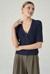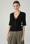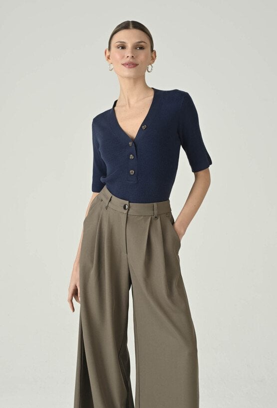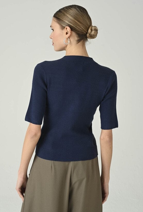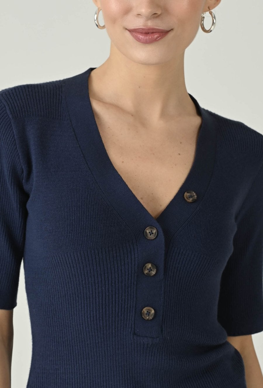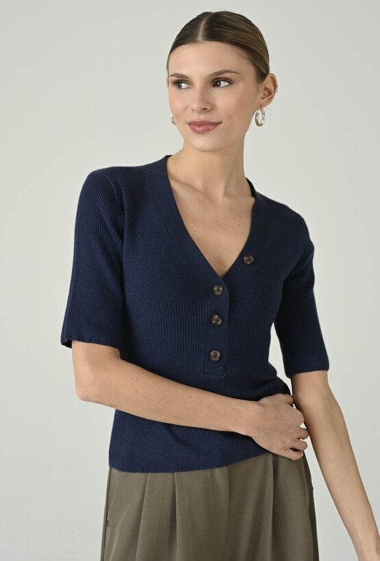 Miękki dzianinowy sweterek z dodatkiem wiskozy, łączący wygodę z eleganckim stylem. Dekolt w literę V subtelnie podkreśla szyję, a rękawy do łokcia nadają lekkości i swobody ruchów. Ozdobne guziki przy dekolcie dodają charakteru i modowego detalu. Dostępny w trzech stonowanych wersjach kolorystycznych, które łatwo dopasujesz do swojej garderoby. Idealny do codziennych i bardziej eleganckich stylizacji. Modelka na zdjęciu ma 177 cm wzrostu i prezentuje rozmiar 36.