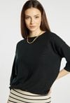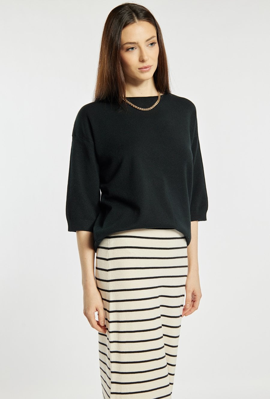 Sweter damski o prostym, minimalistycznym kroju. Model z rękawem o długości 3/4 oraz klasycznym, półokrągłym dekoltem. Gładka dzianina i swobodna forma zapewniają komfort noszenia oraz ponadczasowy charakter. Damski sweter basic doskonale sprawdzi się w codziennych stylizacjach. Modelka na zdjęciu ma 177 cm wzrostu i prezentuje rozmiar S/M.
