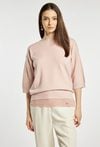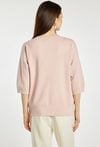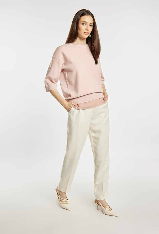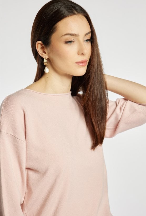 Sweter damski o prostym, minimalistycznym kroju. Model z rękawem o długości 3/4 oraz klasycznym, półokrągłym dekoltem. Gładka dzianina i swobodna forma zapewniają komfort noszenia oraz ponadczasowy charakter. Damski sweter basic doskonale sprawdzi się w codziennych stylizacjach. Modelka na zdjęciu ma 177 cm wzrostu i prezentuje rozmiar S/M.
