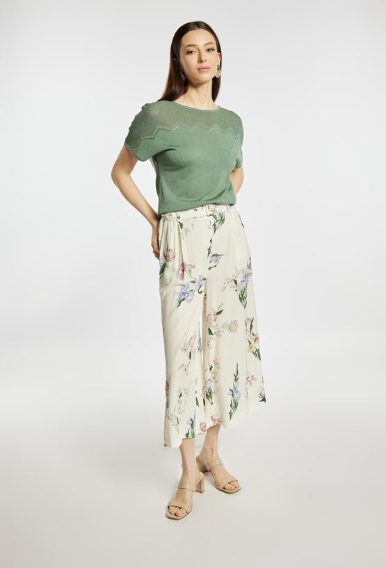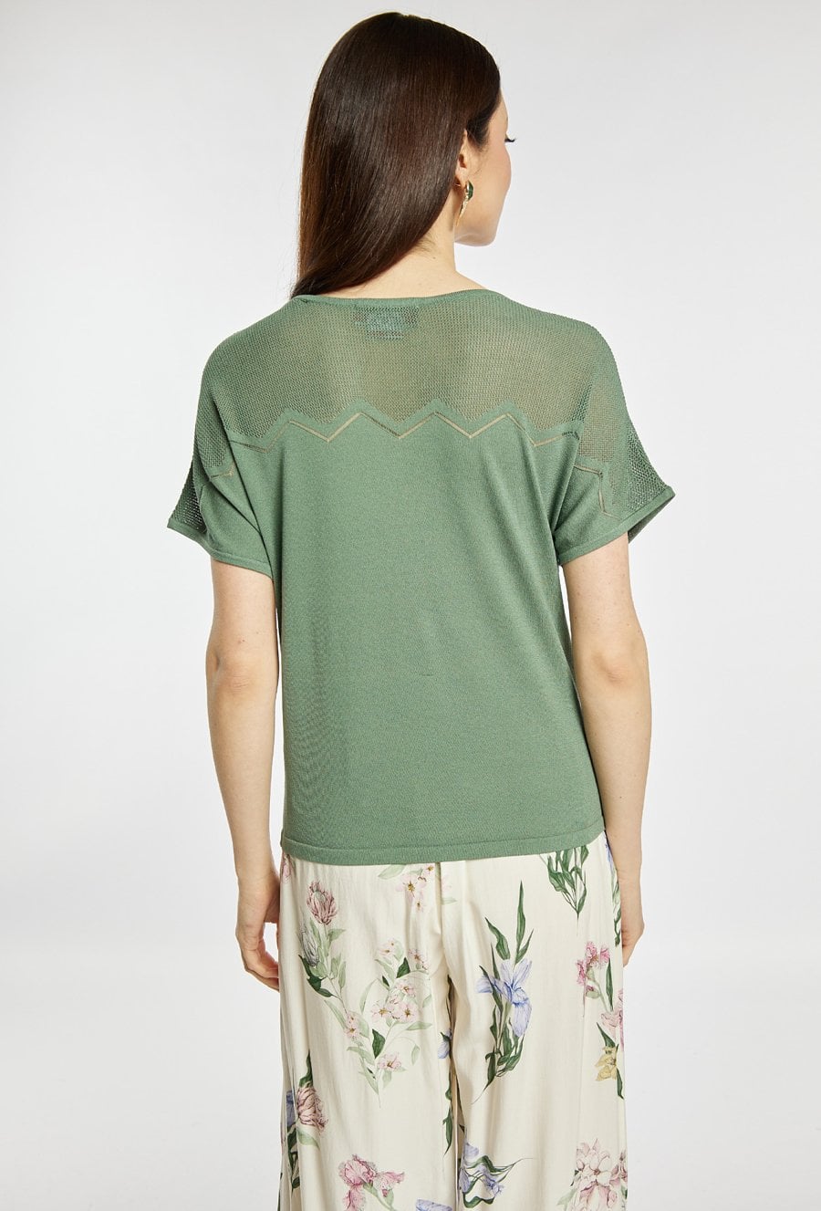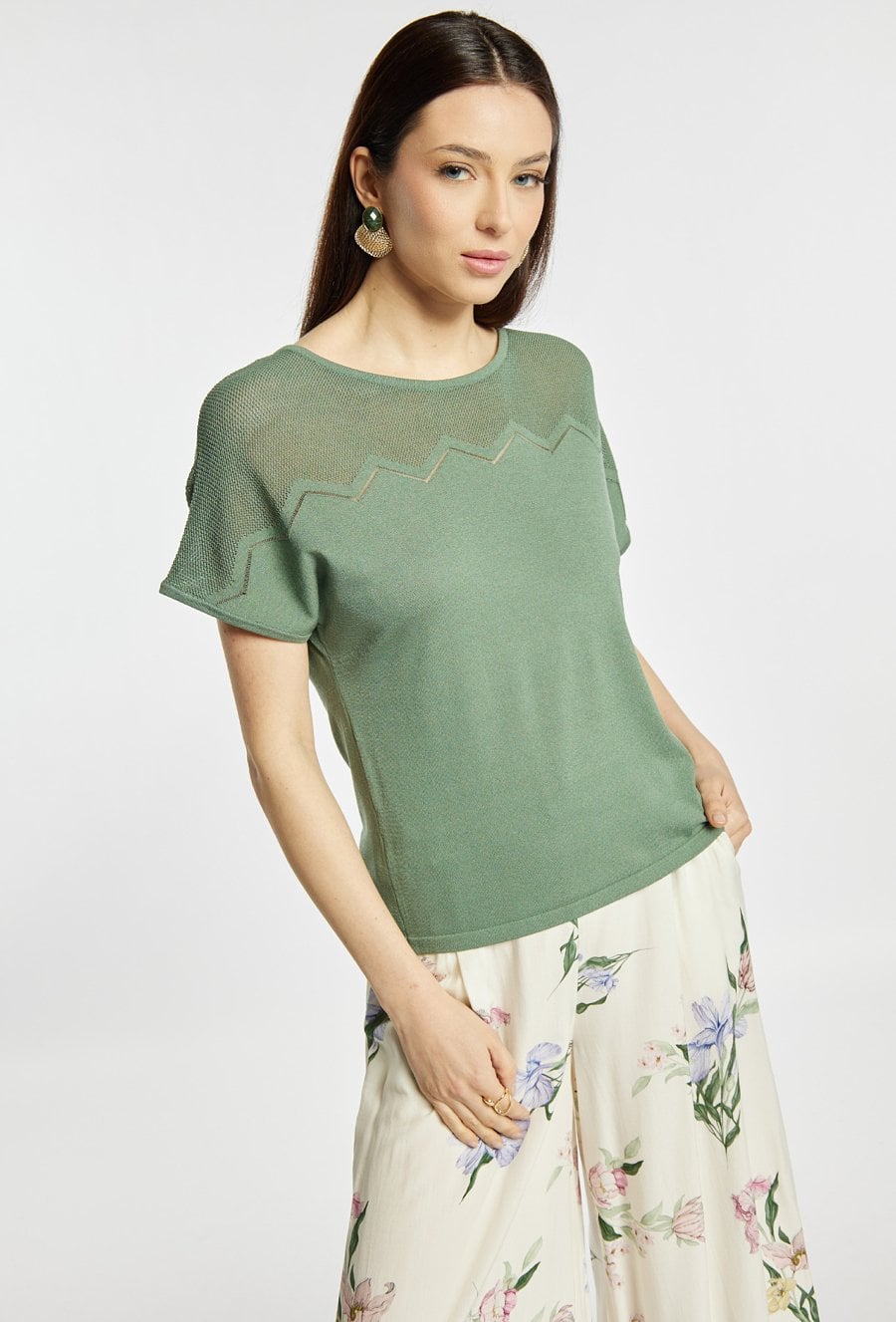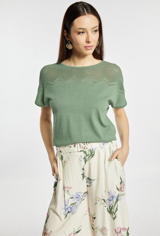 Sweter damski o prostym, klasycznym kroju. Model z krótkim rękawem oraz okrągłym dekoltem, ozdobiony subtelnym, geometrycznym wzorem w górnej części. Sweter świetnie sprawdzi się w codziennych stylizacjach, zarówno w zestawieniu ze spodniami, jak i spódnicą. Modelka na zdjęciu ma 177 cm wzrostu i prezentuje rozmiar S.
