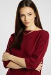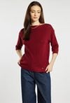 Sweter damski o klasycznym, minimalistycznym kroju. Model z rękawem o długości 3/4 oraz delikatnym, łódkowym dekoltem, który subtelnie podkreśla linię ramion. Damski sweter basic doskonale sprawdzi się w codziennych oraz bardziej eleganckich stylizacjach. Modelka na zdjęciu ma 177 cm wzrostu i prezentuje rozmiar S/M.