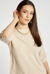 Sweter damski o klasycznym, minimalistycznym kroju. Model z rękawem o długości 3/4 oraz delikatnym, łódkowym dekoltem, który subtelnie podkreśla linię ramion. Damski sweter basic doskonale sprawdzi się w codziennych oraz bardziej eleganckich stylizacjach. Modelka na zdjęciu ma 177 cm wzrostu i prezentuje rozmiar S/M.