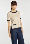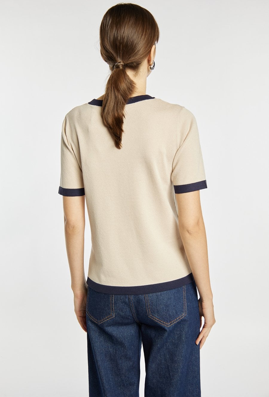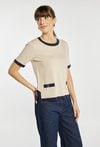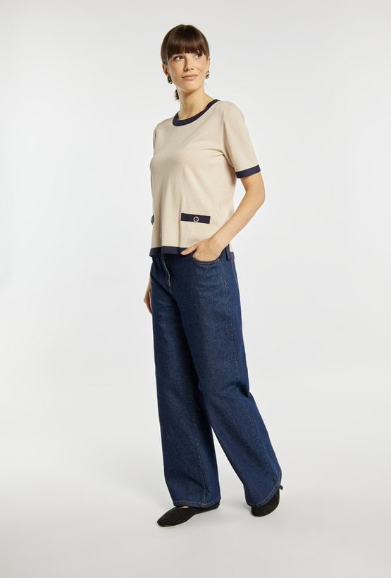 Sweter damski o krótszym kroju, idealny do jeansów i spódnic z wyższym stanem. Kontrastowe wykończenia przy dekolcie, rękawach i dole dodają mu eleganckiego, marynistycznego charakteru. Dekoracyjne patki z metalowymi detalami subtelnie urozmaicają całość, tworząc dopracowany i nowoczesny look. Modelka na zdjęciu ma 177 cm wzrostu i prezentuje rozmiar S.