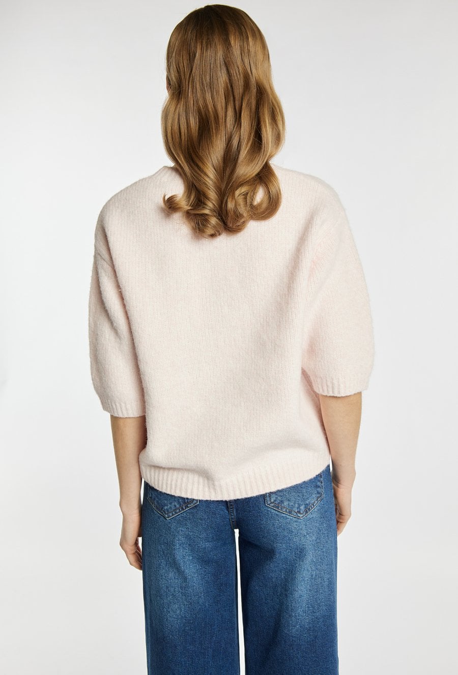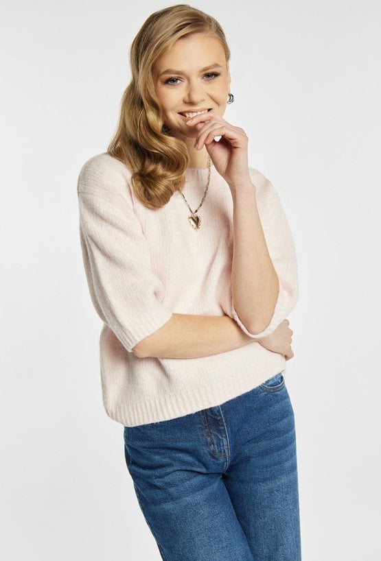 Sweter damski o miękkiej, przyjemnej w dotyku fakturze w jasnym, pastelowym odcieniu. Sweter ma krótkie, lekko bufiaste rękawy oraz klasyczny, okrągły dekolt. Sweter świetnie sprawdzi się w codziennych stylizacjach, dodając im lekkości i subtelnej elegancji. Modelka na zdjęciu ma 177 cm wzrostu i prezentuje rozmiar S.