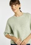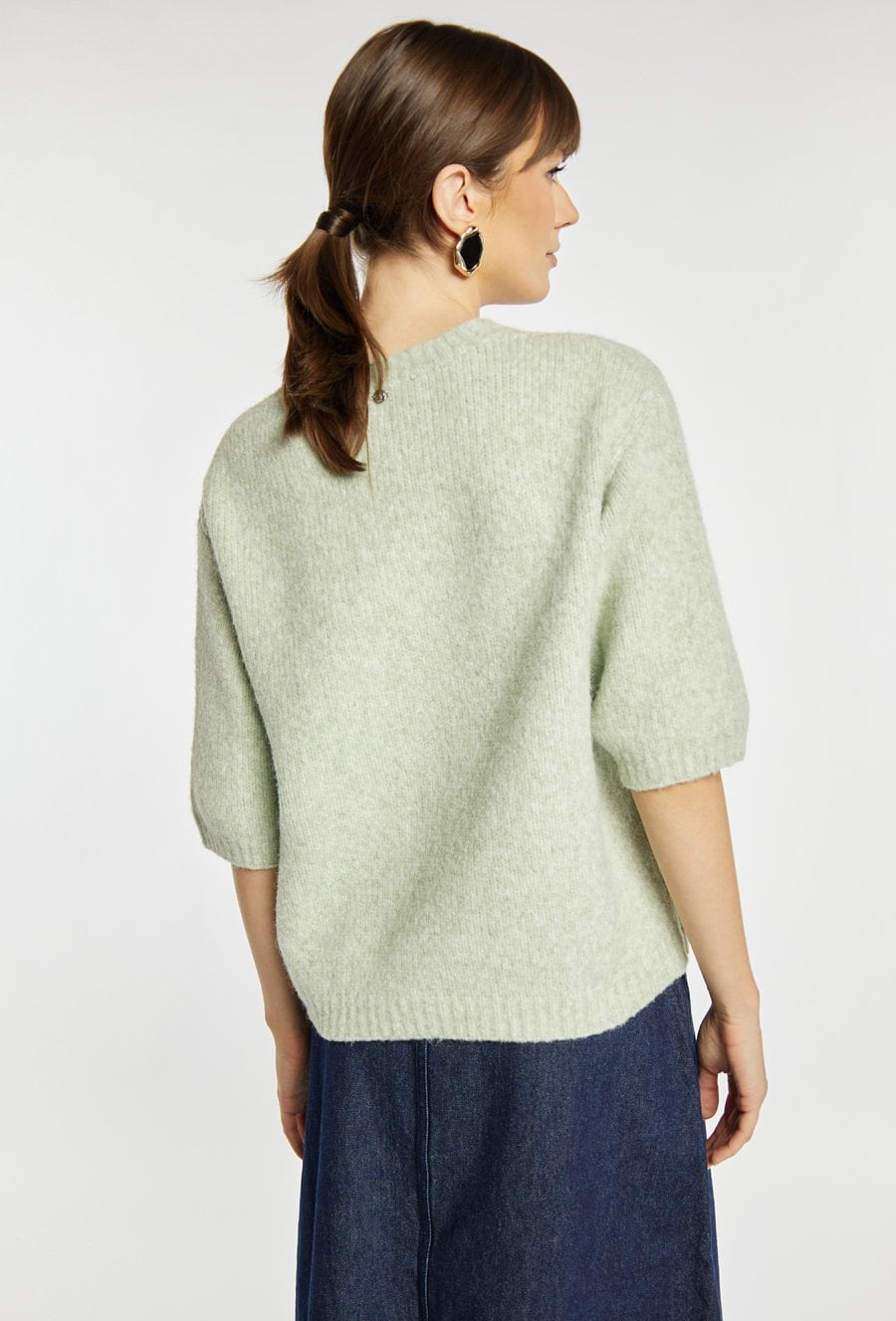 Sweter damski o miękkiej, przyjemnej w dotyku fakturze w jasnym, pastelowym odcieniu. Sweter ma krótkie, lekko bufiaste rękawy oraz klasyczny, okrągły dekolt. Sweter świetnie sprawdzi się w codziennych stylizacjach, dodając im lekkości i subtelnej elegancji. Modelka na zdjęciu ma 177 cm wzrostu i prezentuje rozmiar S.