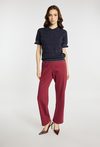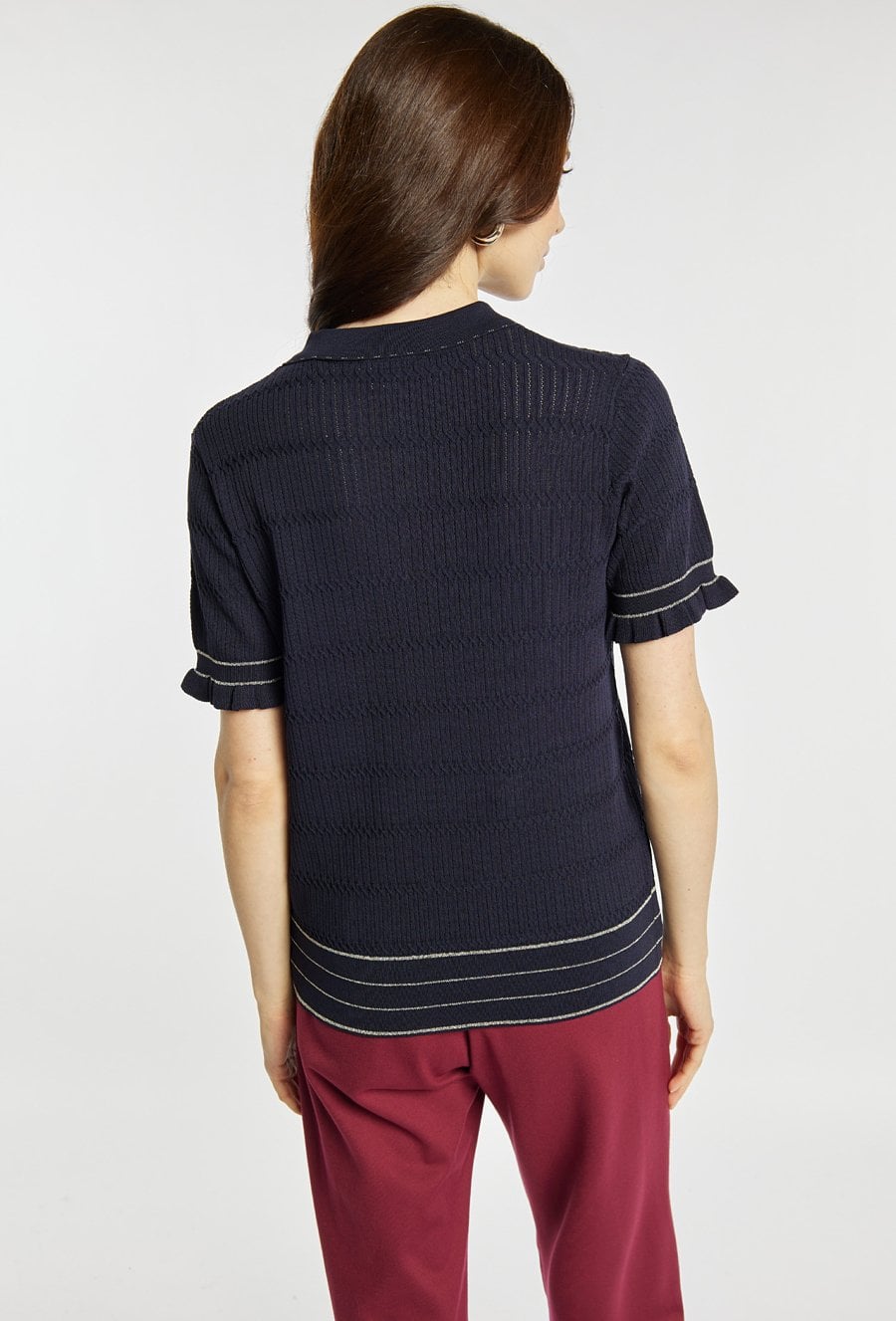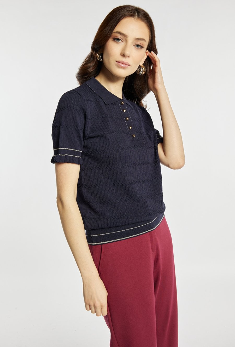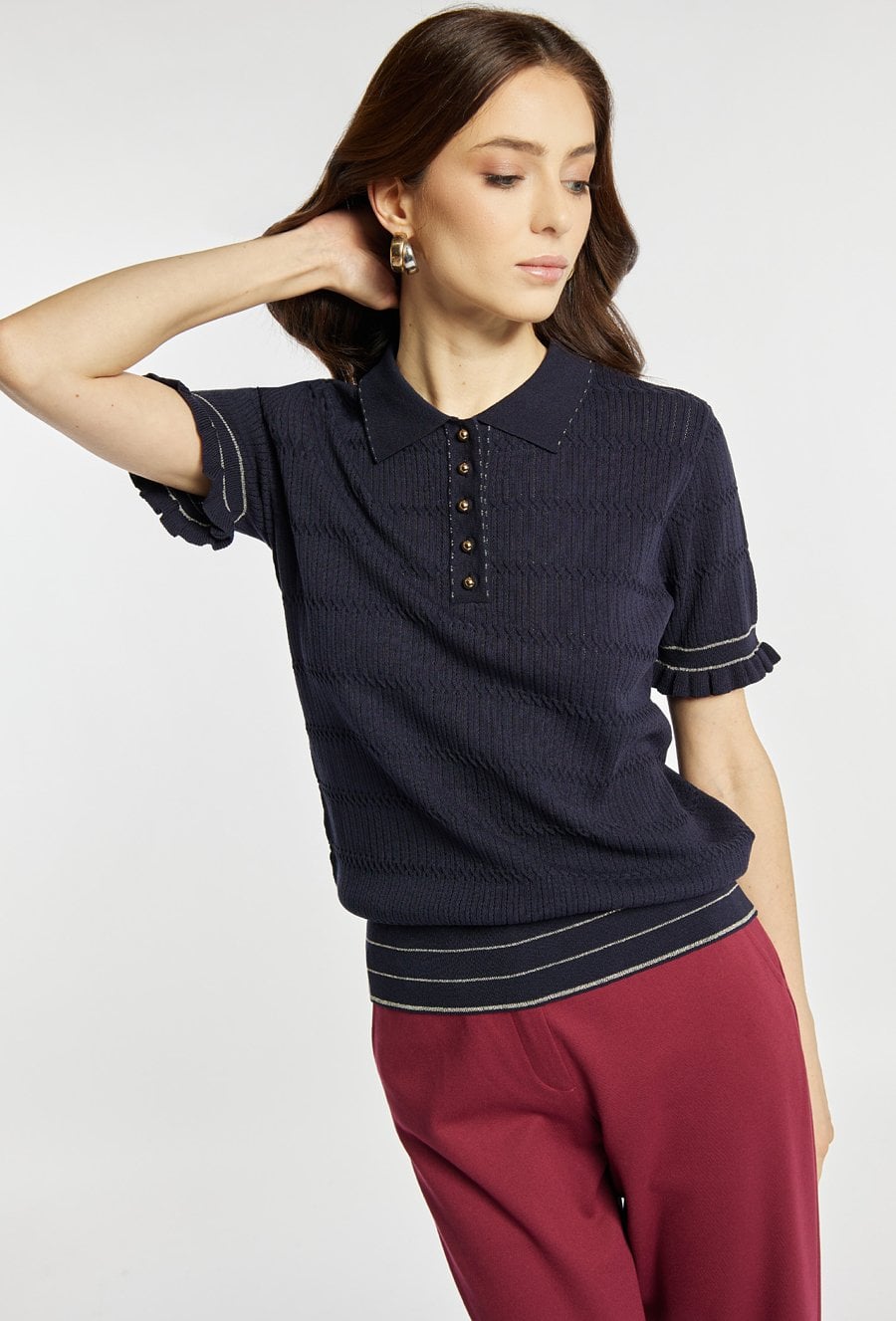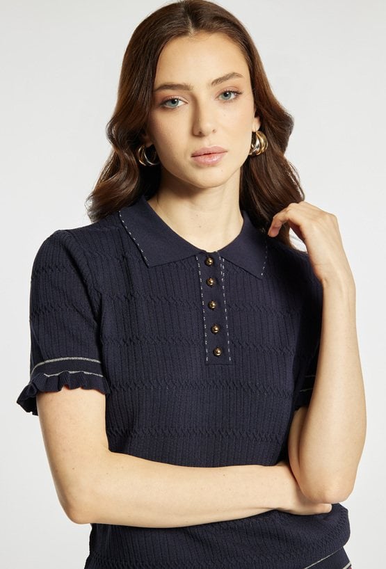 Sweter damski wykonany z miękkiego, delikatnie ażurowego materiału. Sweter z krótkim rękawem i kontrastowym kołnierzykiem polo wyróżnia się ozdobną listwą z guzikami oraz subtelną falbanką przy rękawach, które dodają mu dziewczęcego uroku. Model idealny na co dzień oraz do eleganckich, wiosennych stylizacji. Modelka na zdjęciu ma 177 cm wzrostu i prezentuje rozmiar S.