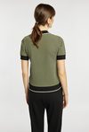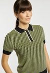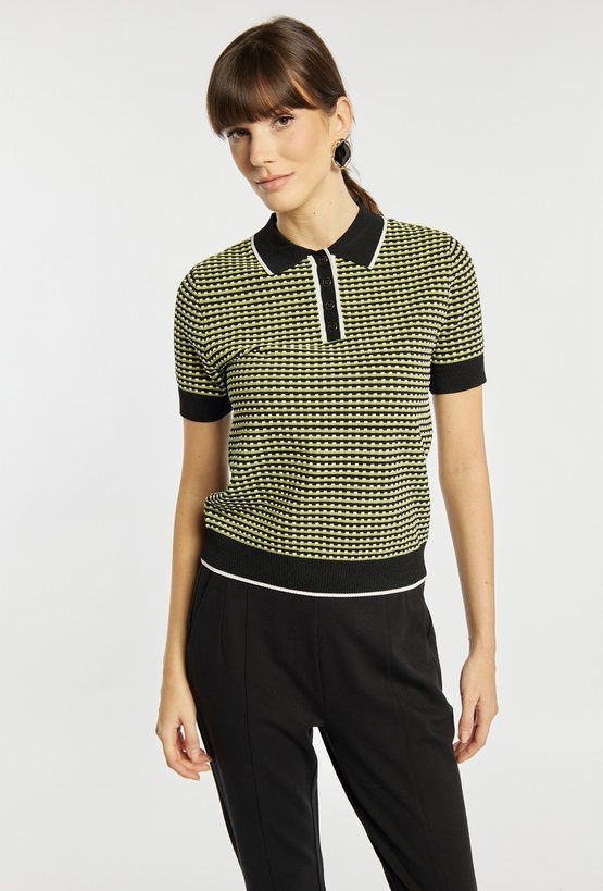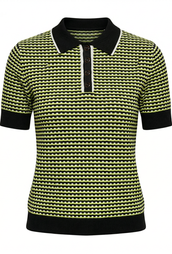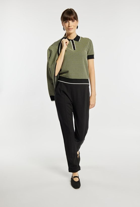 Sweter damski o dopasowanym fasonie z krótkim rękawem i kołnierzykiem. Sweter wyróżnia się drobnym, regularnym wzorem oraz kontrastowymi wykończeniami przy kołnierzu, rękawach i u dołu. Sweter świetnie sprawdzi się w codziennych stylizacjach – polecamy zestawić go z pasującymi spodniami i swetrem z tej samej kolekcji, aby stworzyć spójny, modny komplet. Kod do spodni: 26W-TRU0310 i swetra: 26W-SWE0050. Modelka na zdjęciu ma 177 cm wzrostu i prezentuje rozmiar S.