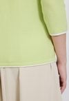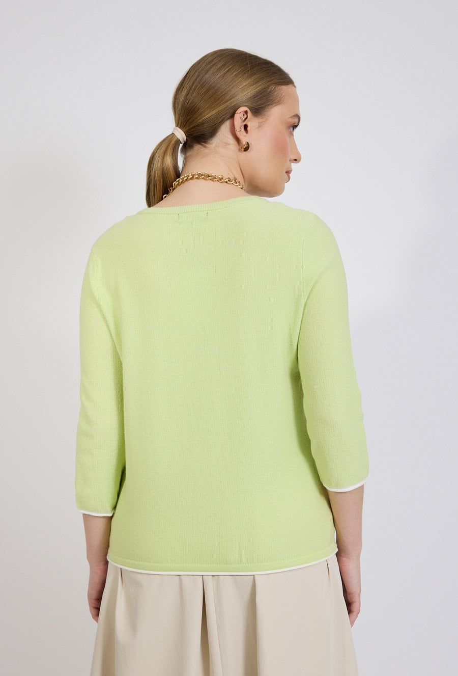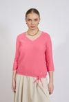Sweter damski o dopasowanym, wygodnym kroju. Model z rękawem o długości 3/4 oraz dekoltem w kształcie litery V, który subtelnie podkreśla linię szyi. Delikatna, prążkowana struktura materiału nadaje całości lekkości, a ozdobne wiązanie u dołu stanowi ciekawy, kobiecy akcent. Modelka na zdjęciu ma 177 cm wzrostu i prezentuje rozmiar S.