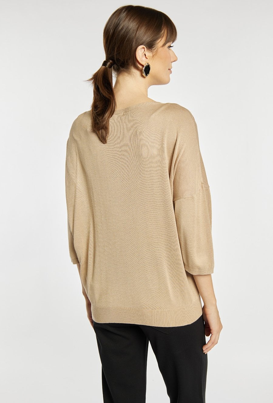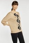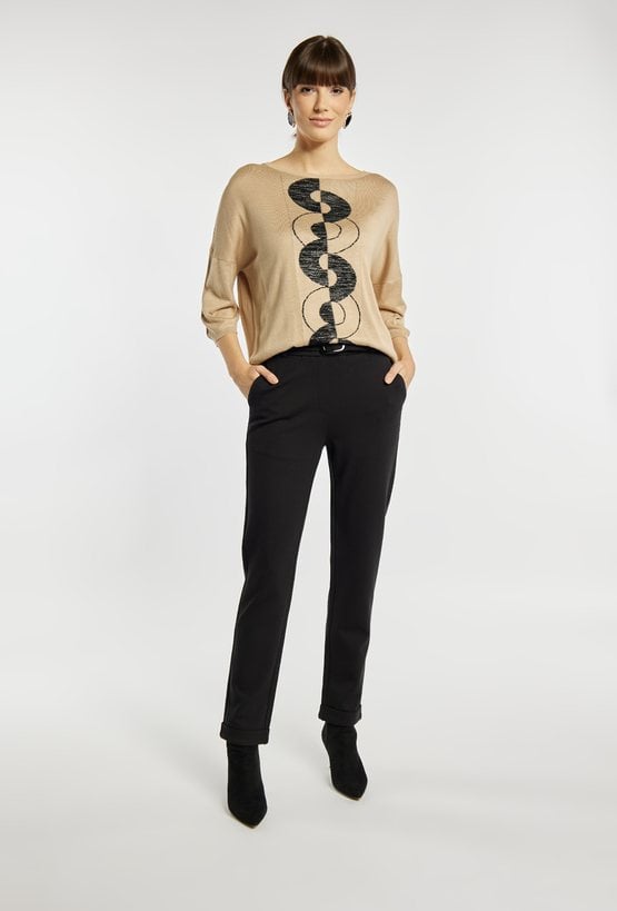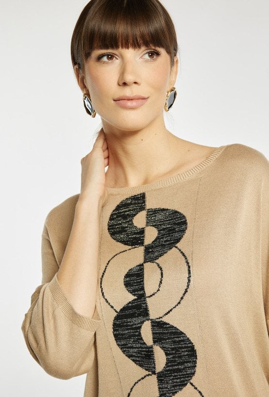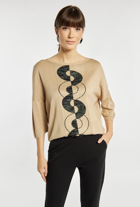 Sweter damski o swobodnym kroju i obniżonej linii ramion. Sweter ma okrągły dekolt oraz rękawy o długości 3/4. Sweter wyróżnia się dużym, dekoracyjnym motywem umieszczonym z przodu, który dodaje mu nowoczesnego charakteru. Idealny do codziennych, eleganckich stylizacji. Modelka na zdjęciu ma 177 cm wzrostu i prezentuje rozmiar S.