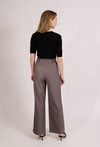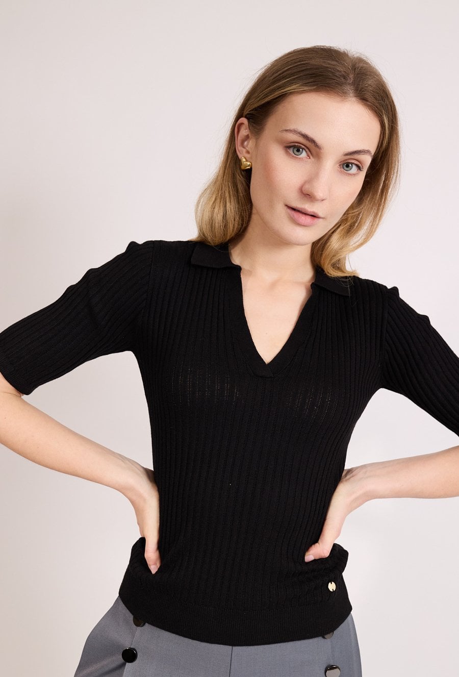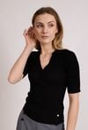 Stylowy sweter damski na krótki rękaw o dopasowanym kroju. Model z dekoltem w kształcie litery V. Sweter doskonale sprawdzi się w eleganckich i codziennych stylizacjach, na spotkania oraz do pracy. Modelka na zdjęciu ma 177 cm wzrostu i prezentuje rozmiar S.